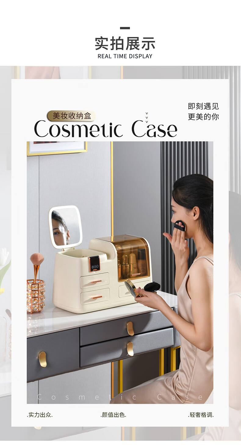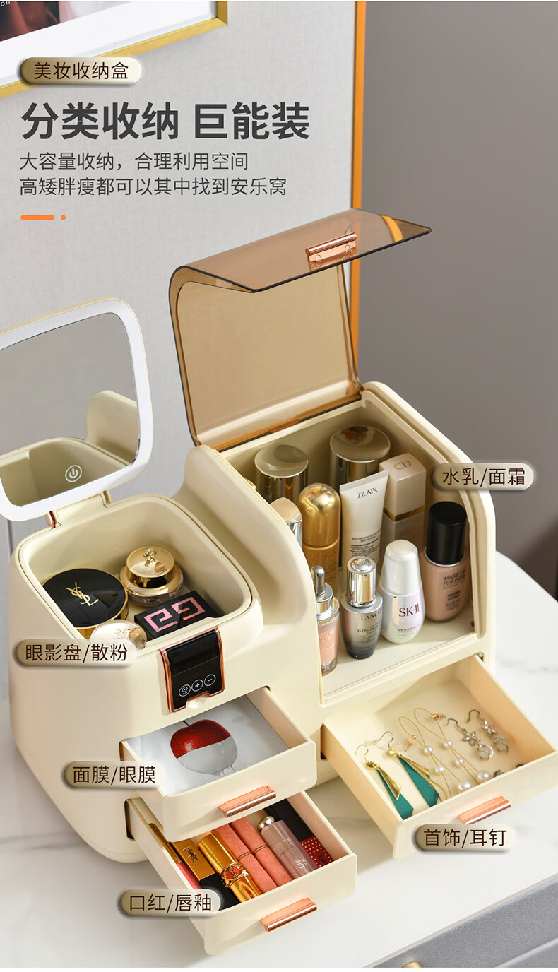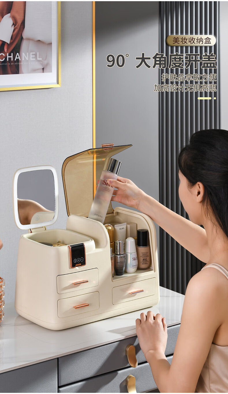 Cosmetics storage box with mirror desktop dressing table integrated storage rack dust-proof large capacity skin care product storage box model cream rice with three-color dimming + digital display