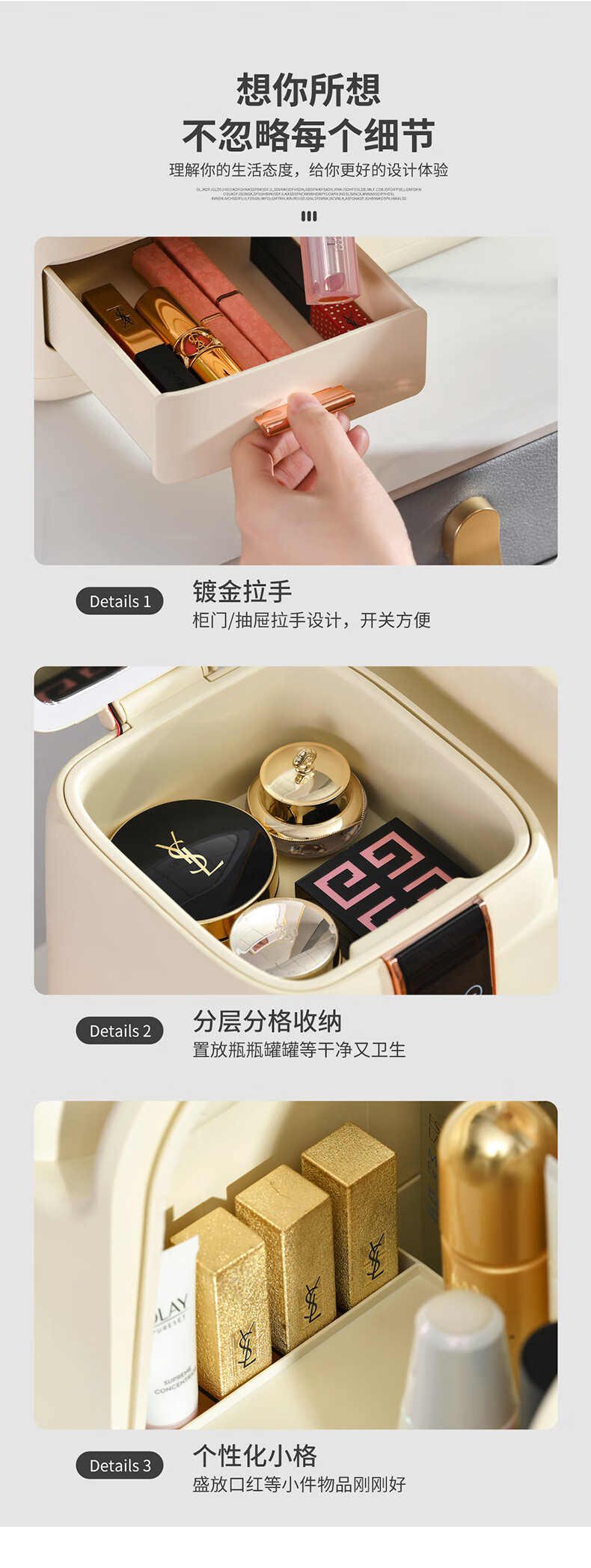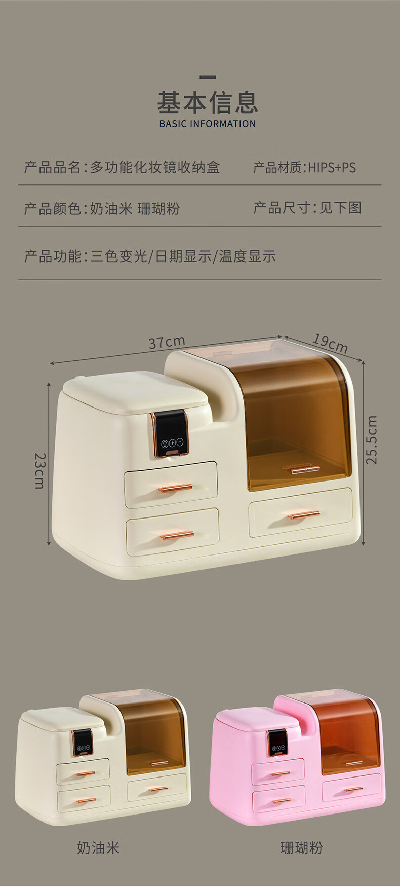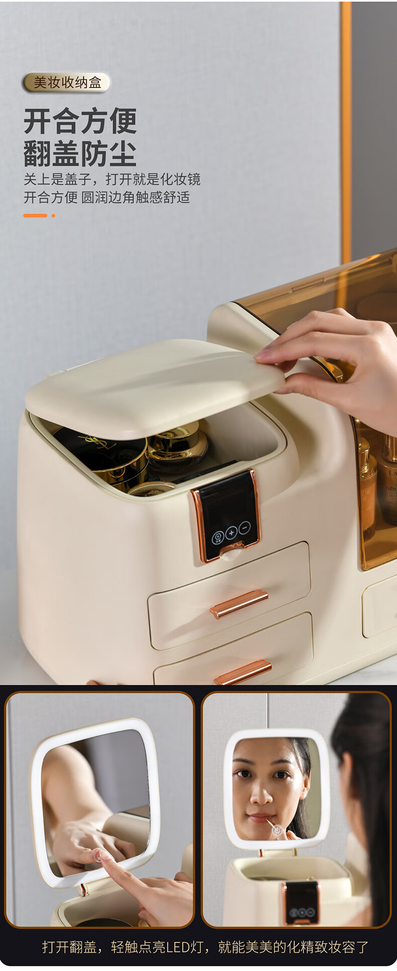 Cosmetics storage box with mirror desktop dressing table integrated storage rack dust-proof large capacity skin care product storage box model cream rice with three-color dimming + digital display