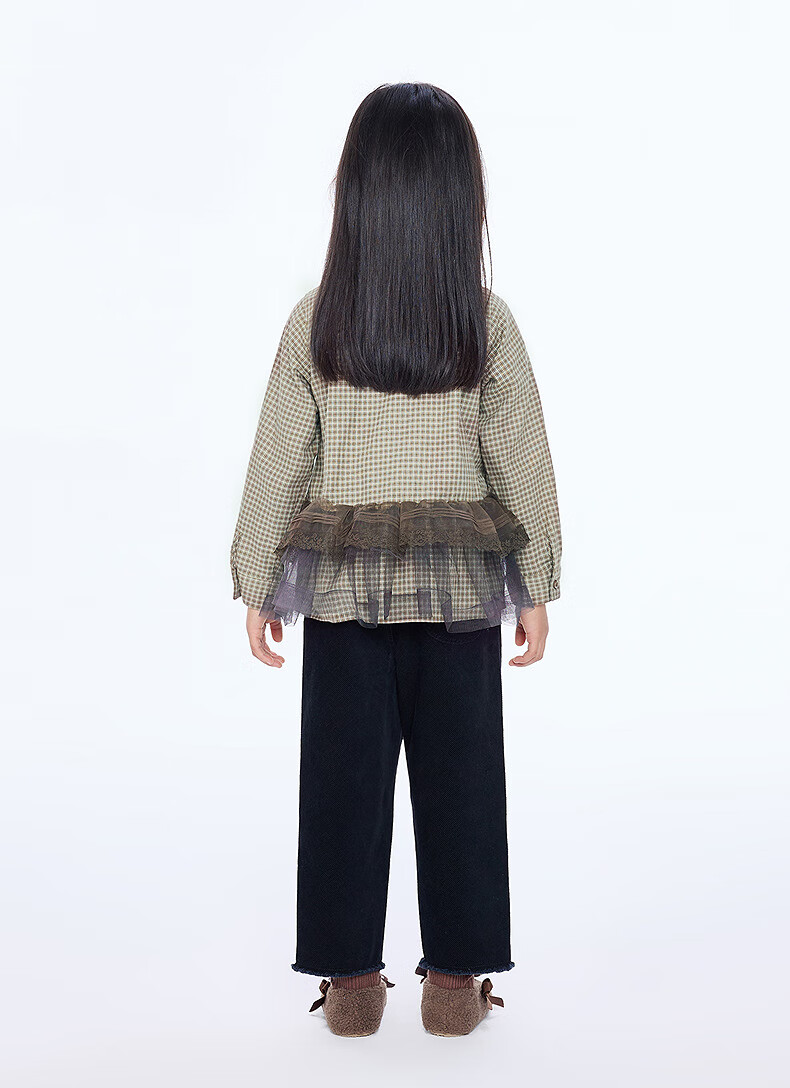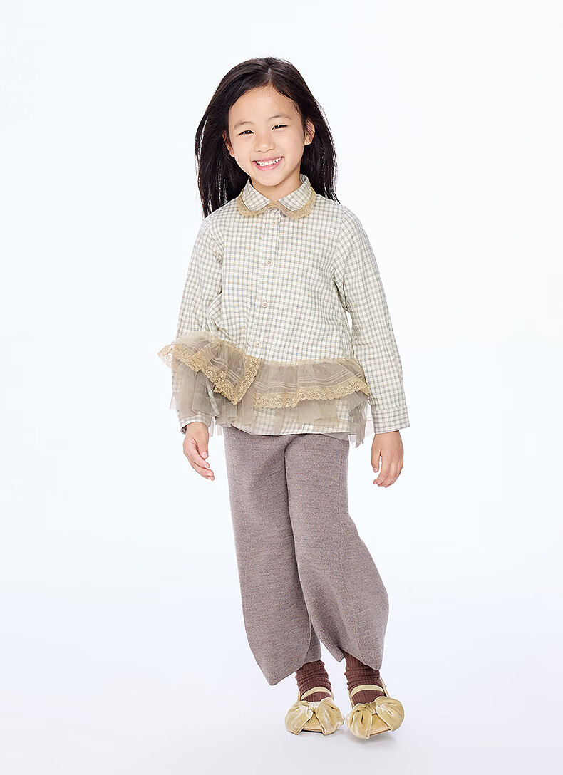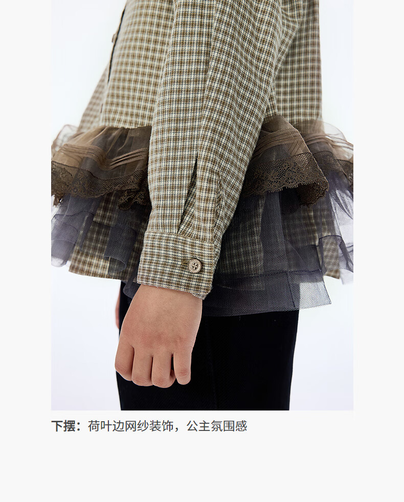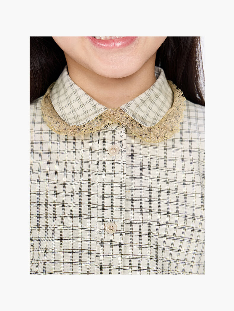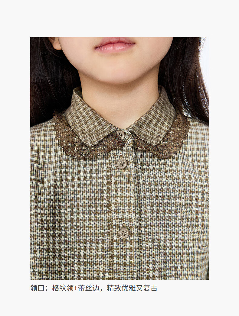 Jnby by JNBY The same style as the show, new Jiangnan Buyi children's long-sleeved shirt A-type loose 25 autumn girls 1P9212840 964/khaki coffee strip/grid 100 cm