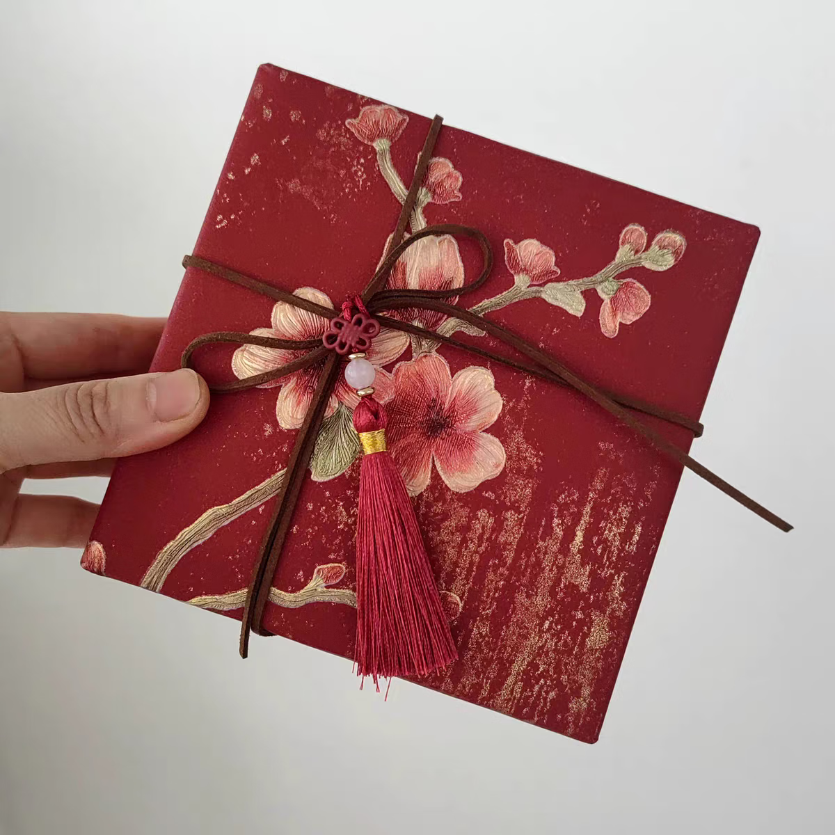 Chinese-style birthday and holiday gift wrapping paper, high-end retro large-size antique gift box, floral decorations, 2 pieces of Luoshen red paper + 10m leather cord + 1 random tassel
