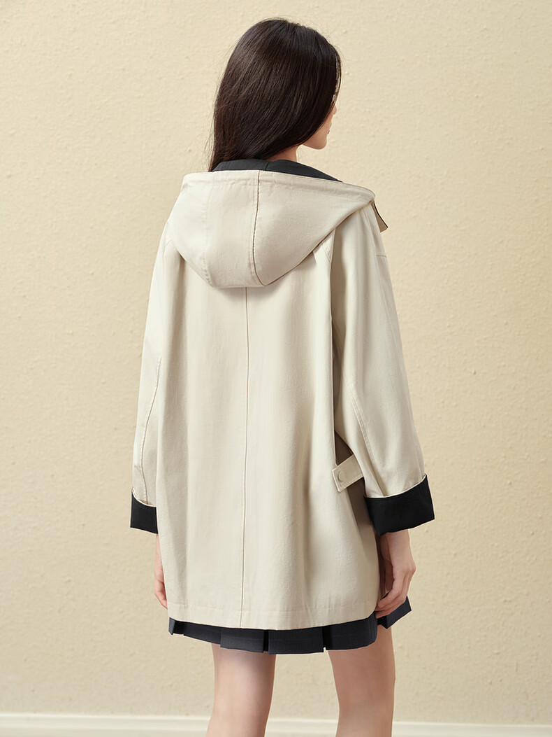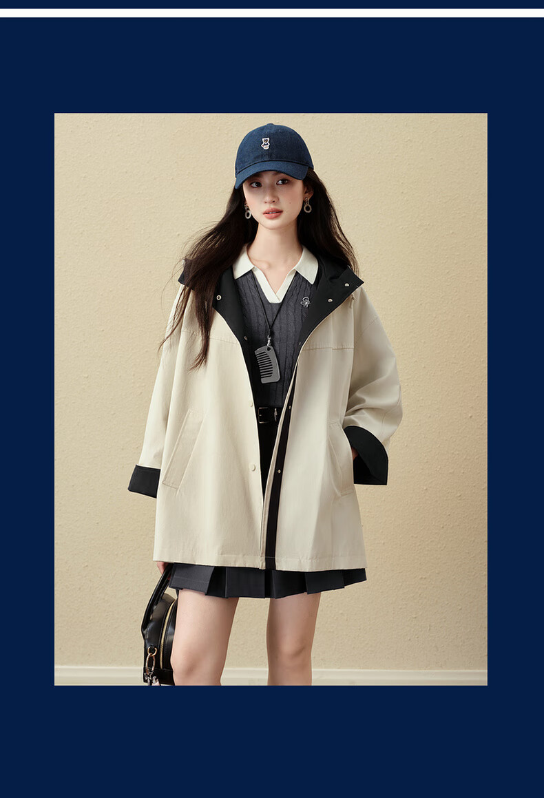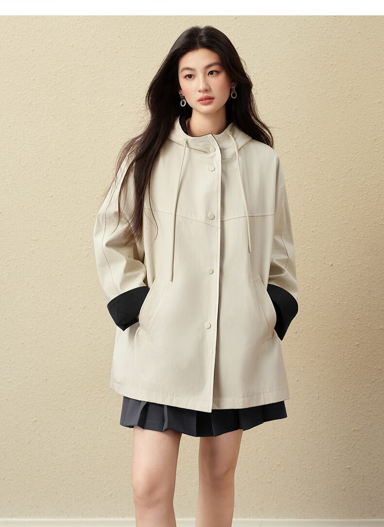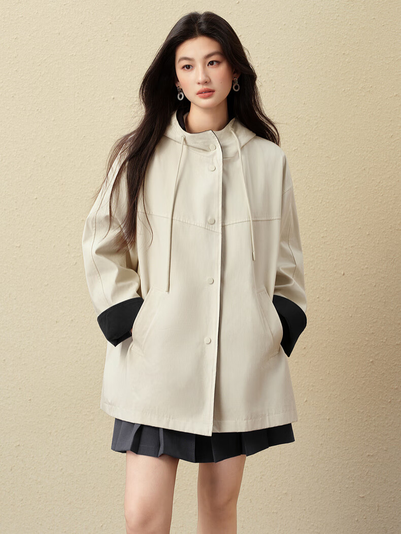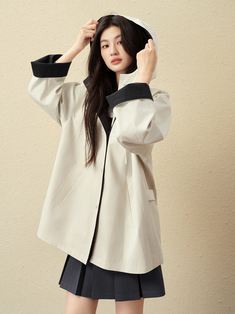 SEIFINI Classic Miu Contrast Color Hooded Windbreaker 2025 Autumn New Korean Style Loose Casual Jacket Beige M