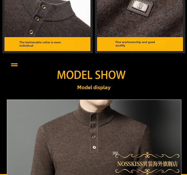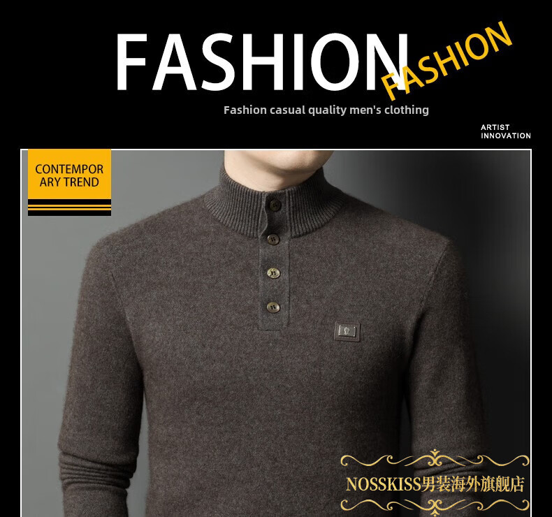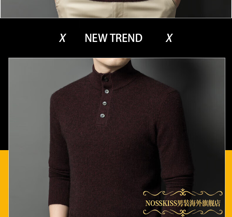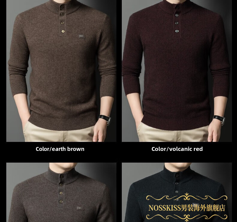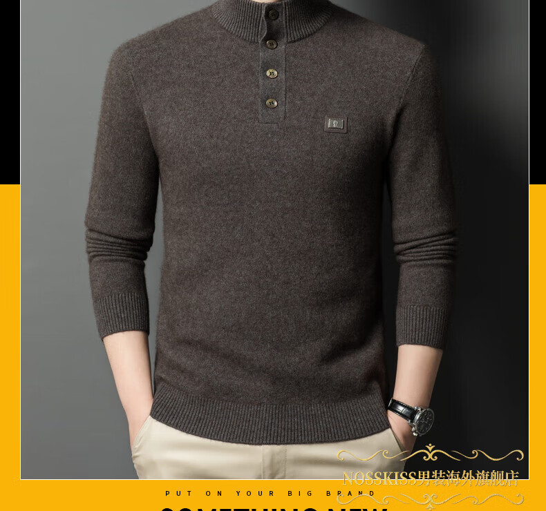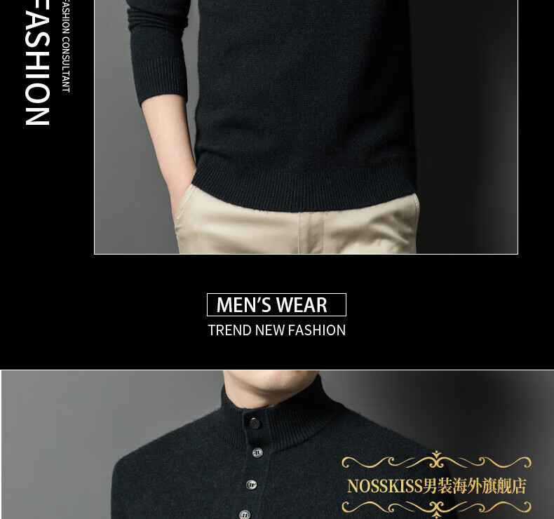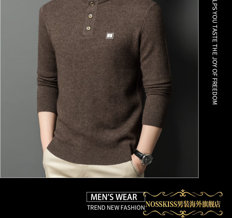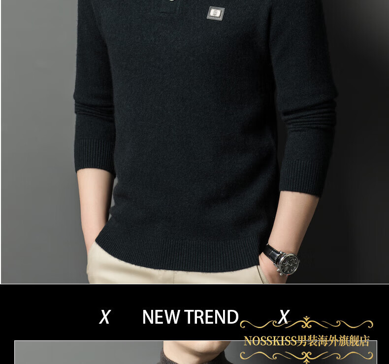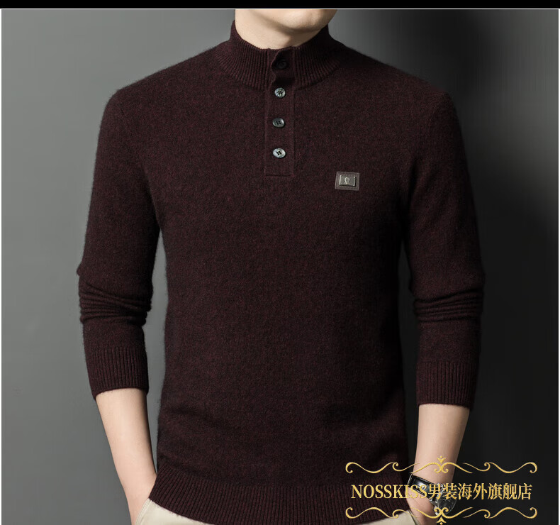 NOSSKISS国际高档品牌立领纯羊毛衫男秋冬季半高领有扣开领中青年针织衫 深墨蓝色 均码 175/L[适合135-150斤]