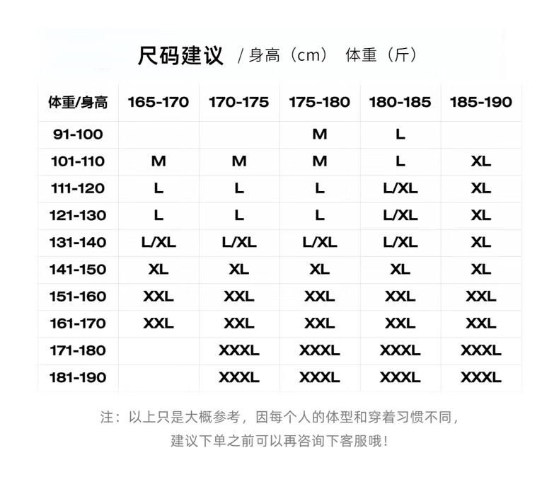 China (cm) 160-165/84-86 165-170 / 88-90 167-172 / 92-96 168-173 / 98-102 170-176 / 106-110