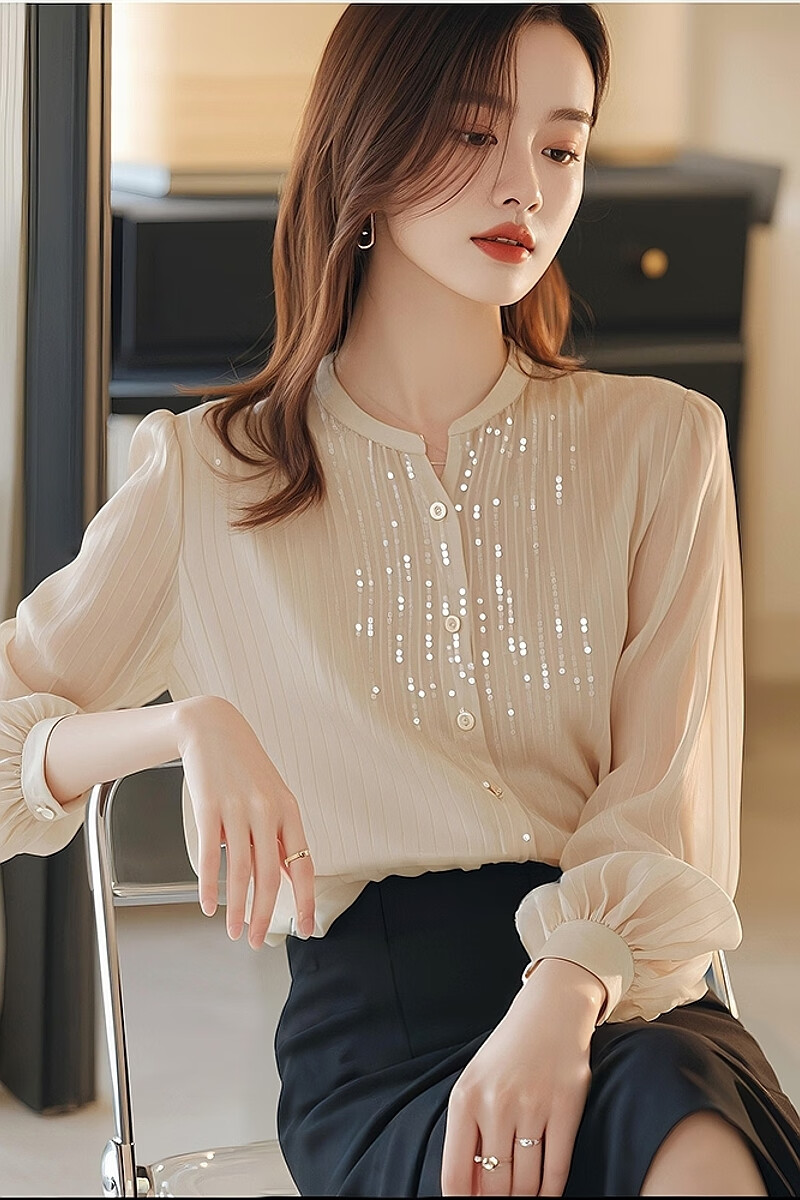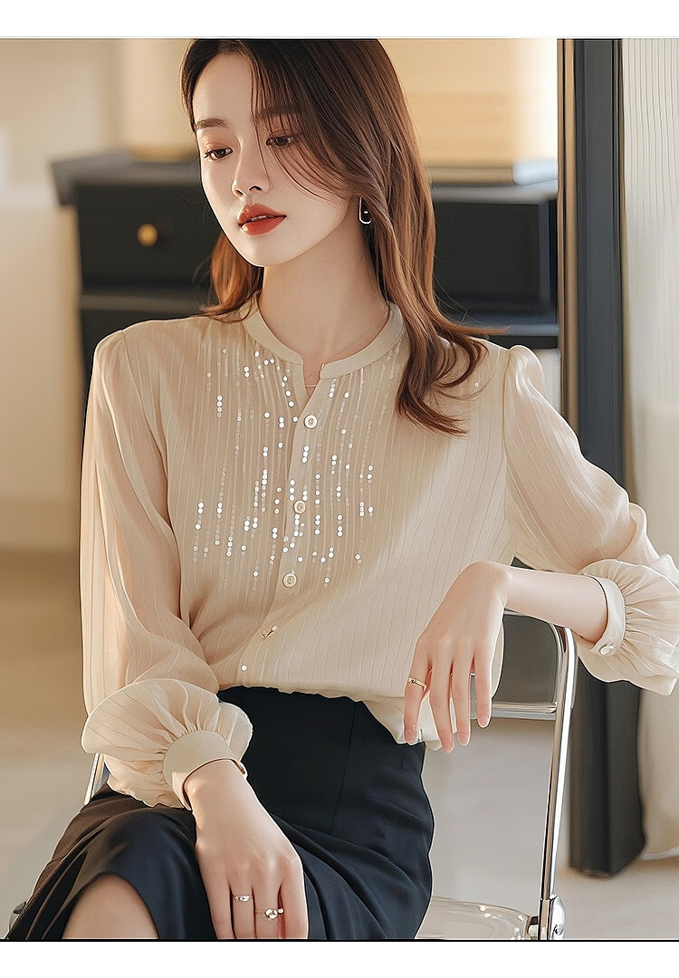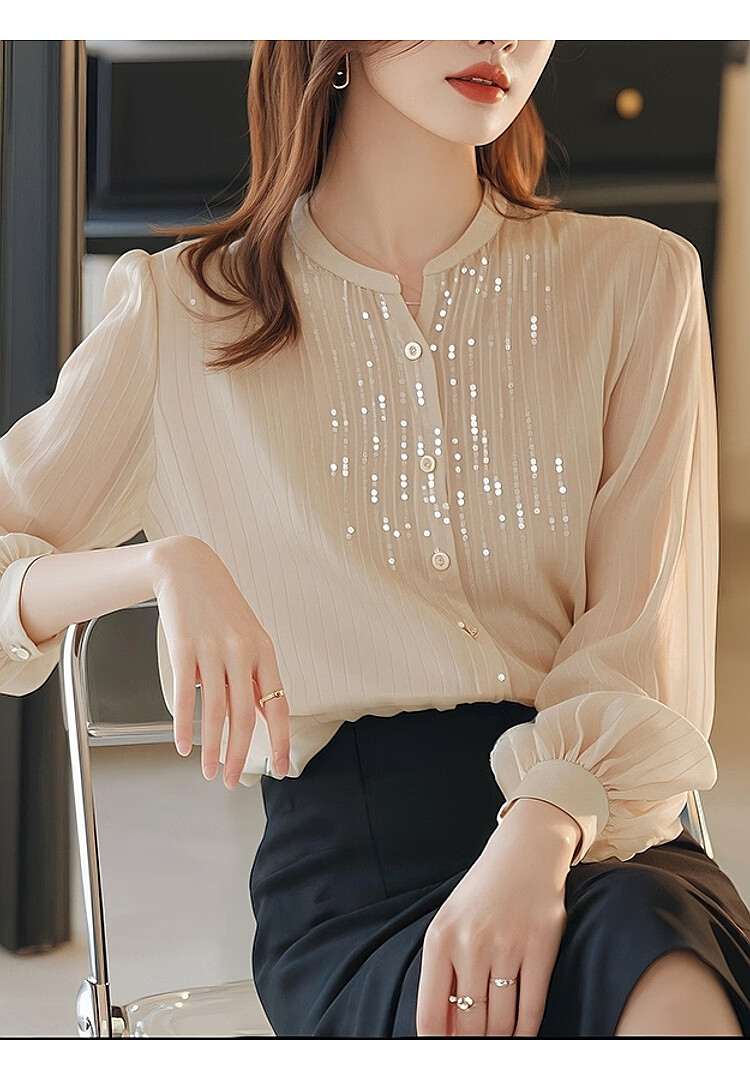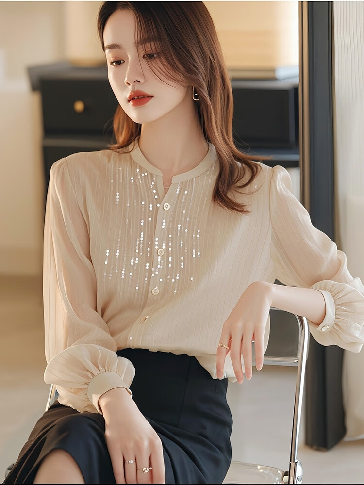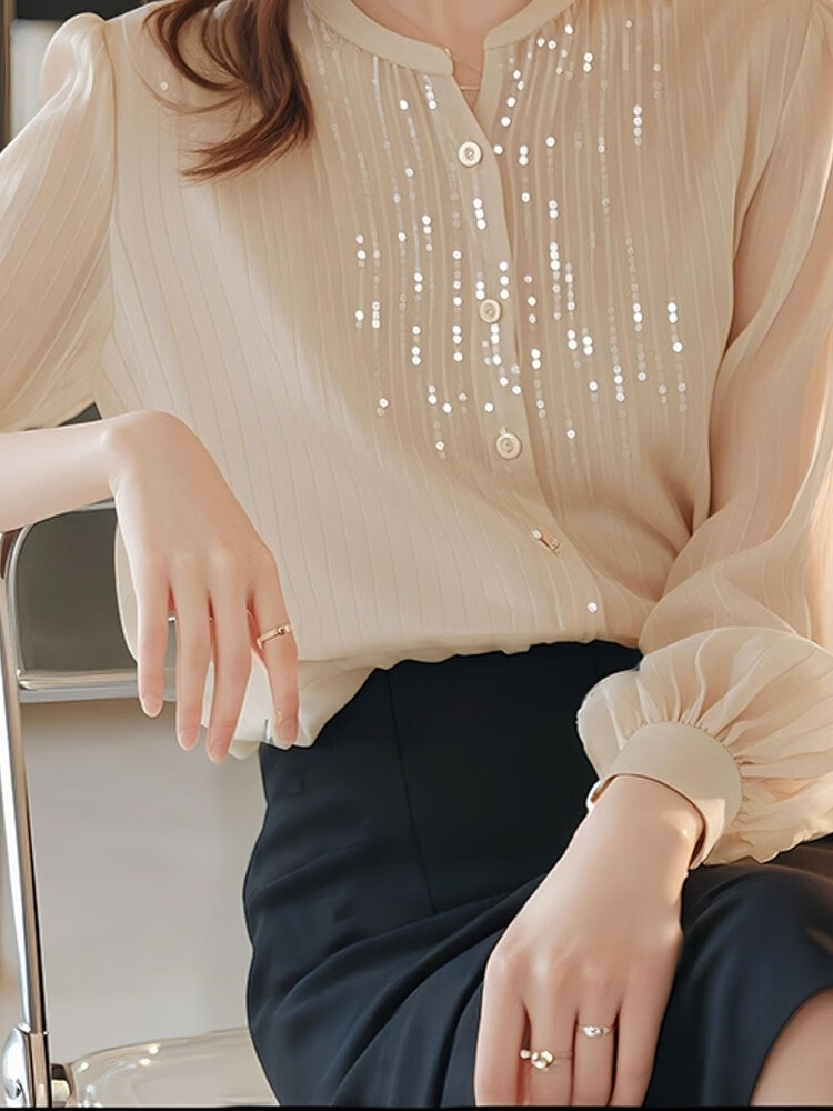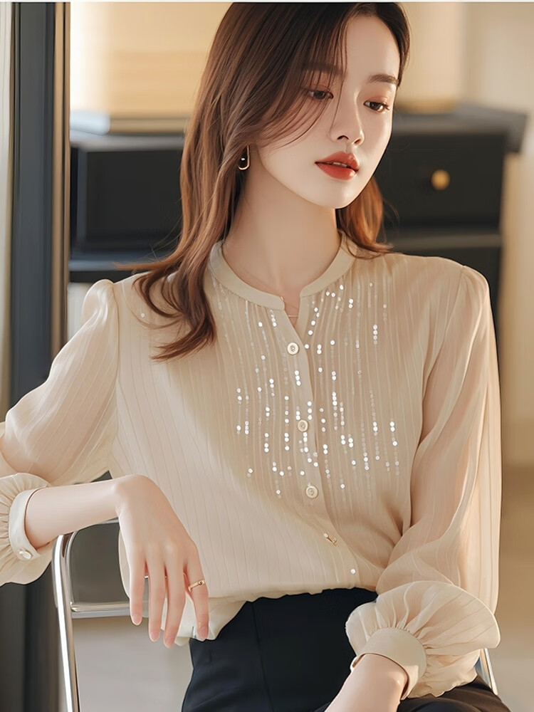 Pierre Cardin top chiffon shirt small shirt sequined spring and autumn women's clothing counter 2025 new long-sleeved cut label high-end bottoming beige shirt counter Western temperament S
