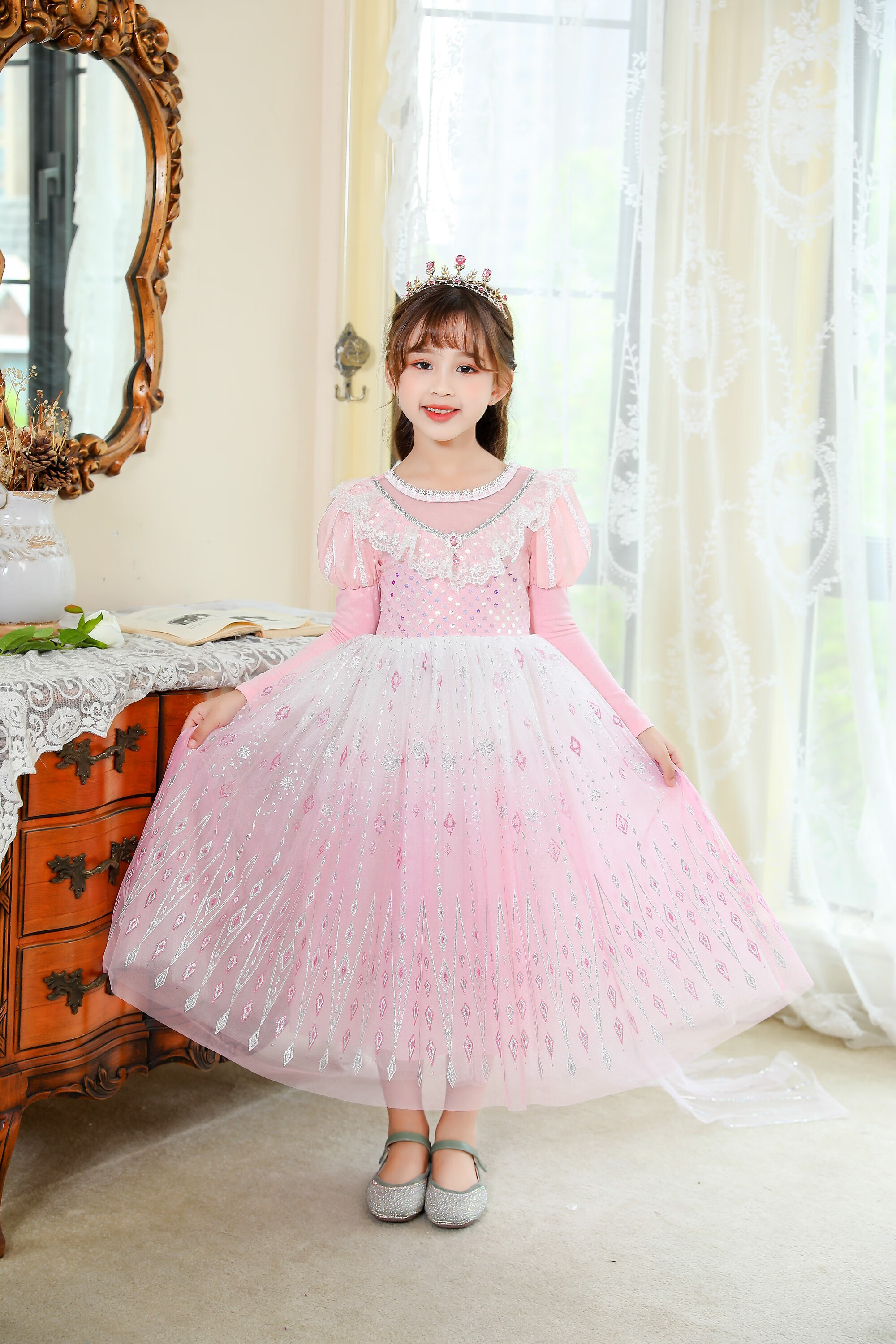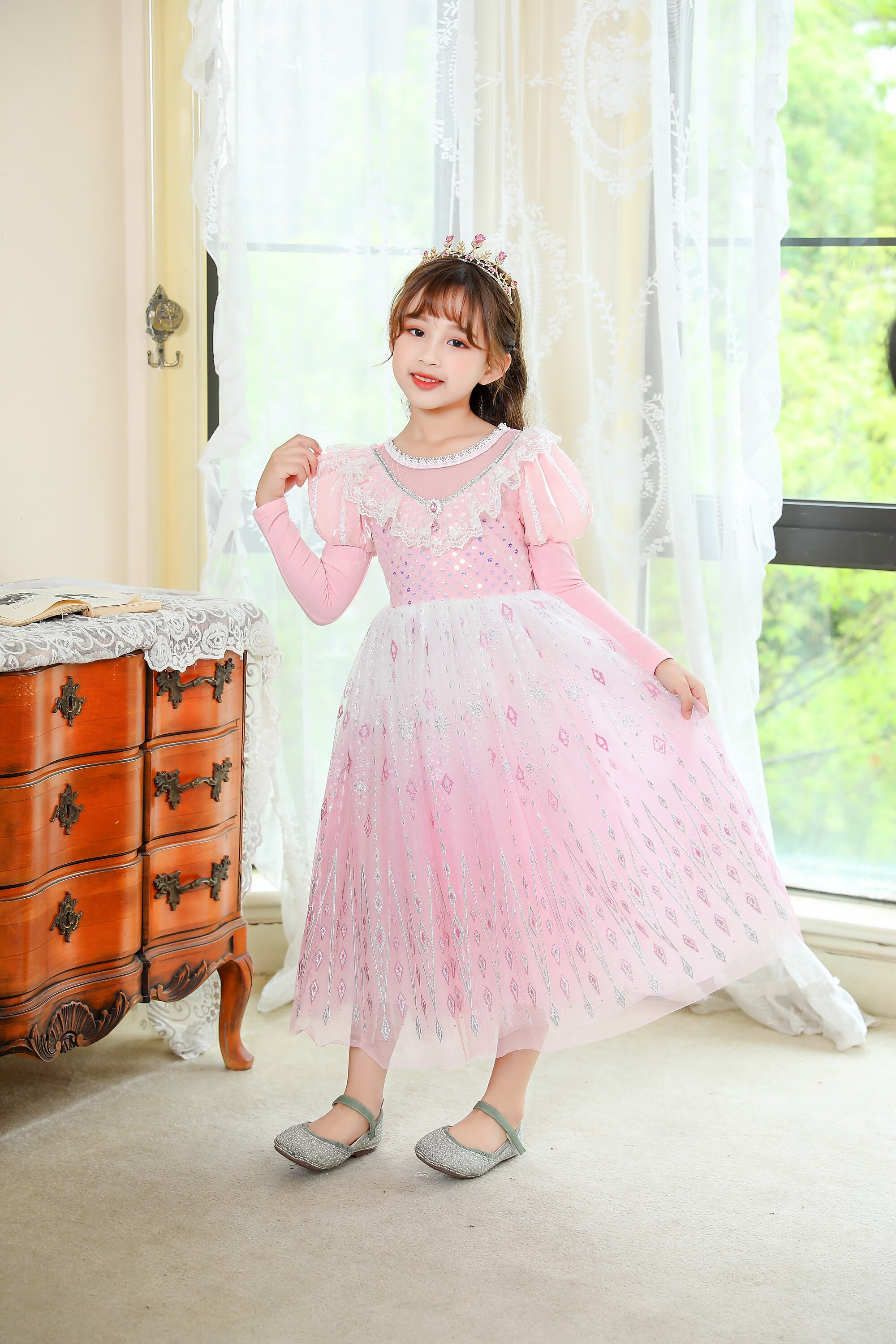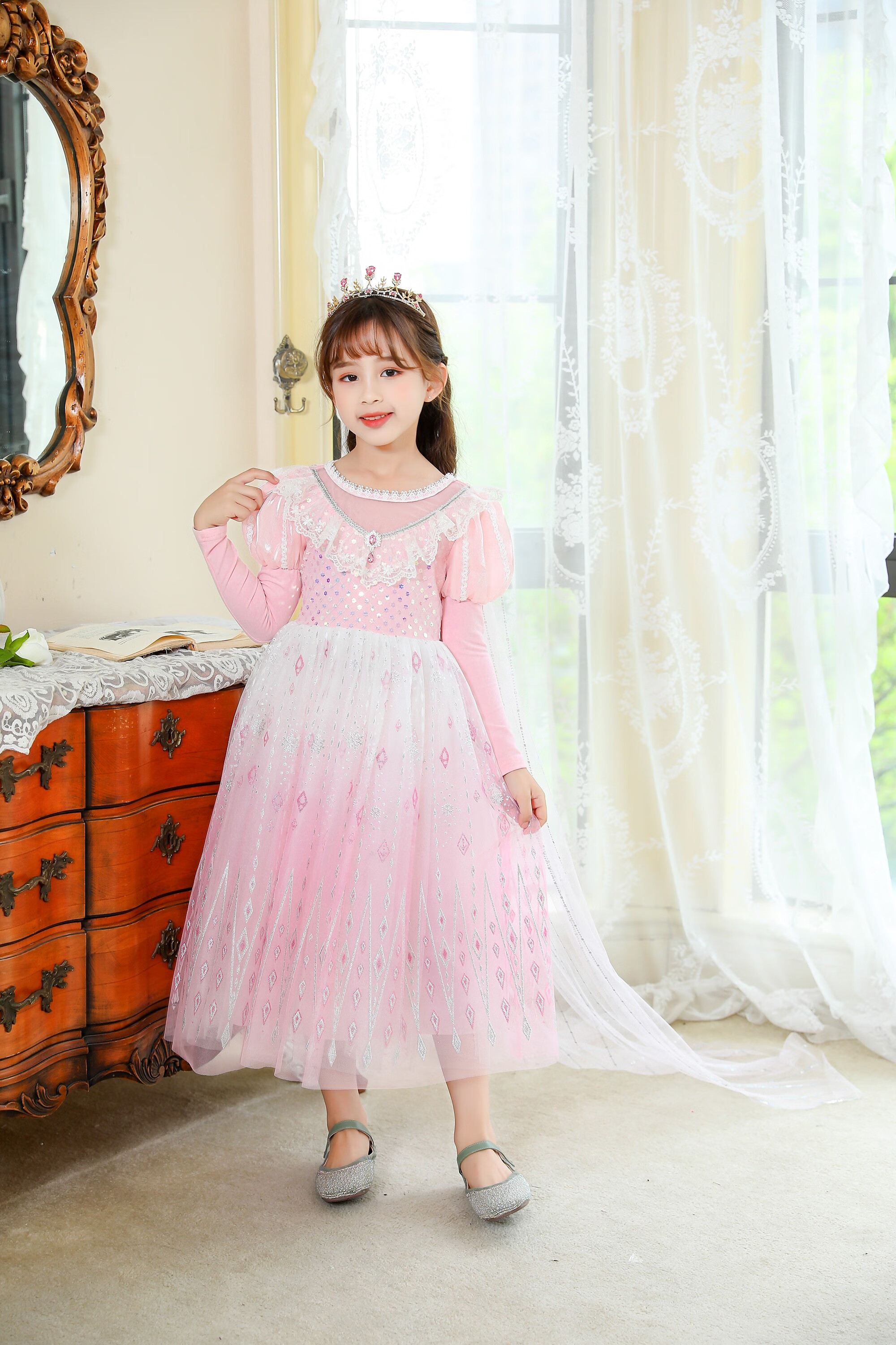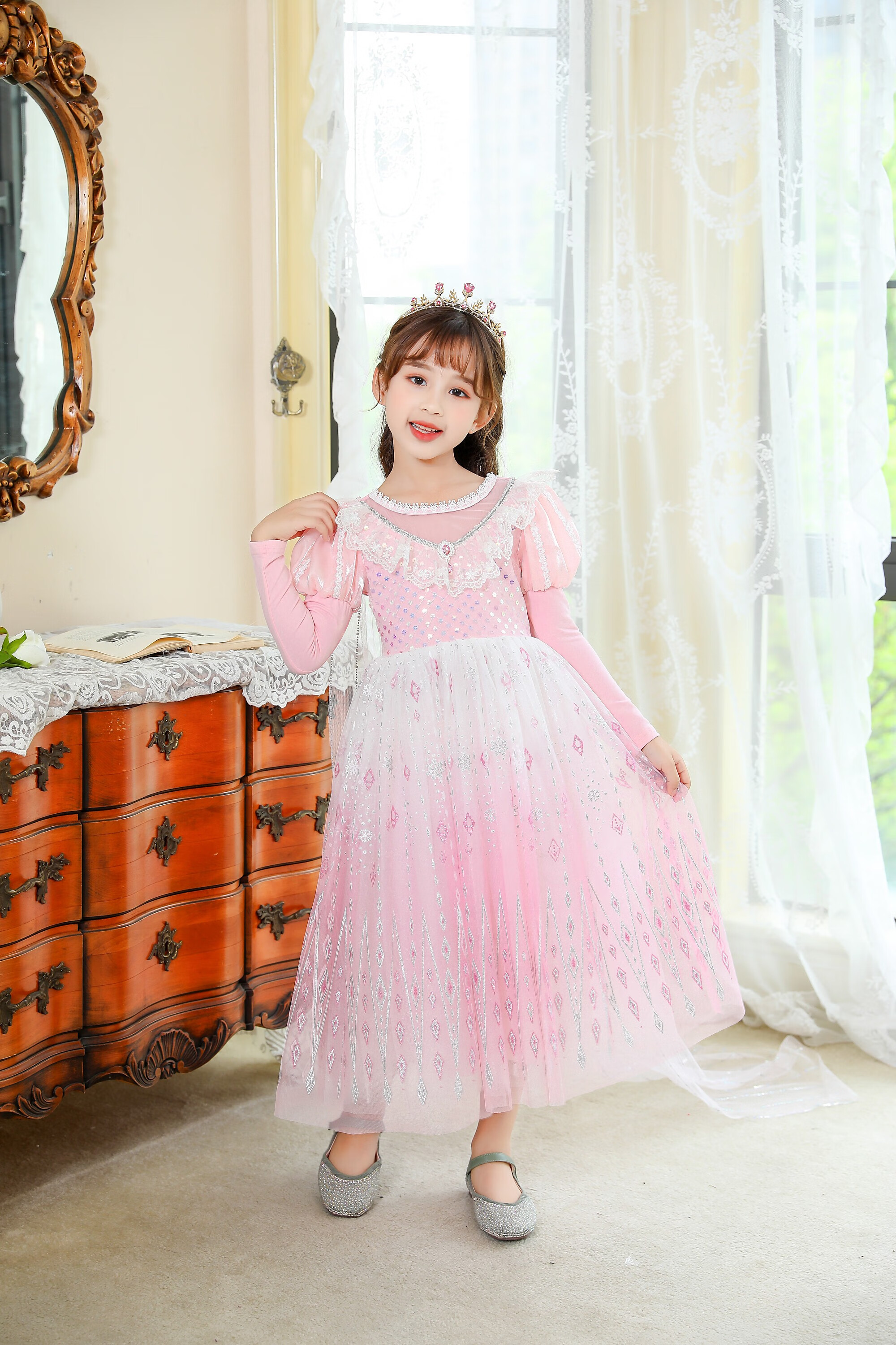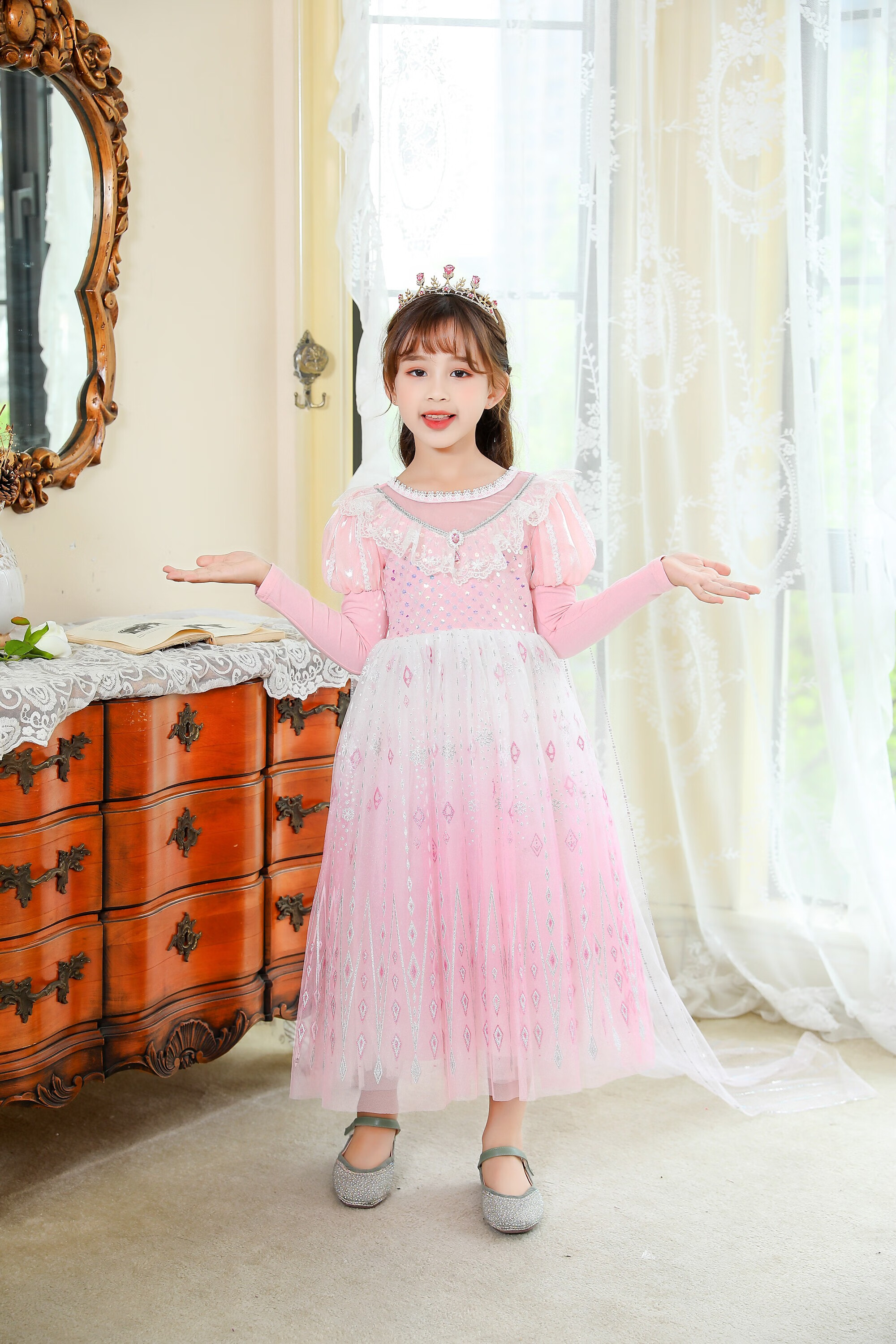 Girls long-sleeved dress spring and autumn Korean style ice and snow dress new Princess Elsa children's performance costume party forest style long-sleeved dress with bow veil 110