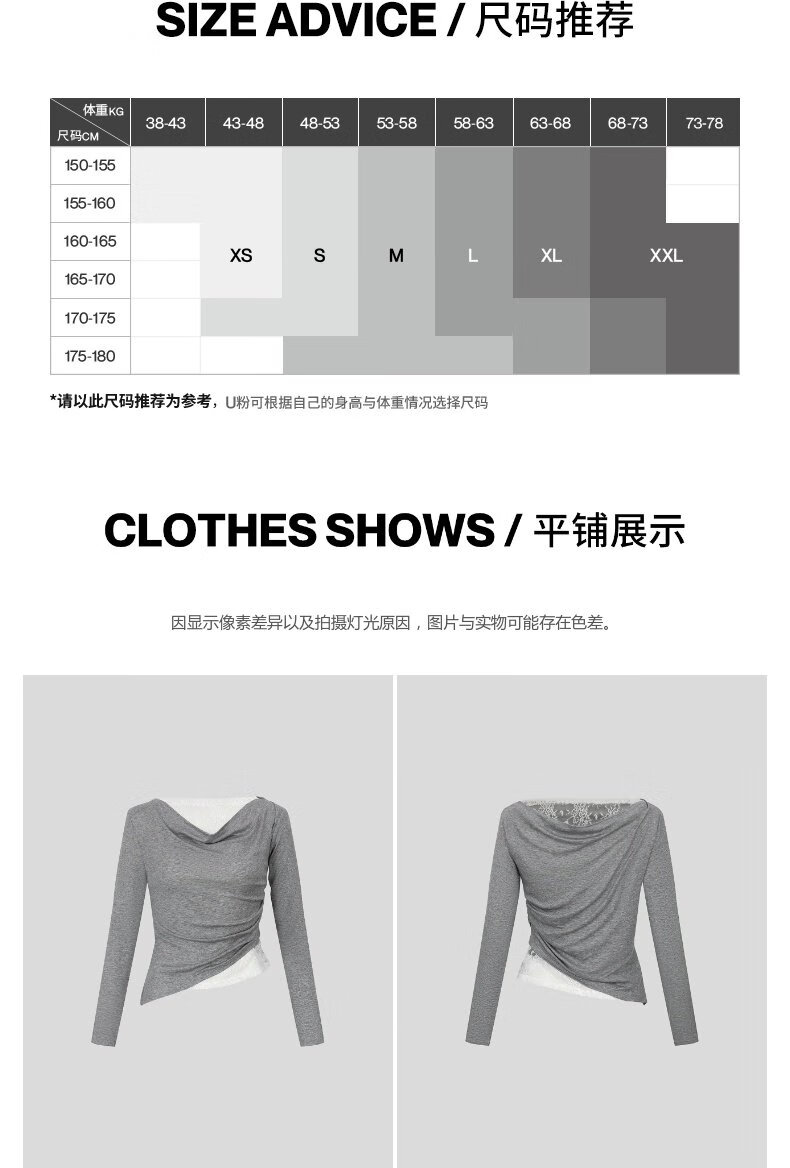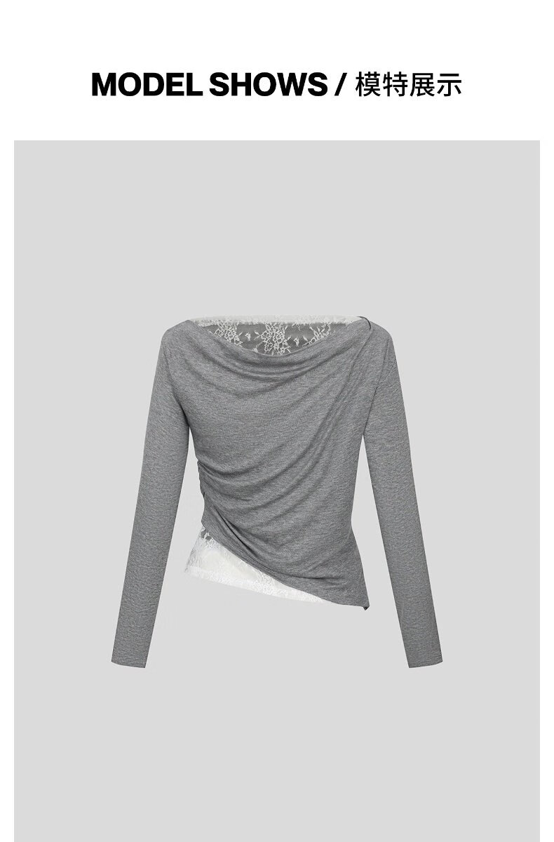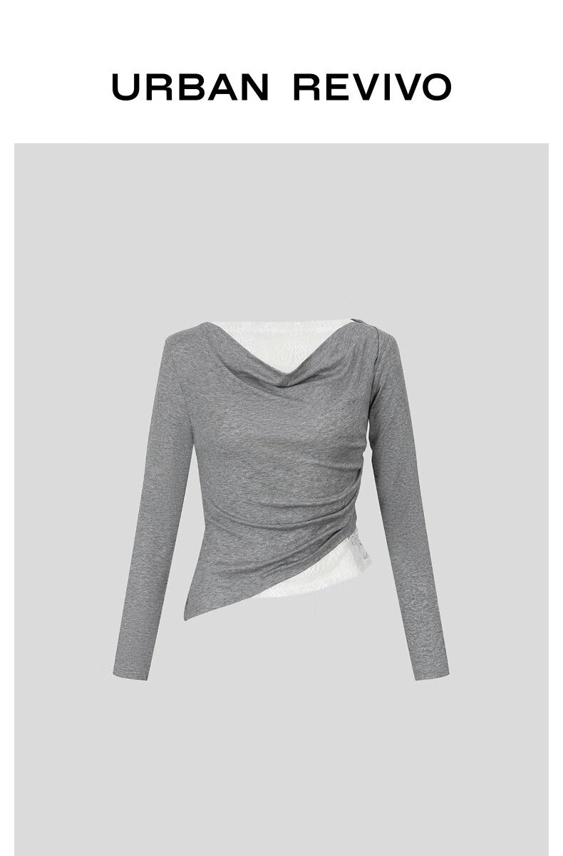 UR2026 spring new women's holiday pleated stitching lace one-shoulder long-sleeved T-shirt UWJ450159 floral gray (fabric slightly see-through) S