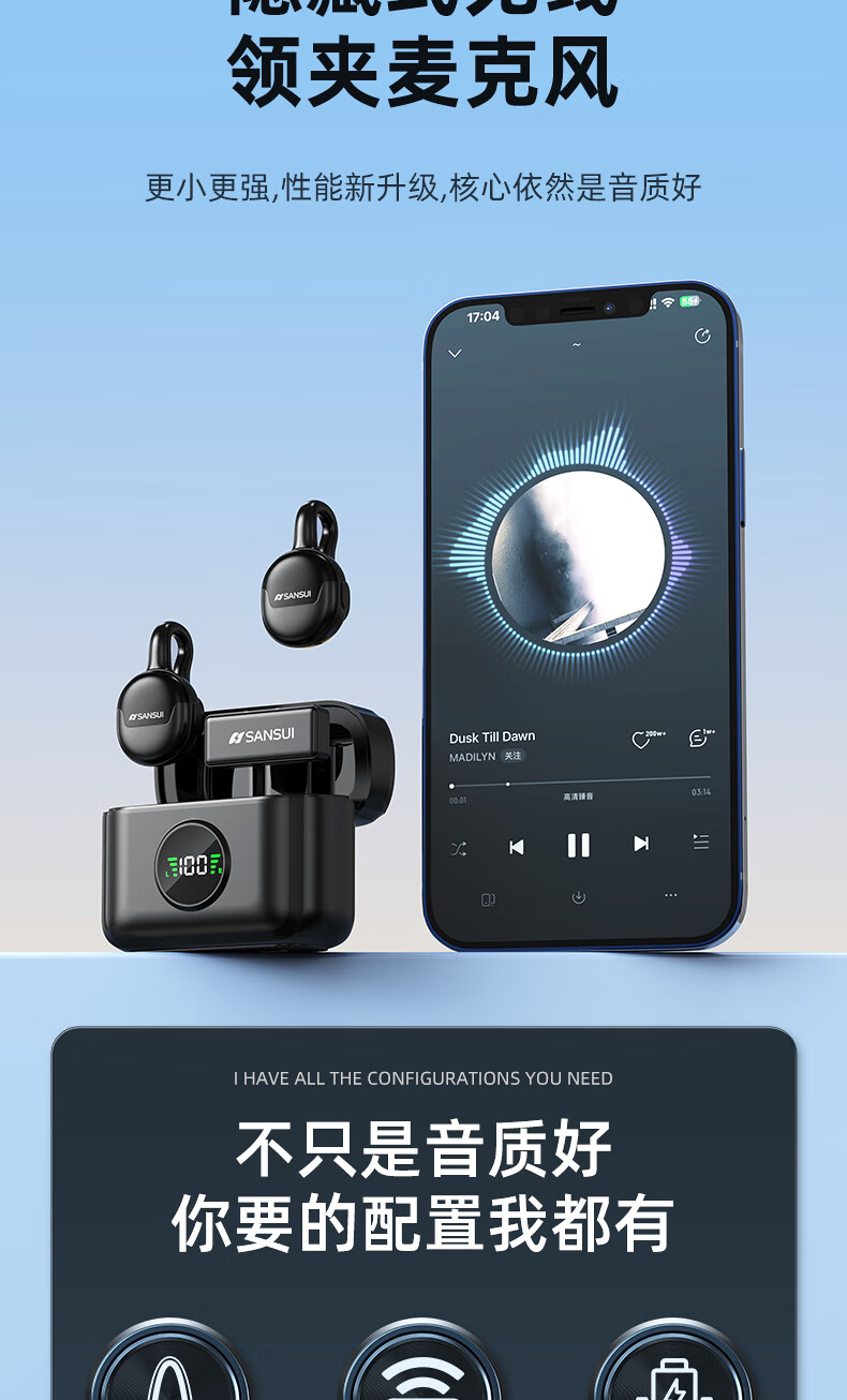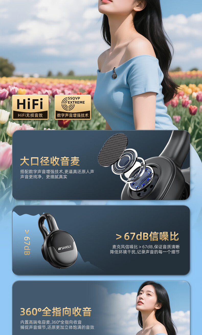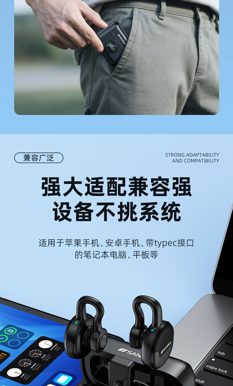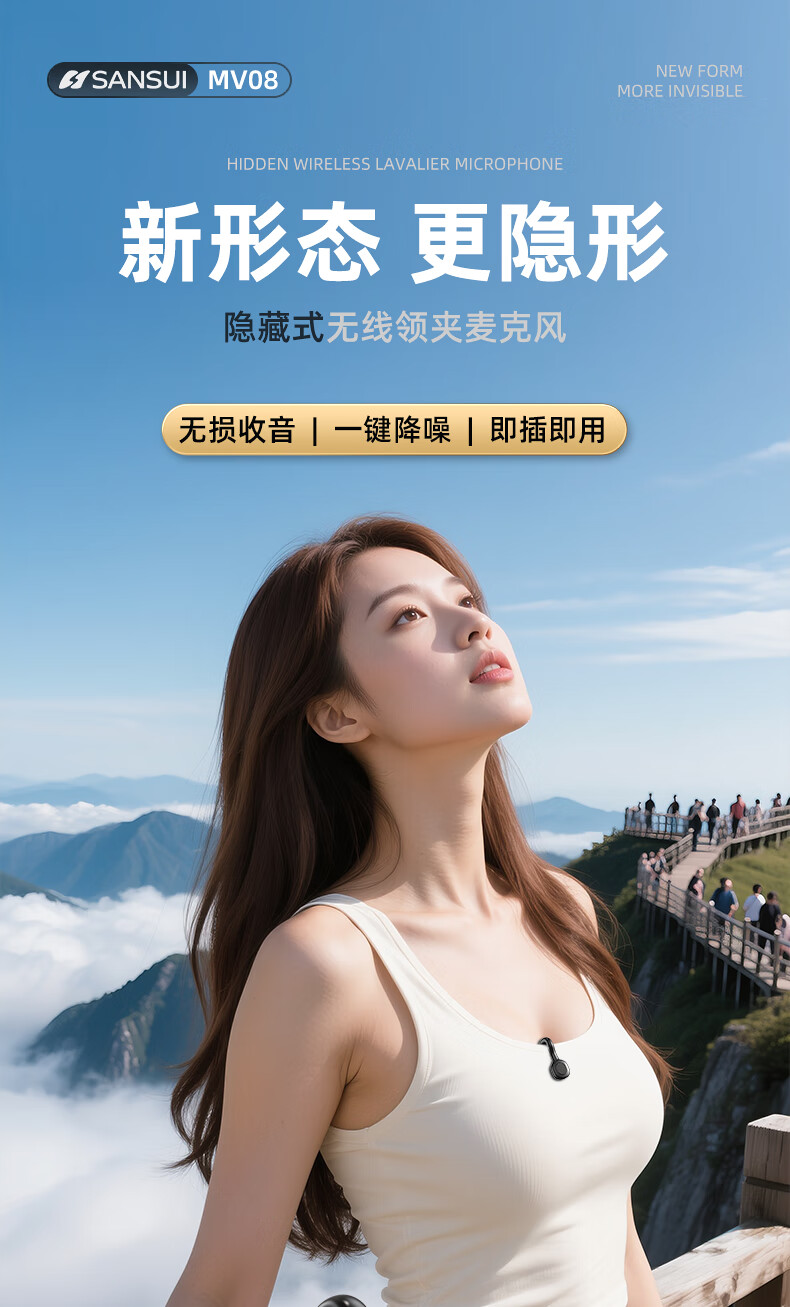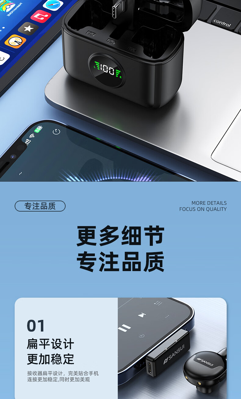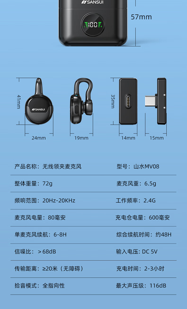 SANSUI MV08 Wireless Lavalier Microphone for Live Singing, Noise Reduction, Card for Sound Modification, Douyin Short Video, Mobile Phone Camera Recording Equipment, Full Set of Radio Microphone, One to Two with Charging Compartment Version, High Definition Radio + Intelligent Noise Reduction, Special for Android Type-C