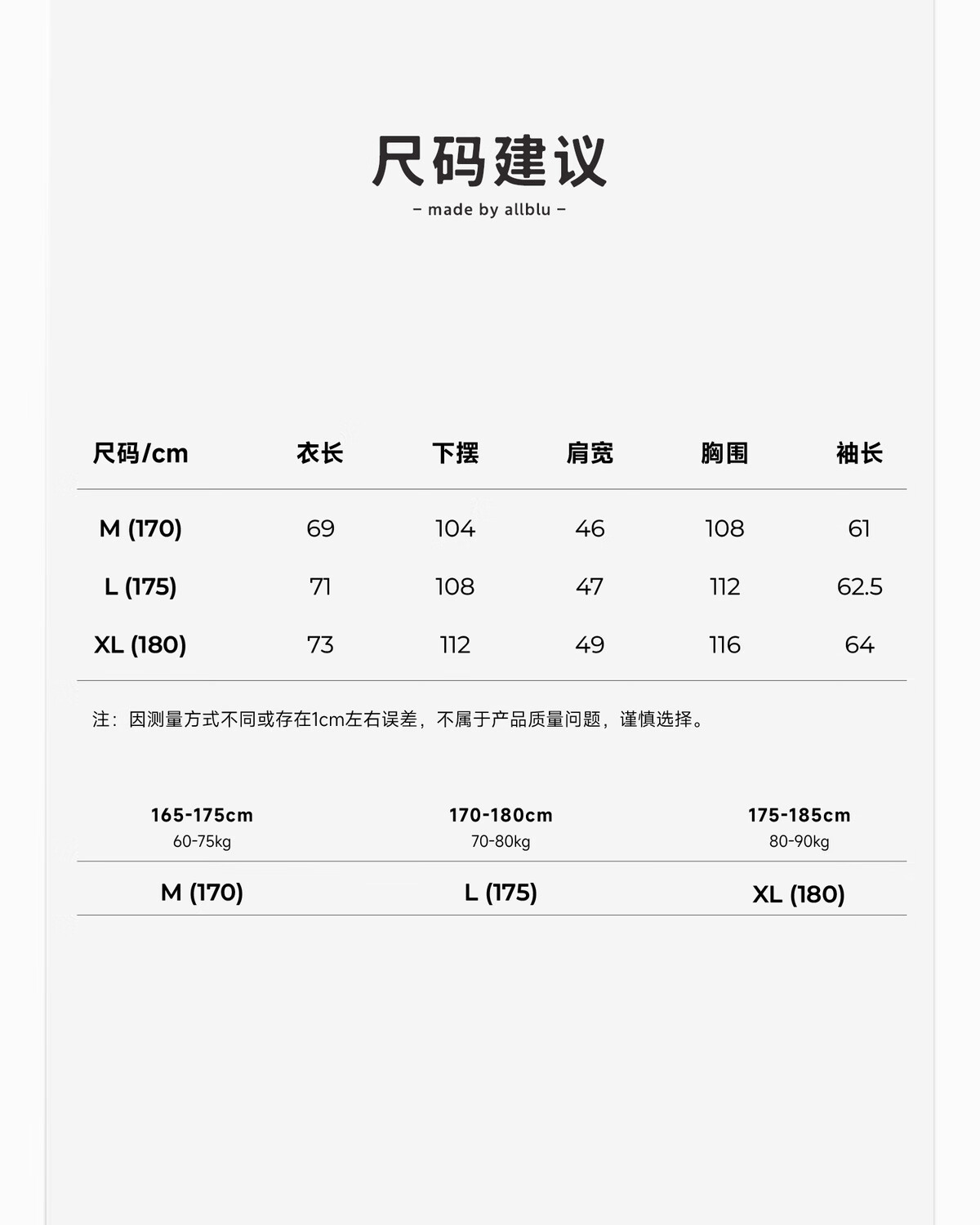 China (cm) 165 / 88-90 170 / 96-98 175 / 108-110 180 / 118-122 185 / 126-130