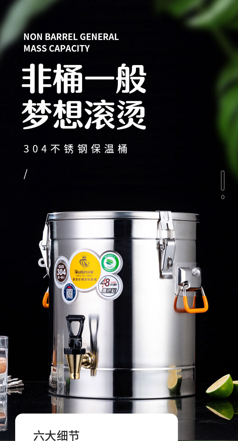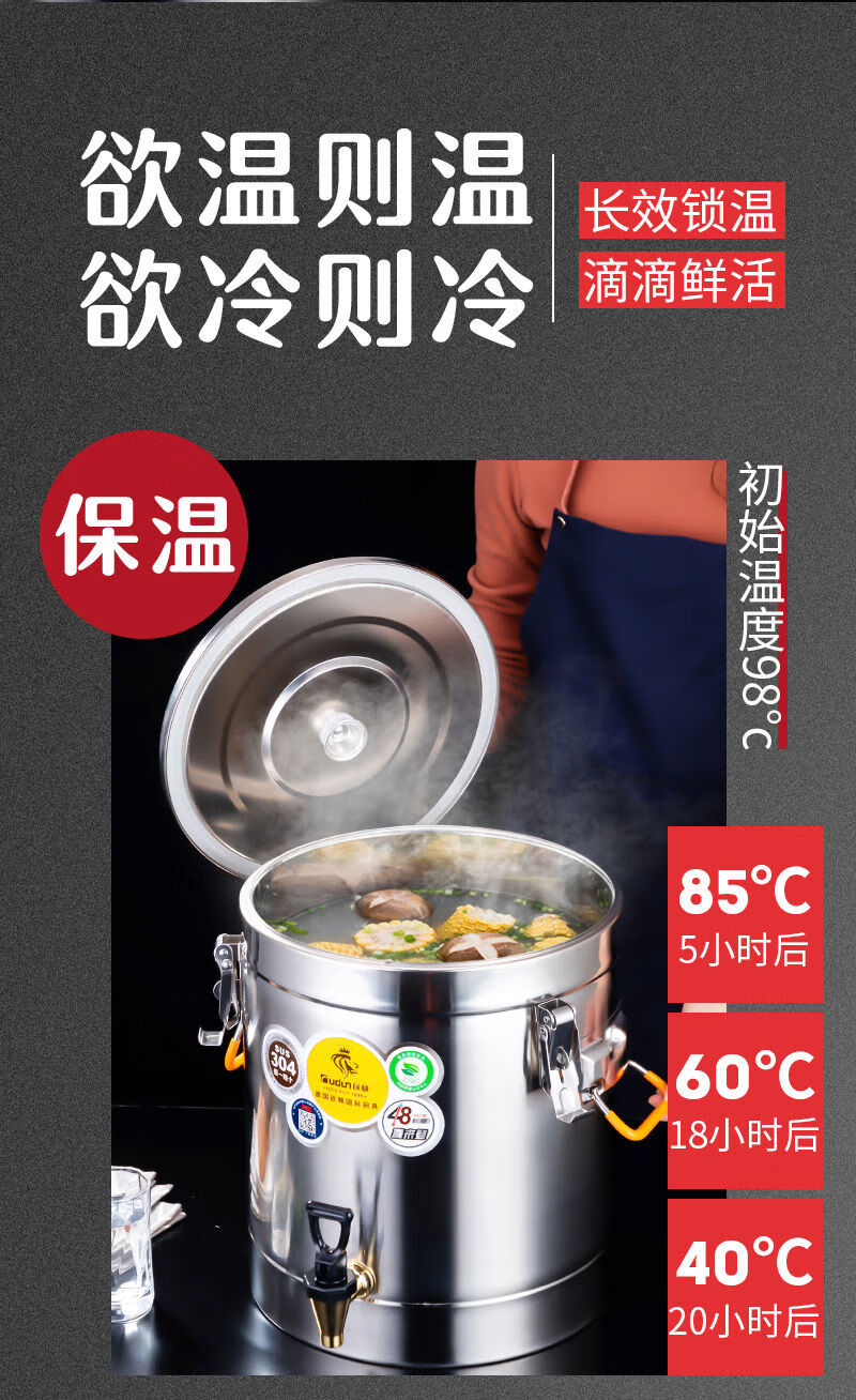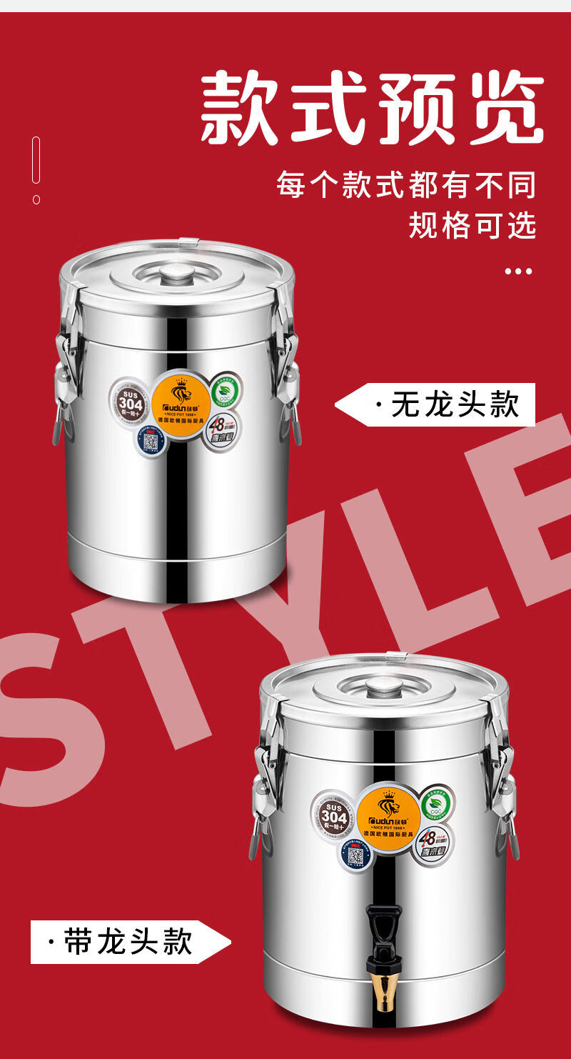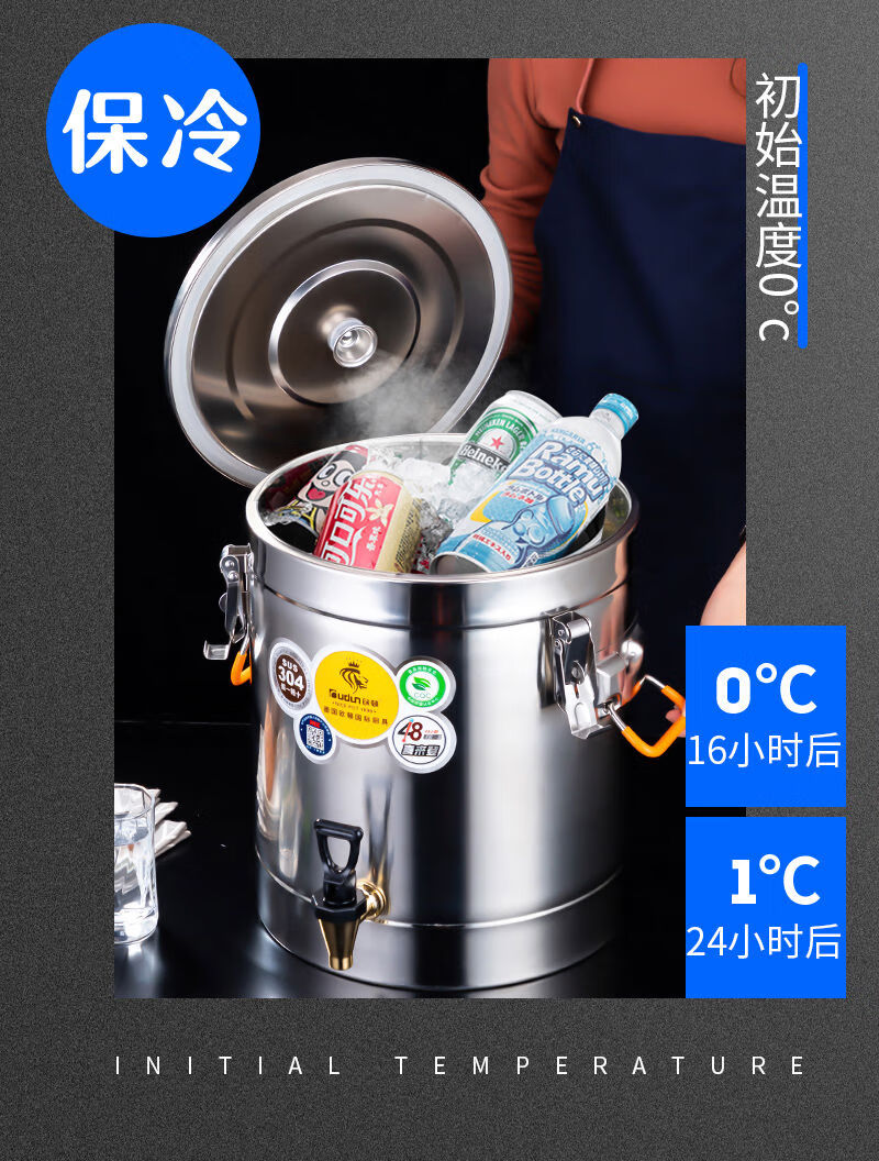 Orton 304 stainless steel insulation bucket with faucet large capacity commercial rice bucket canteen stall soy milk bucket food grade 304 with faucet 40L