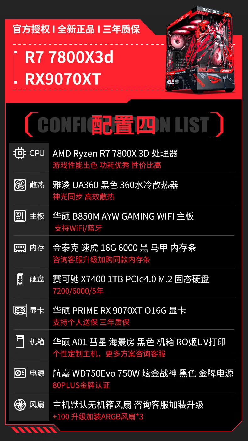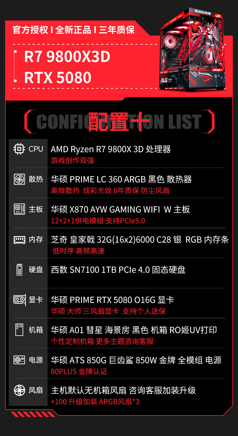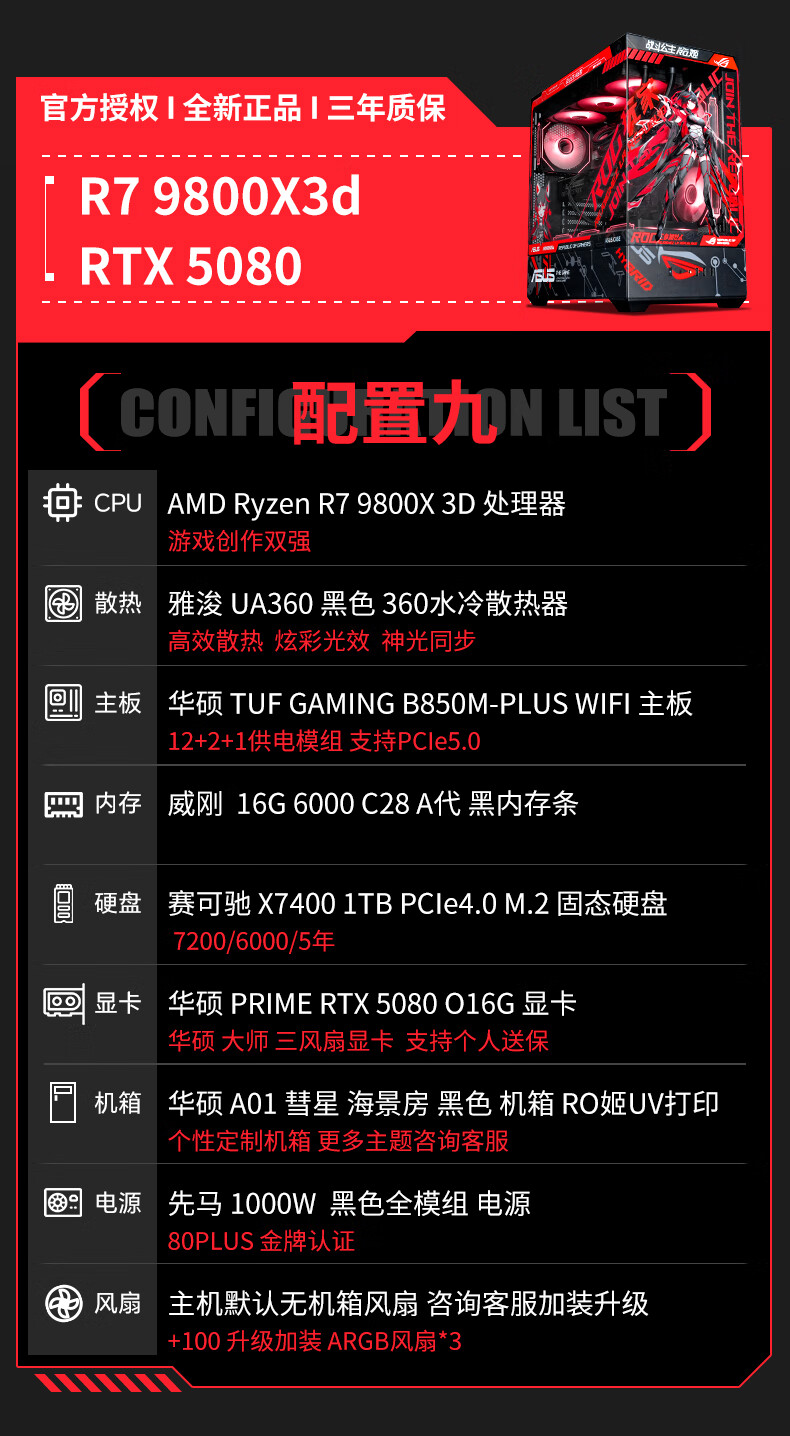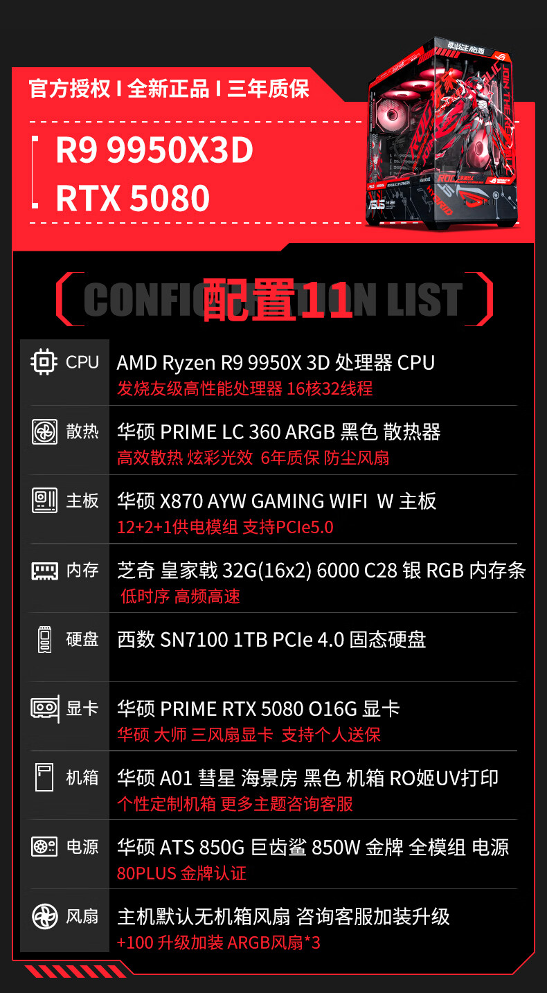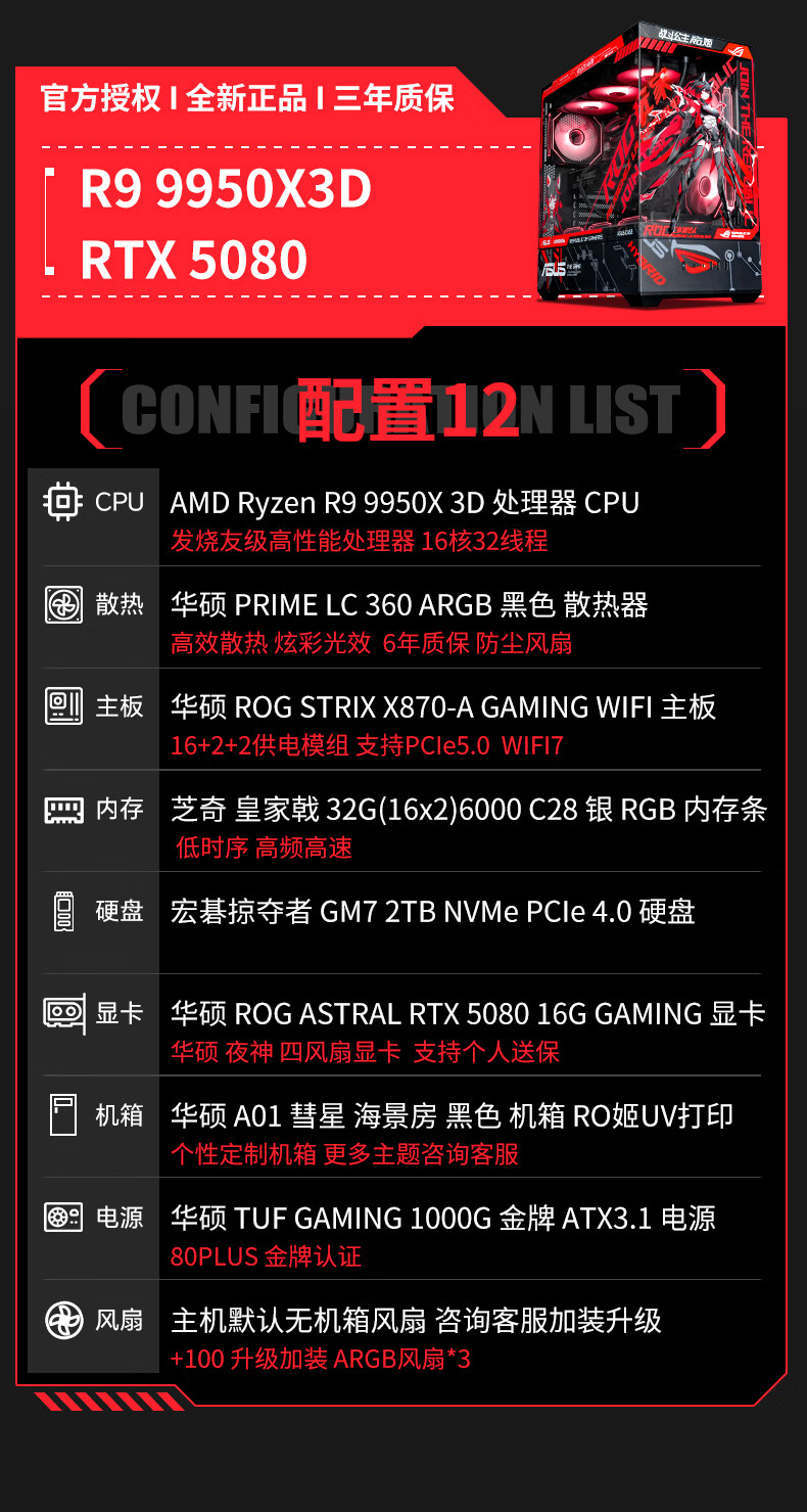 ASUS ROG family bucket AMD 9800/9950 X3D/5060/5070TI/5080/90D rendering desktop assembly computer game console high-end e-sports sea view room complete machine with three 7800X3D/RTX5070