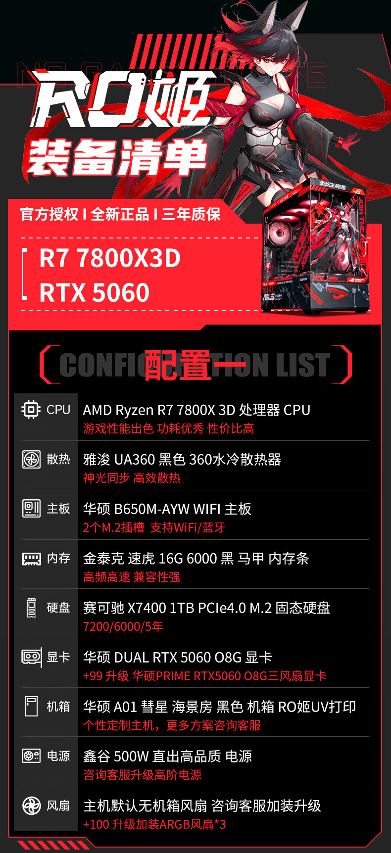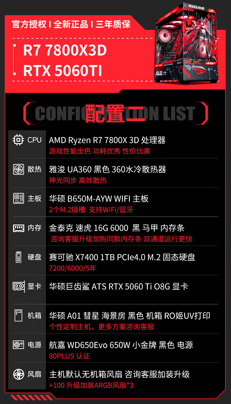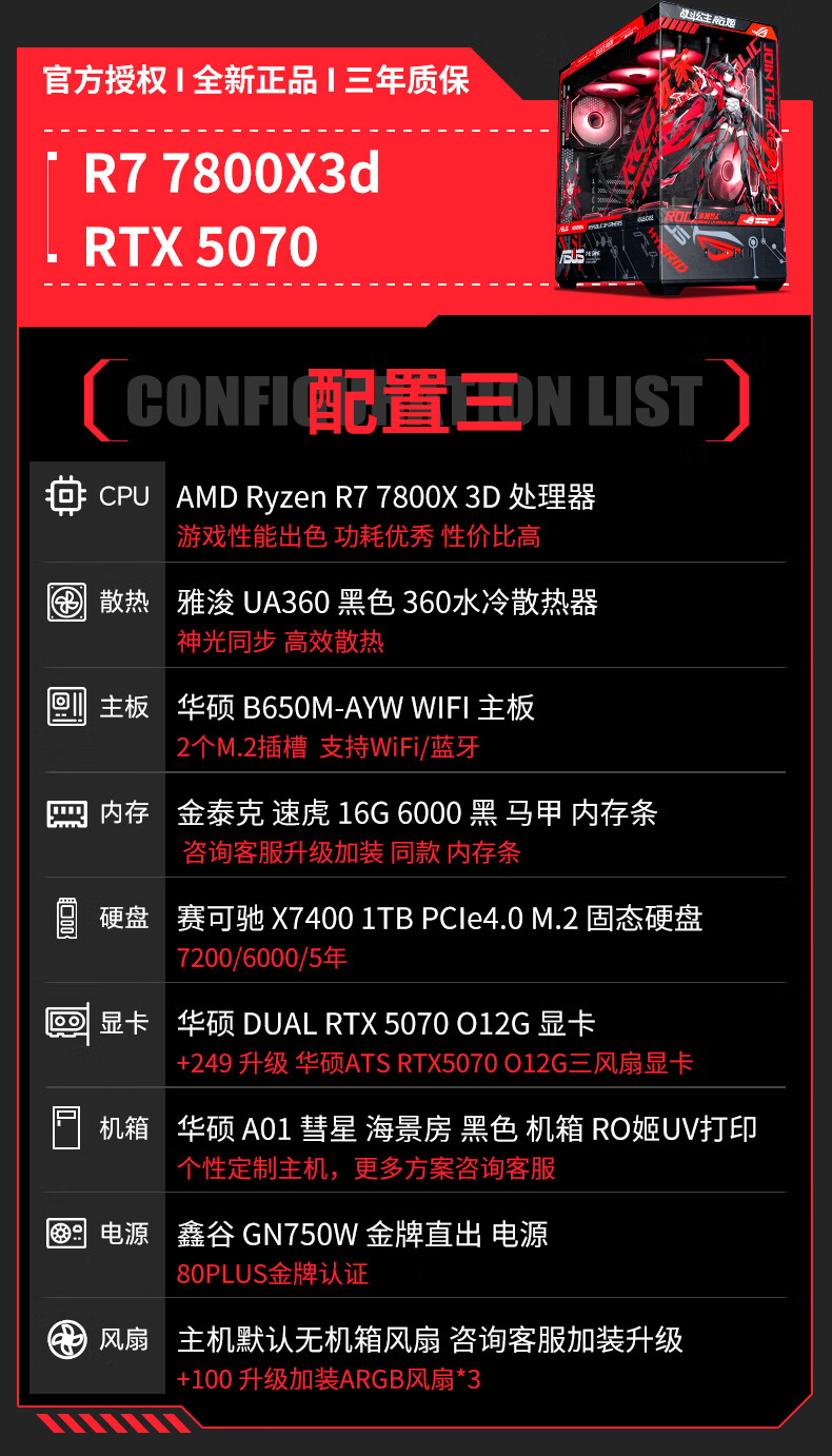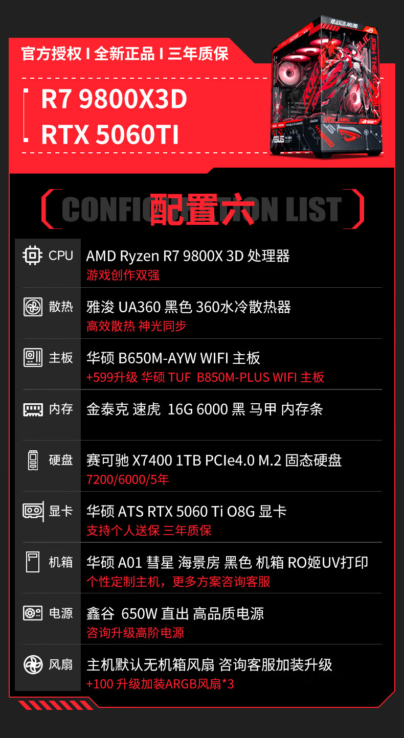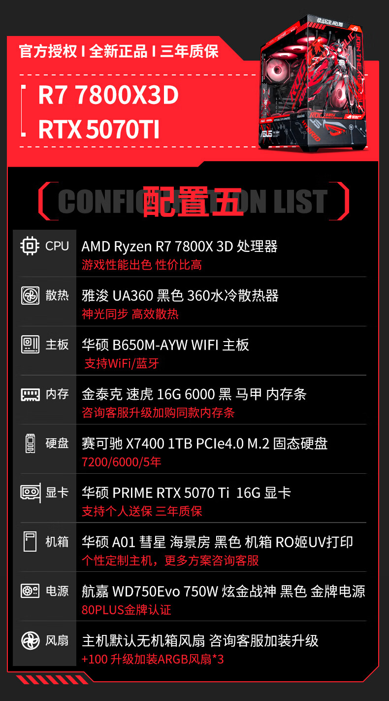 ASUS ROG family bucket AMD 9800/9950 X3D/5060/5070TI/5080/90D rendering desktop assembly computer game console high-end e-sports sea view room complete machine with three 7800X3D/RTX5070