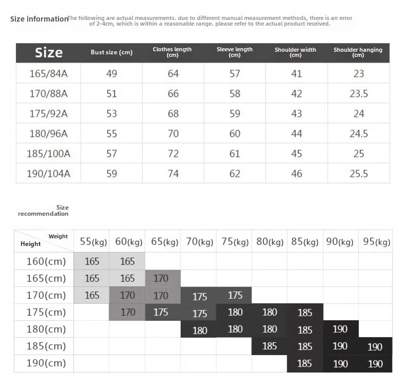China (cm) 160-165/84-86 165-170 / 88-90 167-172 / 92-96 168-173 / 98-102 170-176 / 106-110
