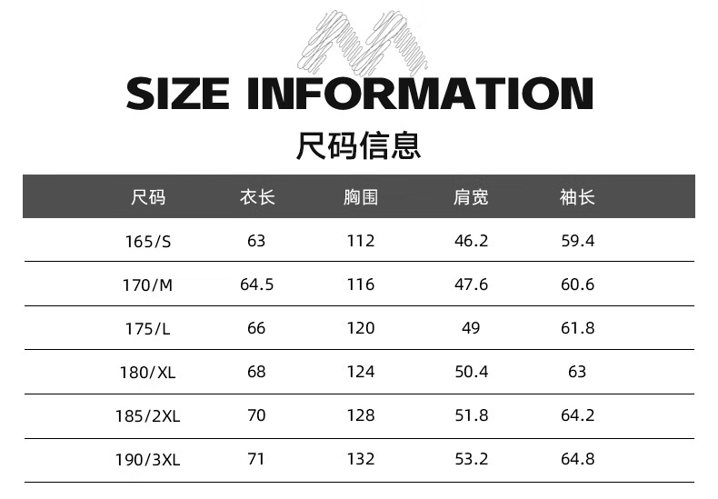 China (cm) 165 / 88-90 170 / 96-98 175 / 108-110 180 / 118-122 185 / 126-130