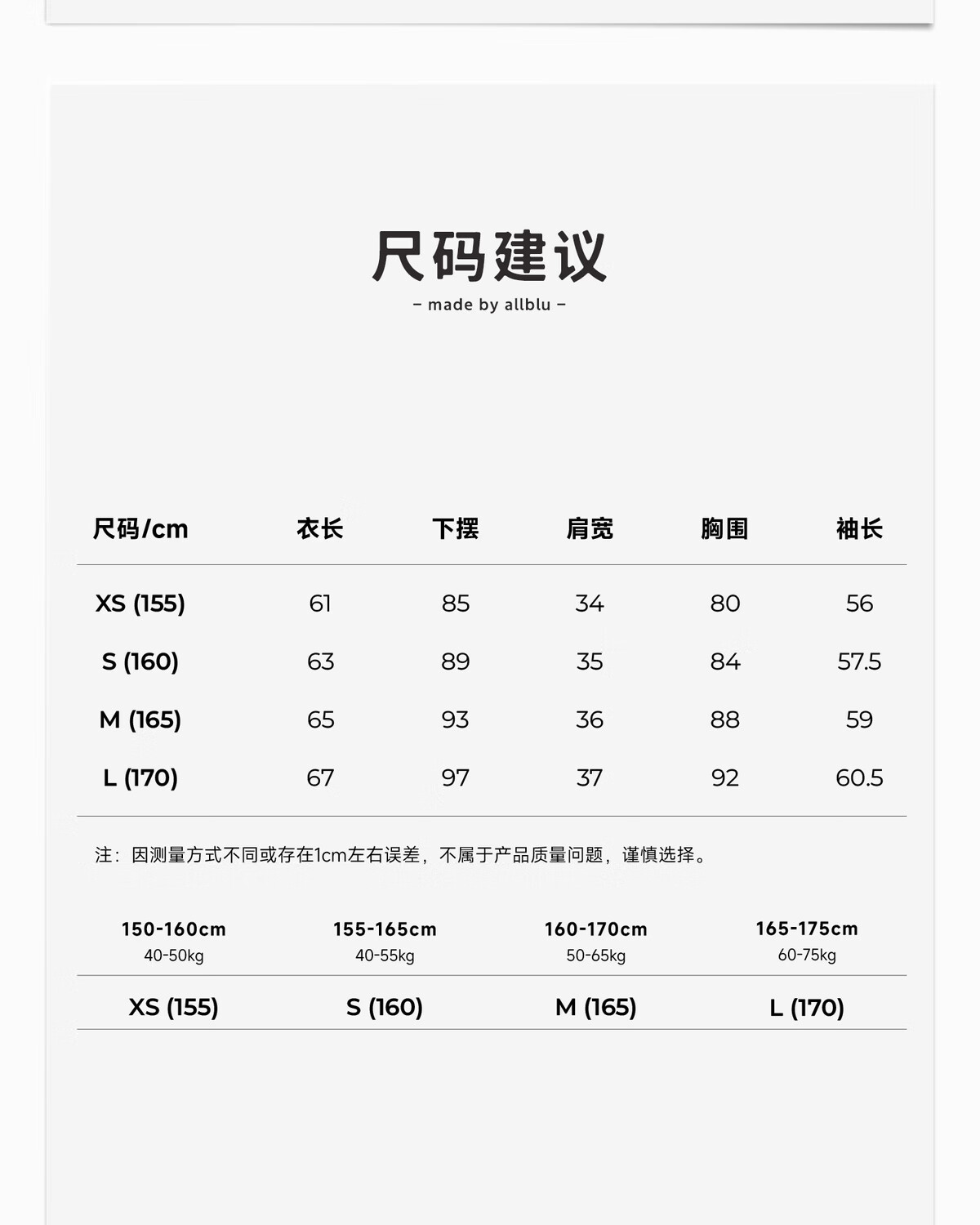 China (cm) 160-165/84-86 165-170 / 88-90 167-172 / 92-96 168-173 / 98-102 170-176 / 106-110