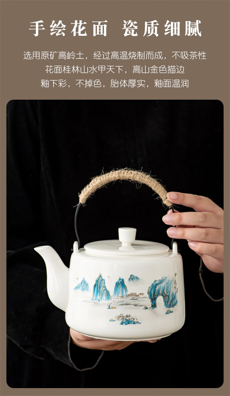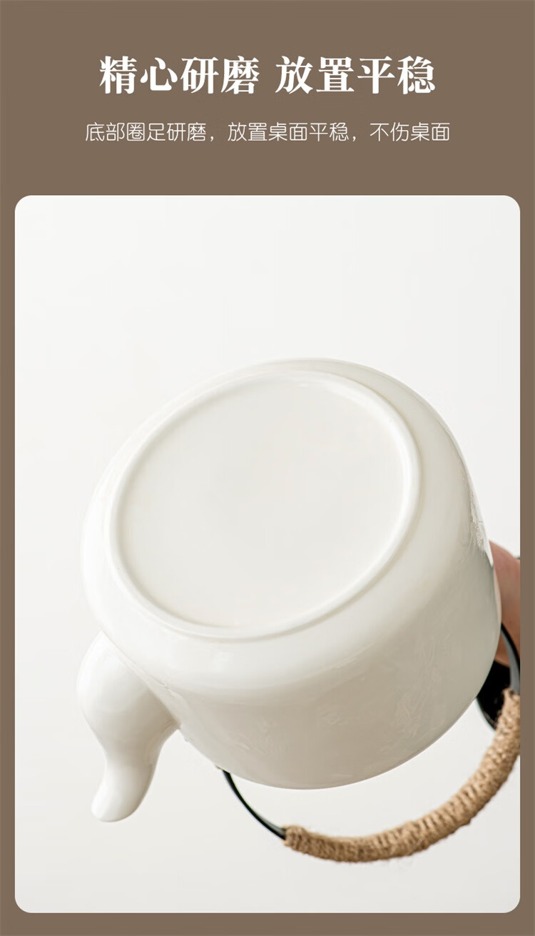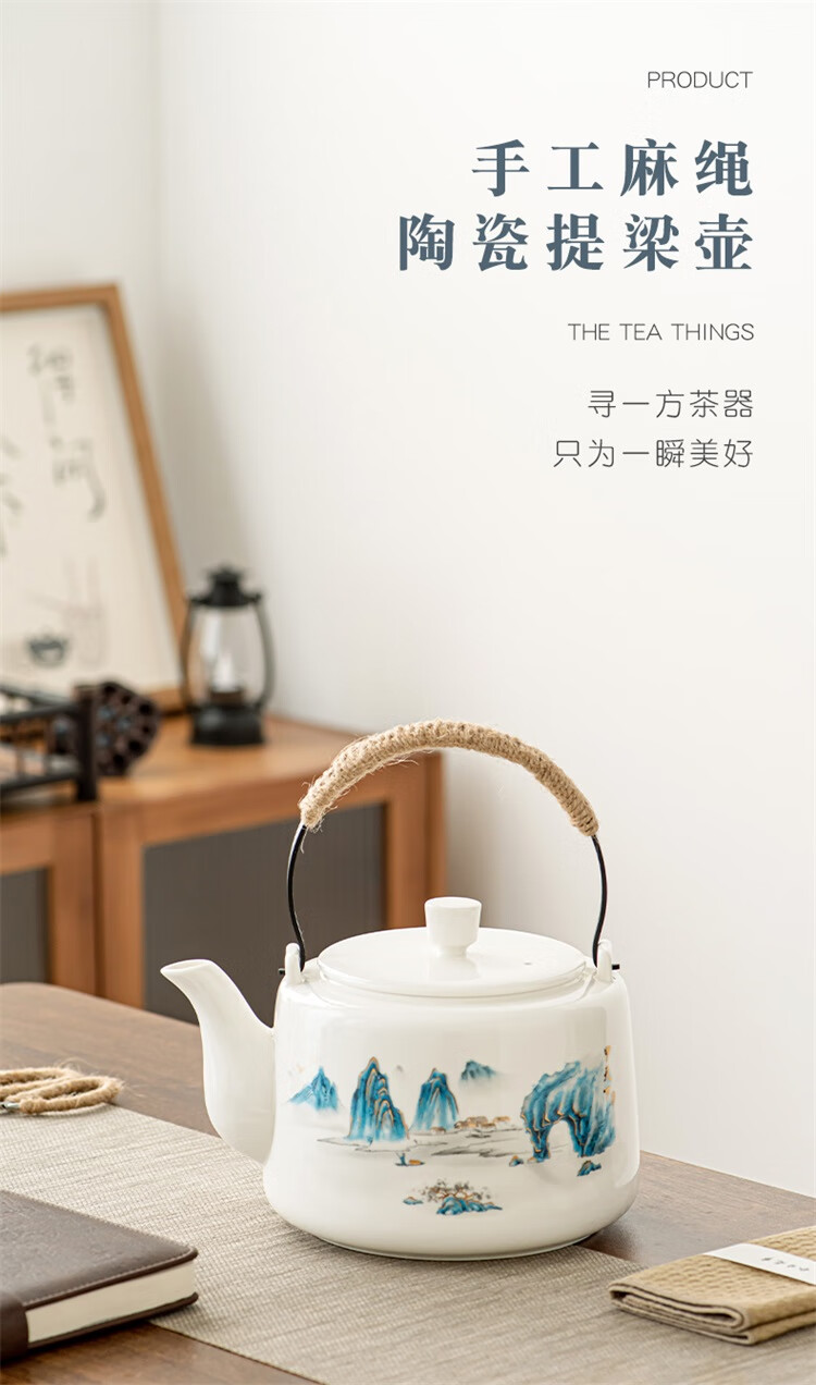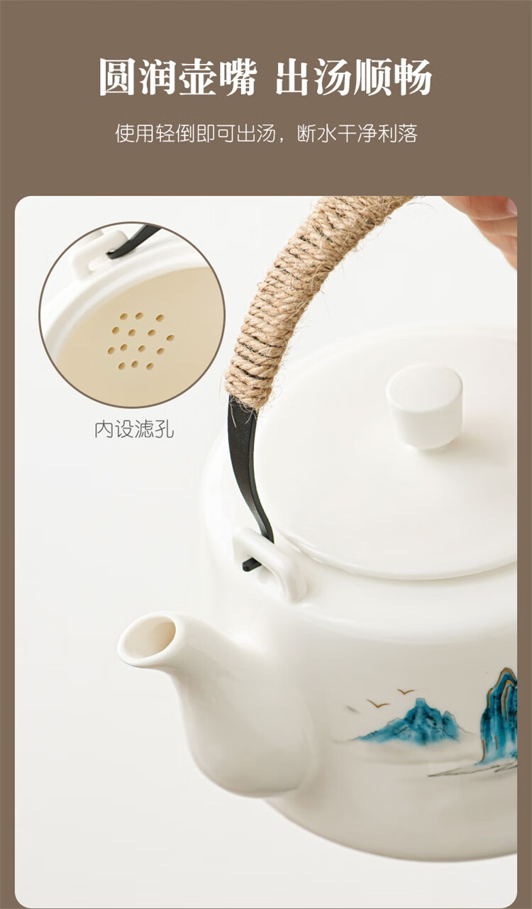 Suet fat jade porcelain handle kettle, one pot and six cups tea set, large capacity household cold kettle, Chinese teapot, teacups, 1600ml handle kettle, 6 straight cups - Yuanshan