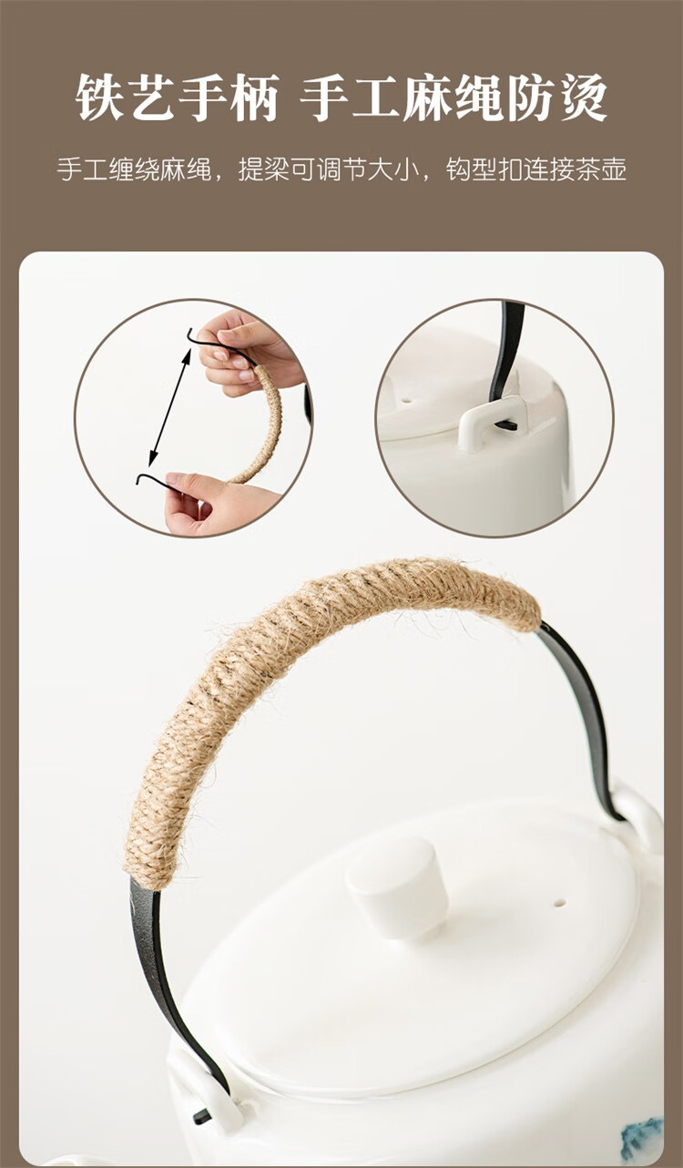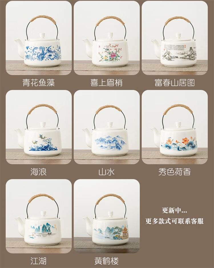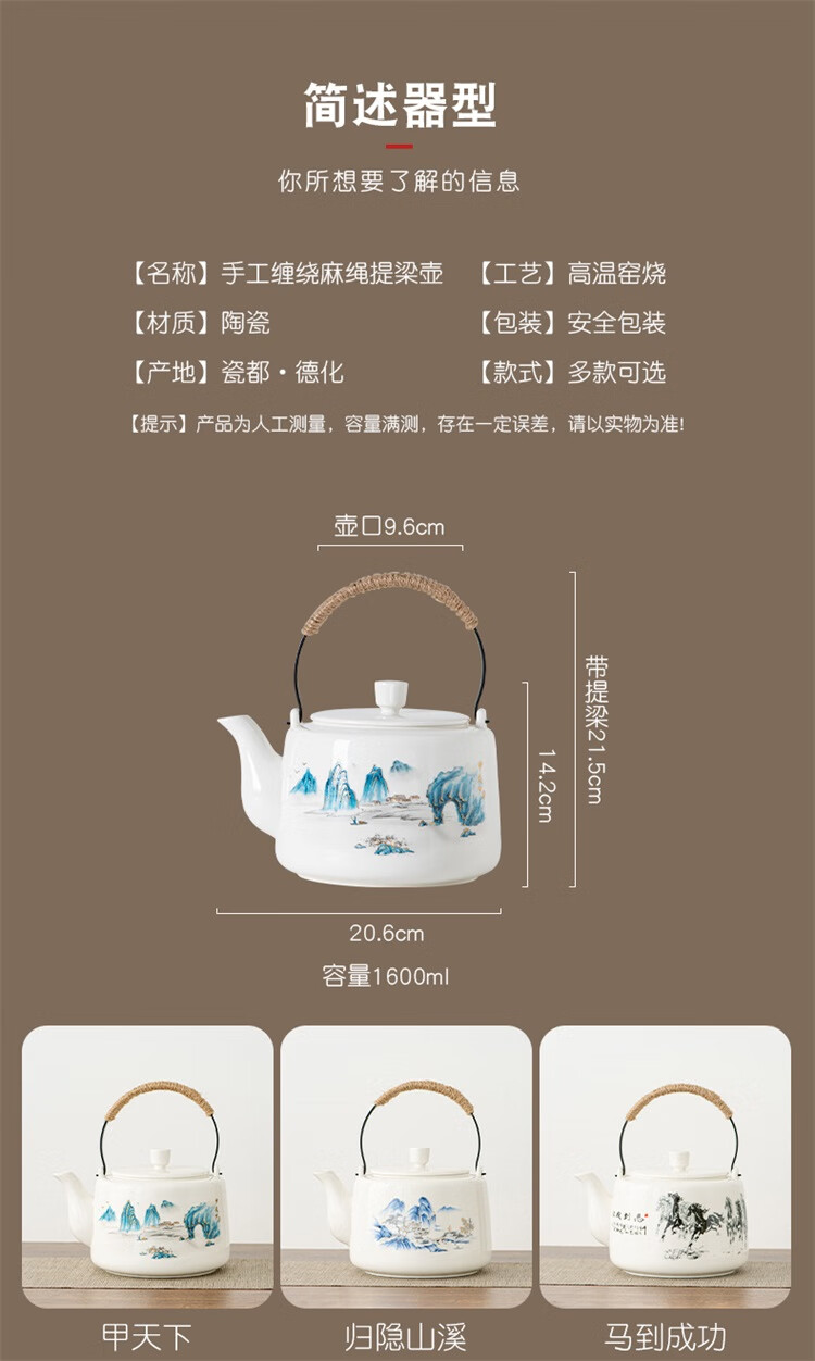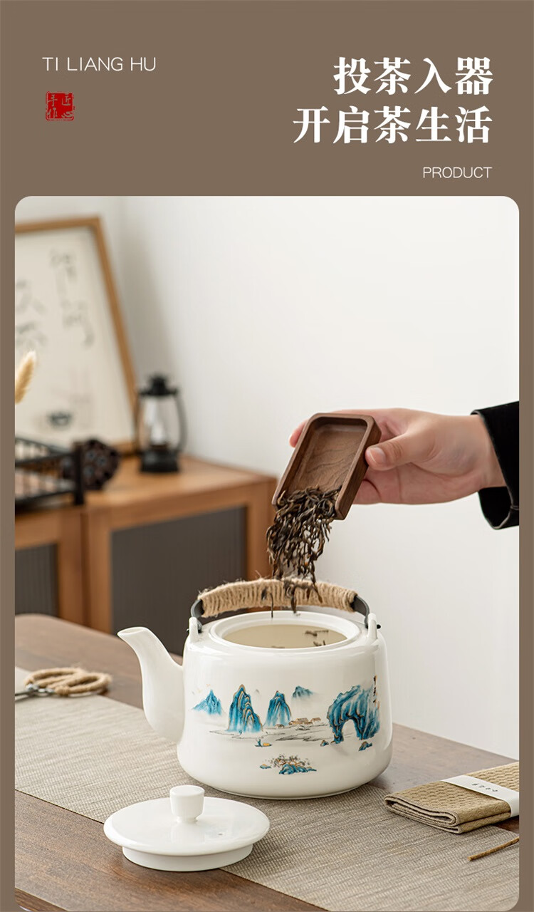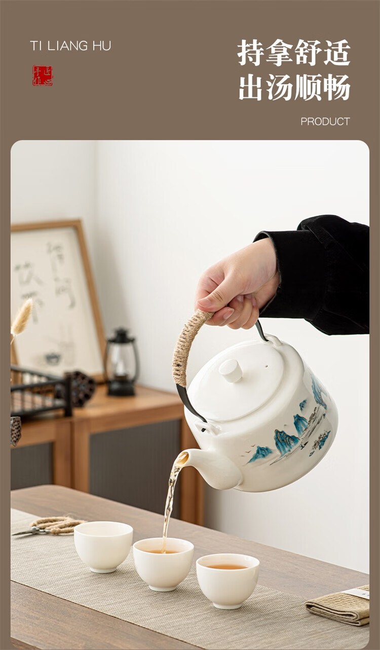 Suet fat jade porcelain handle kettle, one pot and six cups tea set, large capacity household cold kettle, Chinese teapot, teacups, 1600ml handle kettle, 6 straight cups - Yuanshan