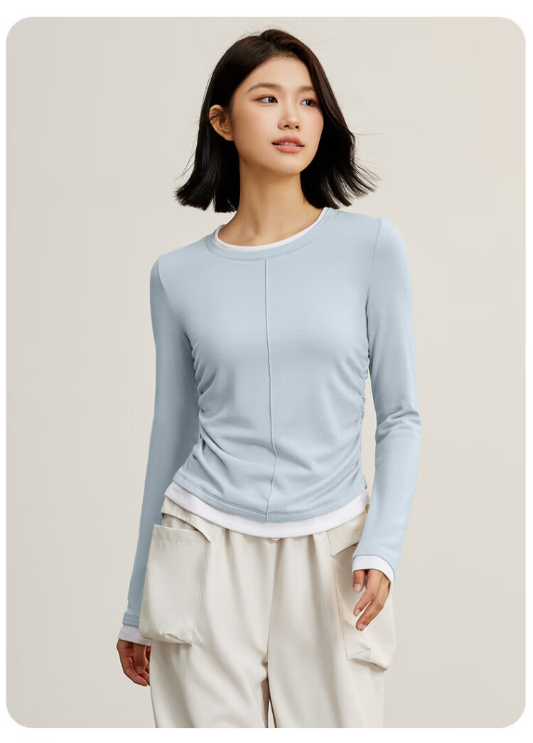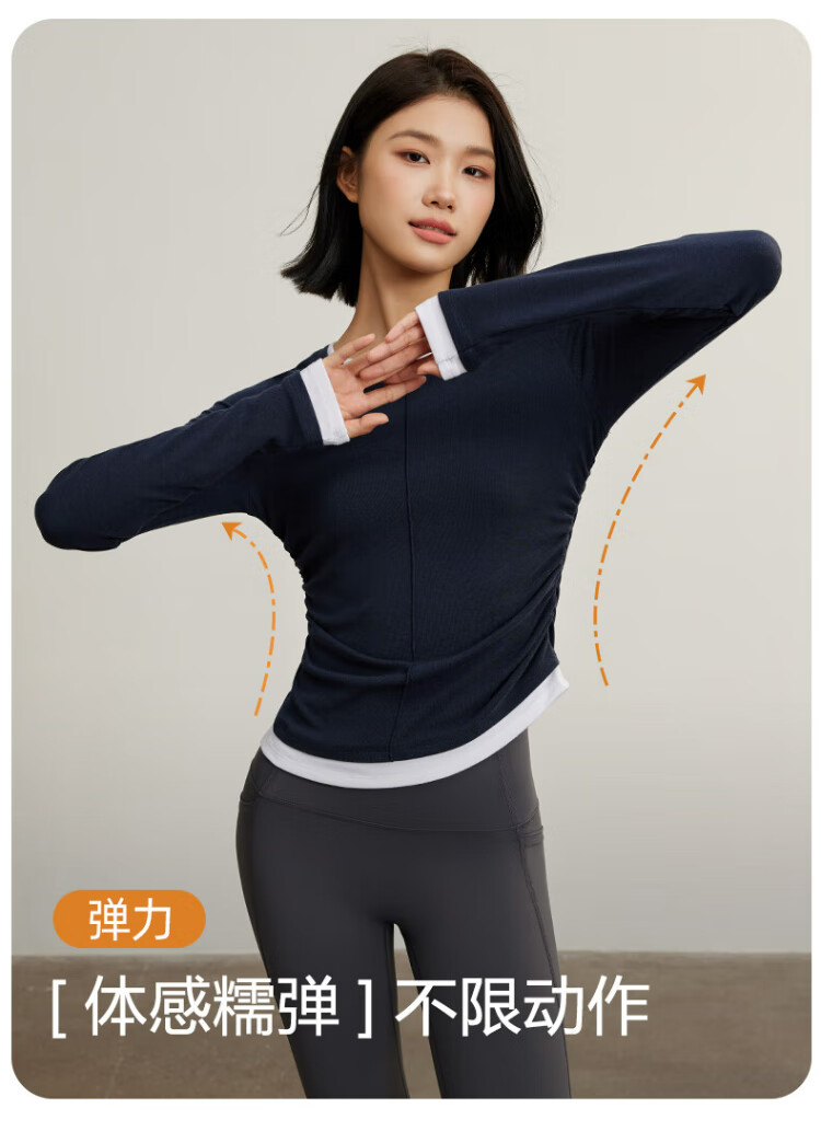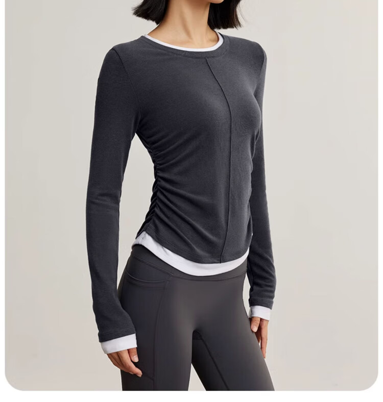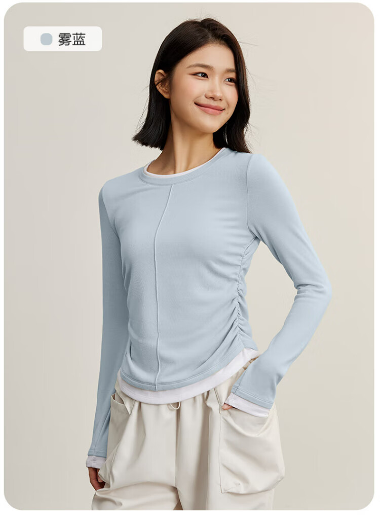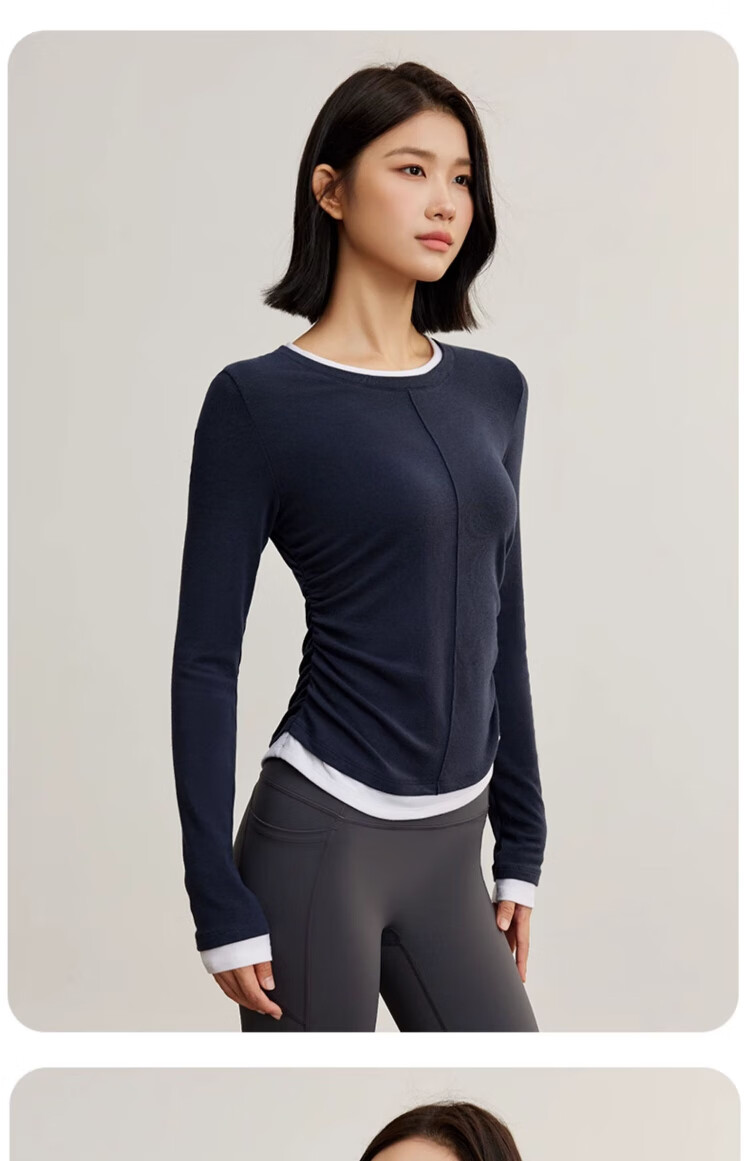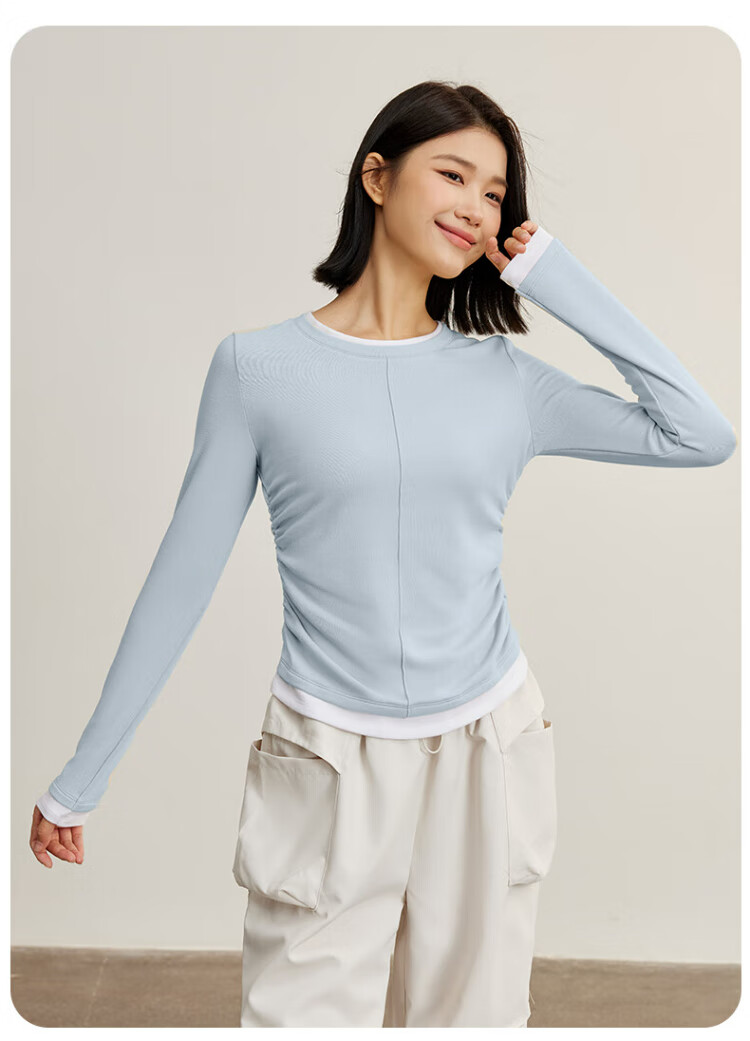 NEVER ME Sports T-shirt Women's Pleated Slim Top Pilates Training Yoga Wear Bottoming Shirt Contrast Color Long Sleeve Mist Blue M Recommended 100-115 Jin Jin equals 0.5 kg