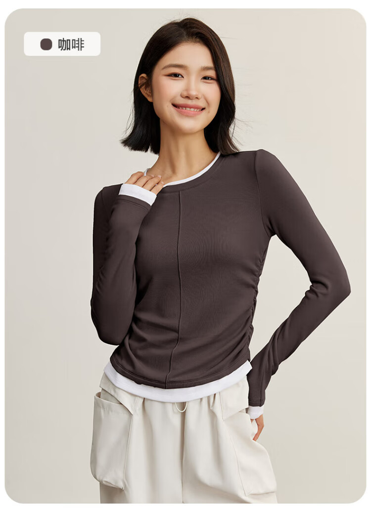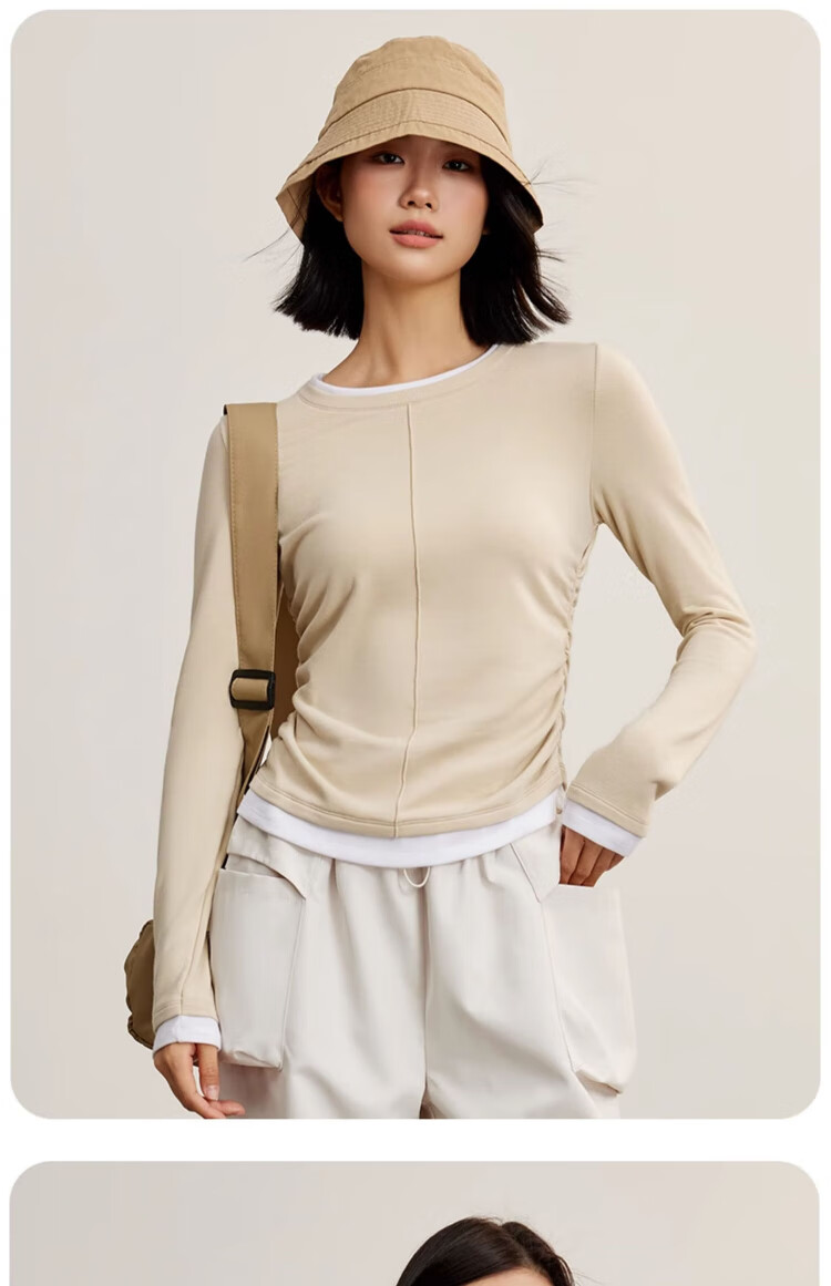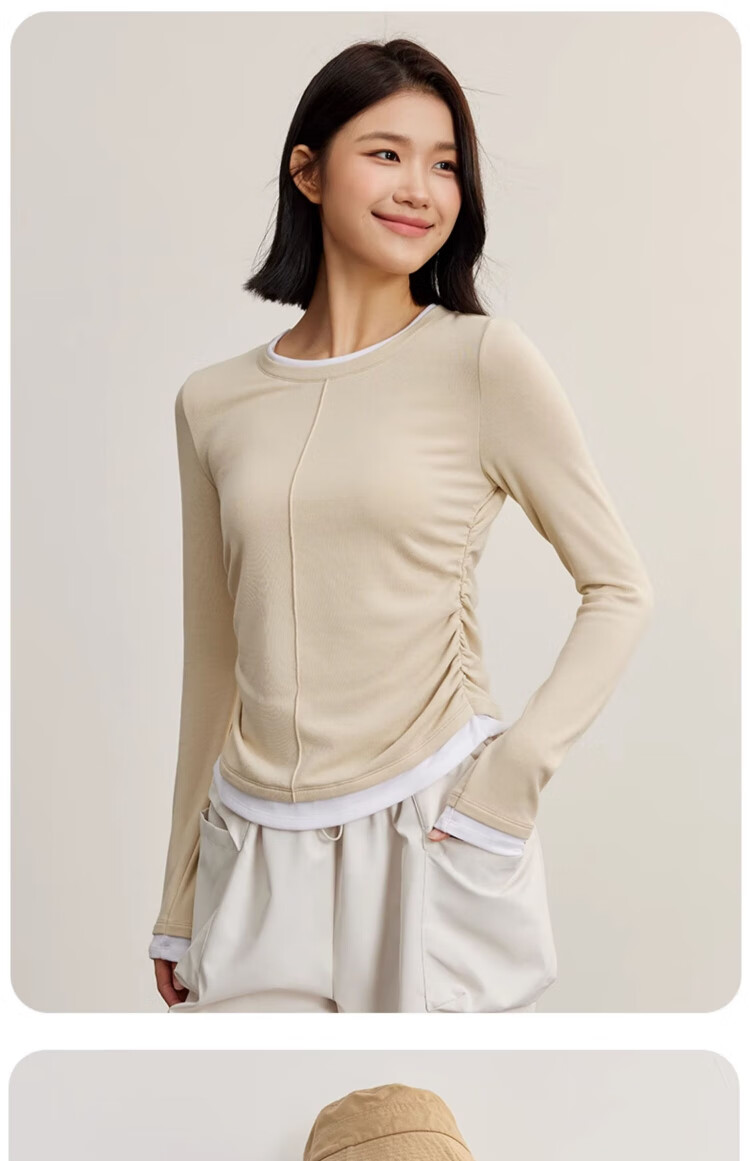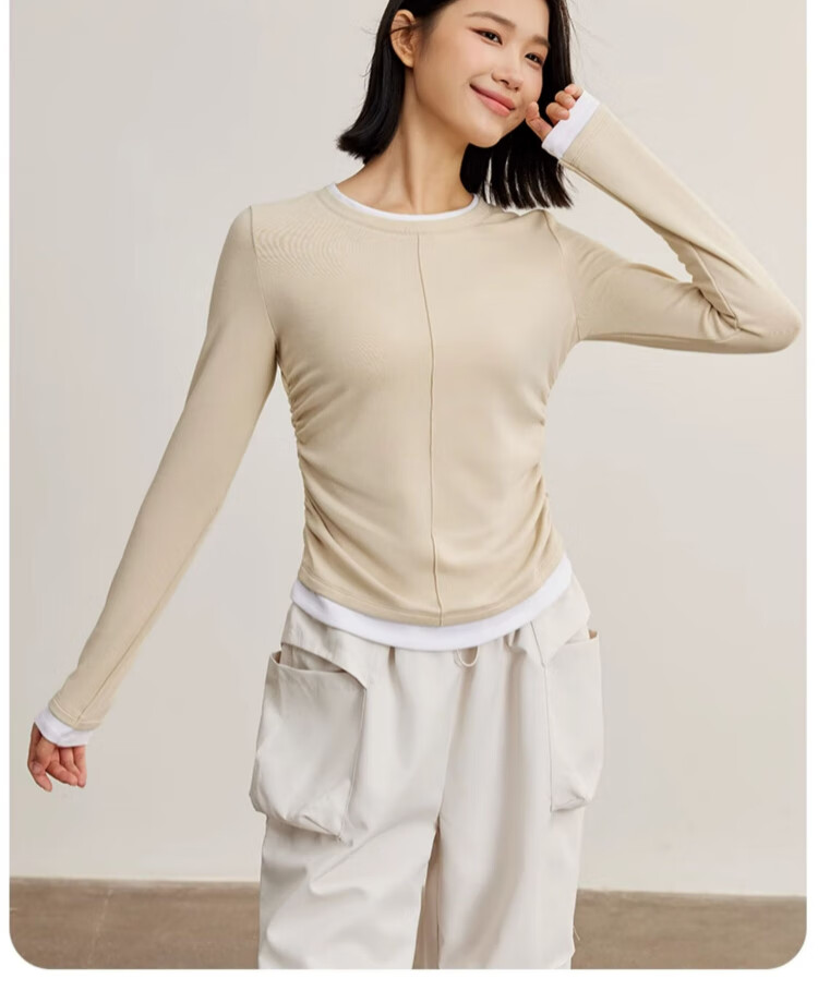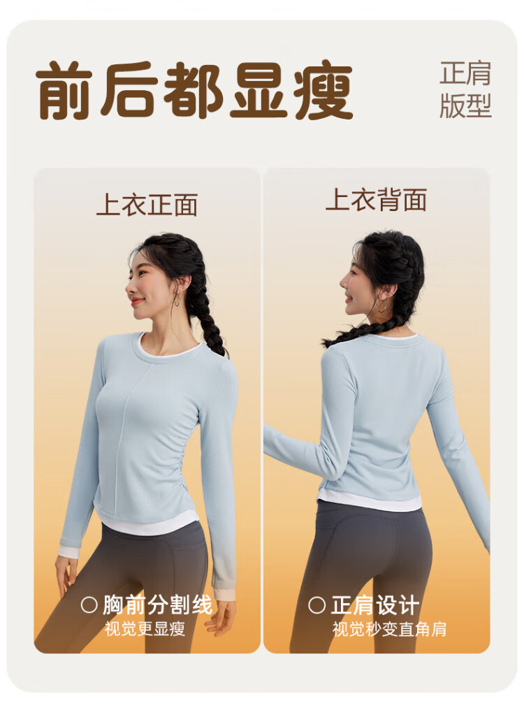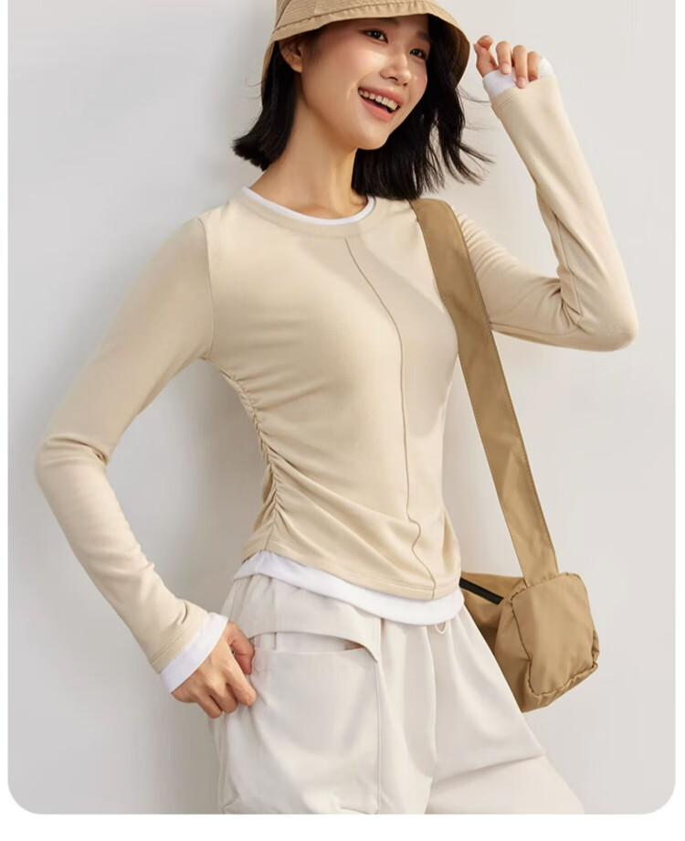 NEVER ME Sports T-shirt Women's Pleated Slim Top Pilates Training Yoga Wear Bottoming Shirt Contrast Color Long Sleeve Mist Blue M Recommended 100-115 Jin Jin equals 0.5 kg