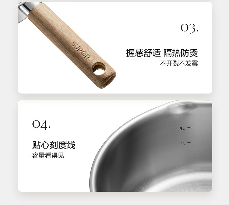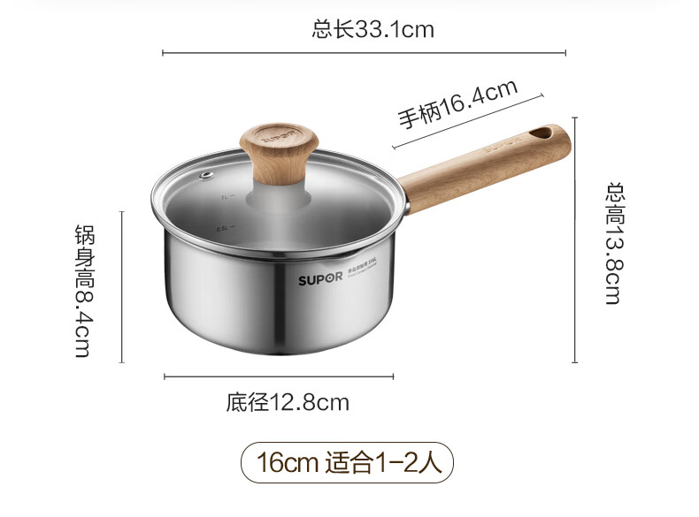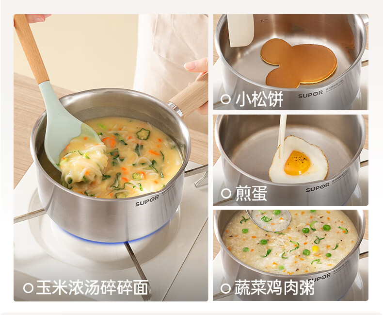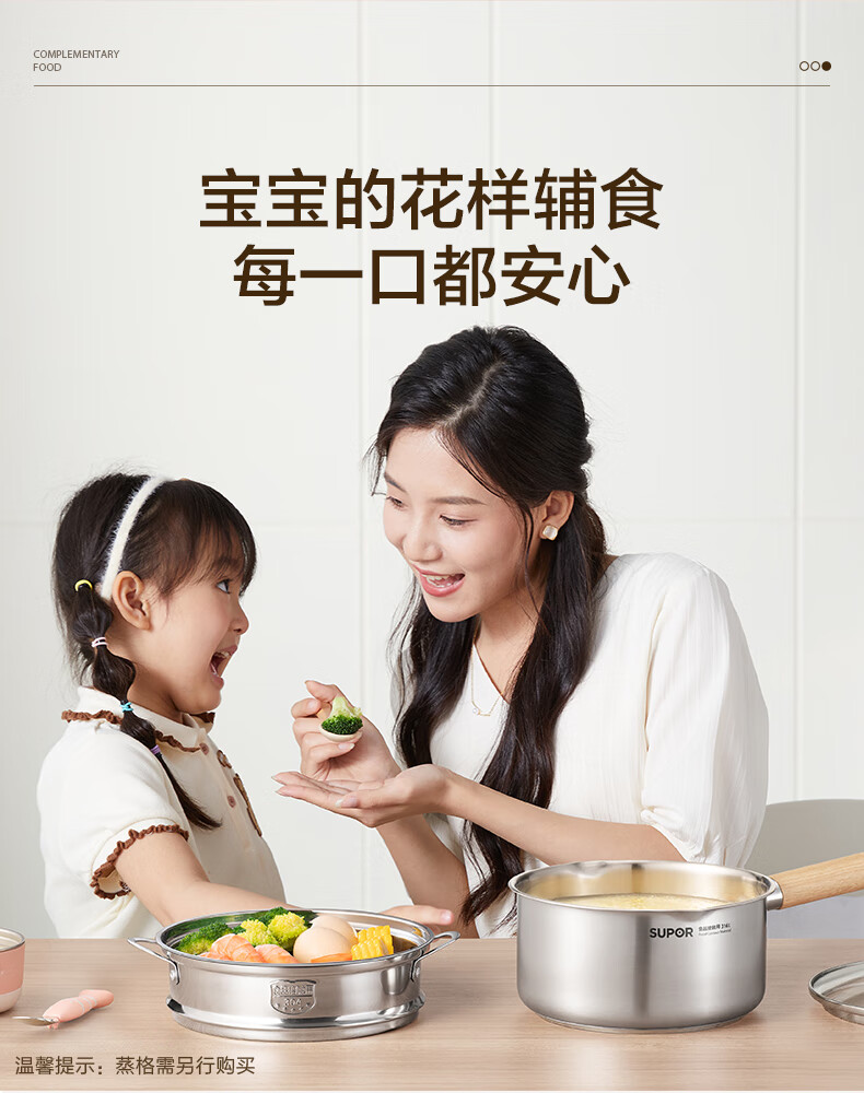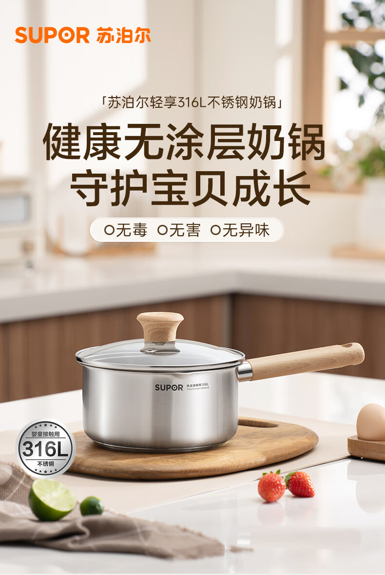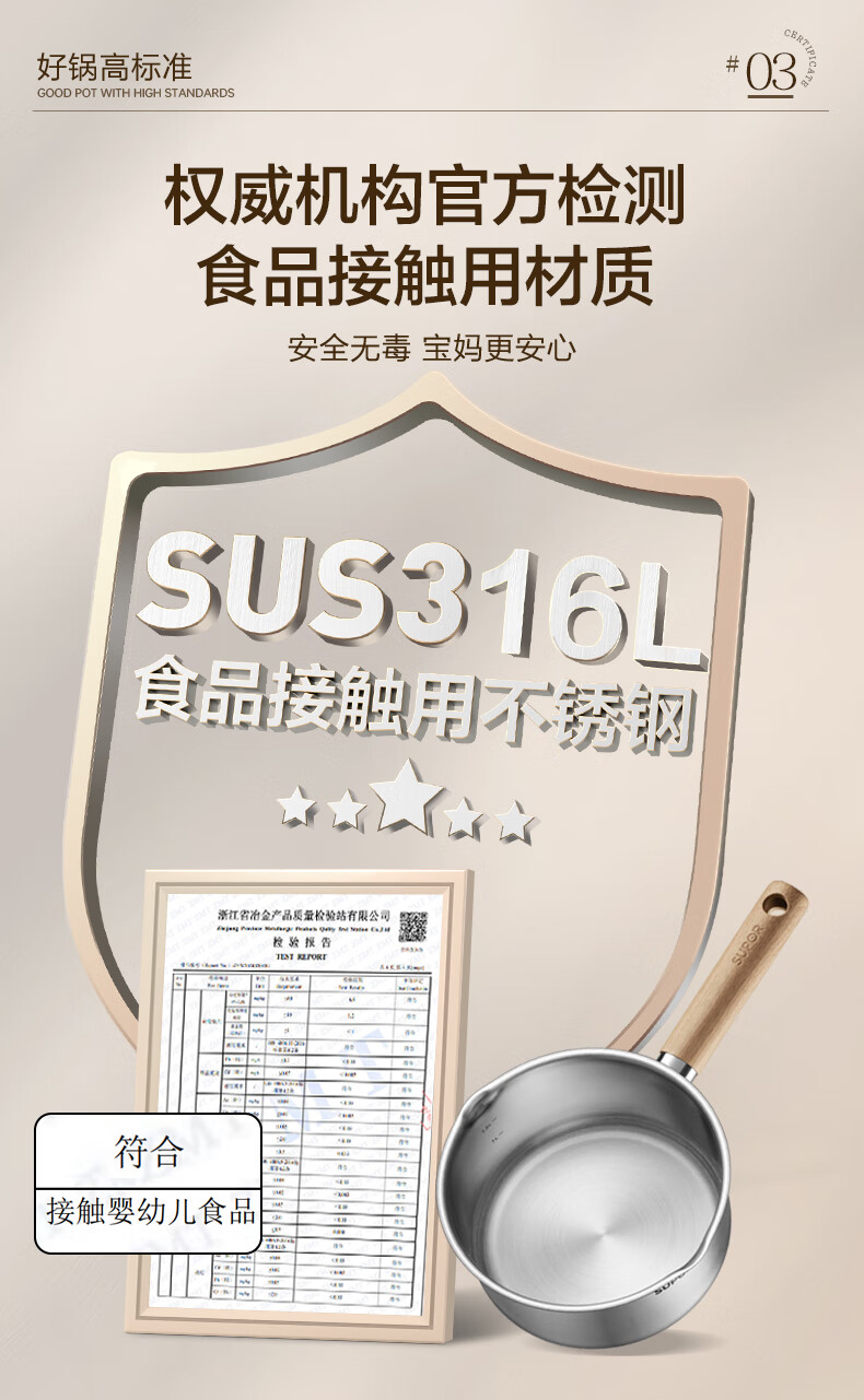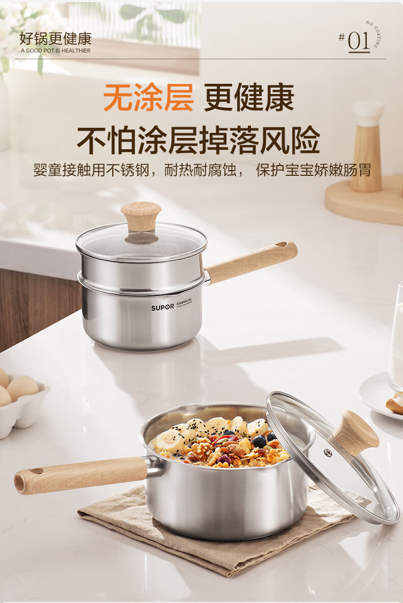 SUPOR milk pot 316L stainless steel baby food supplement stew three-layer thickened double bottom small milk pot induction cooker gas universal 316L stainless steel milk pot + steamer 20cm