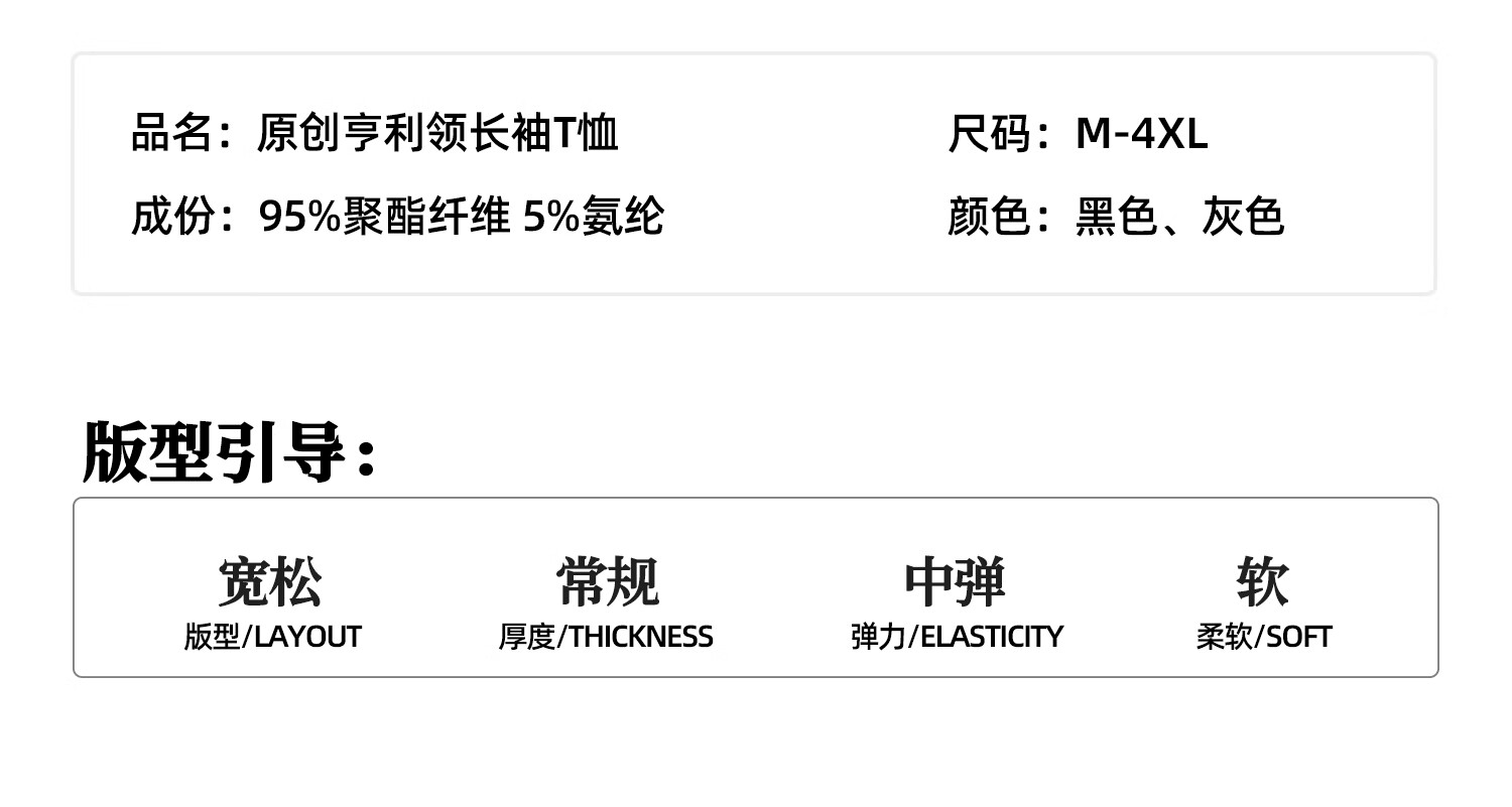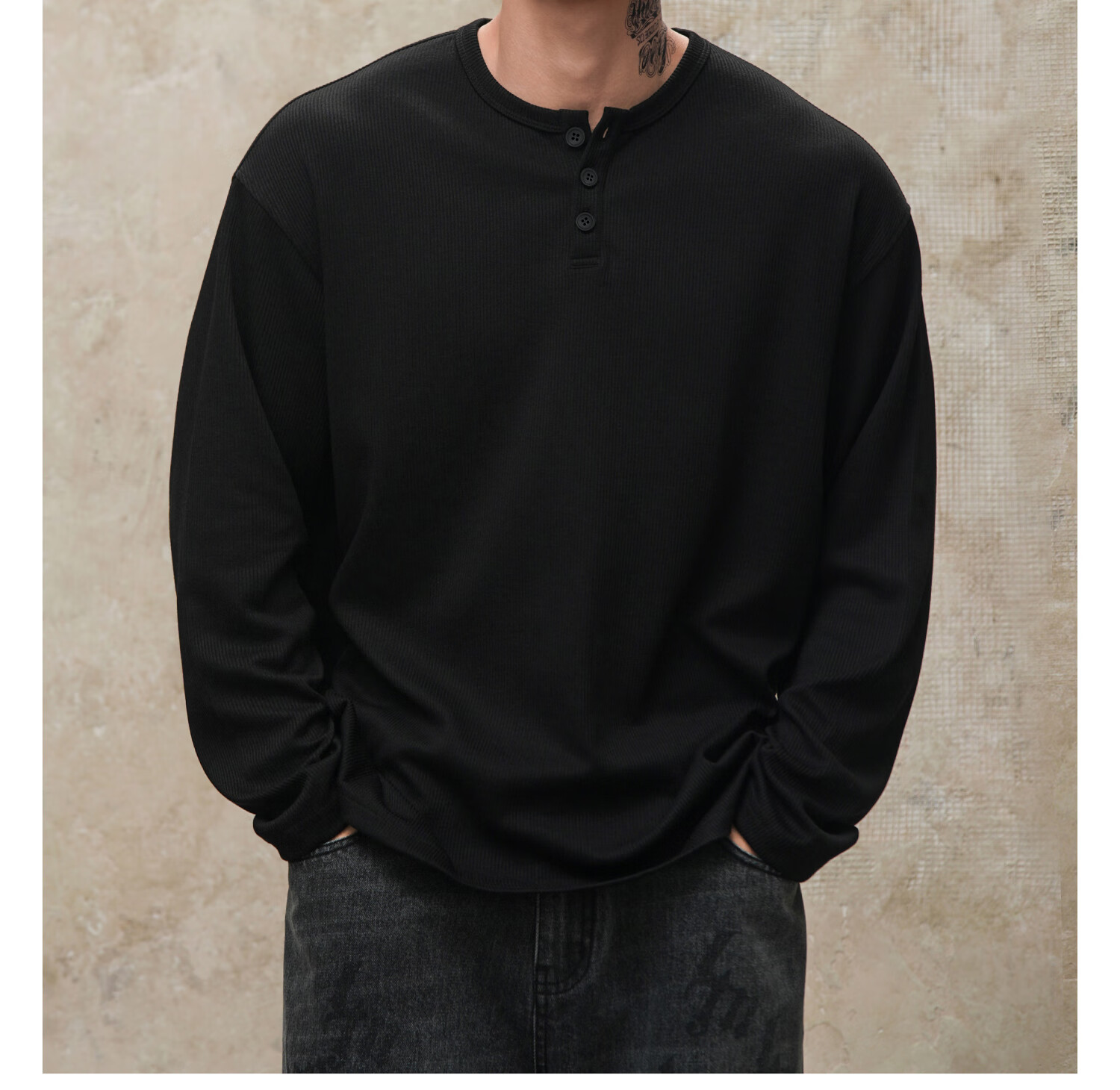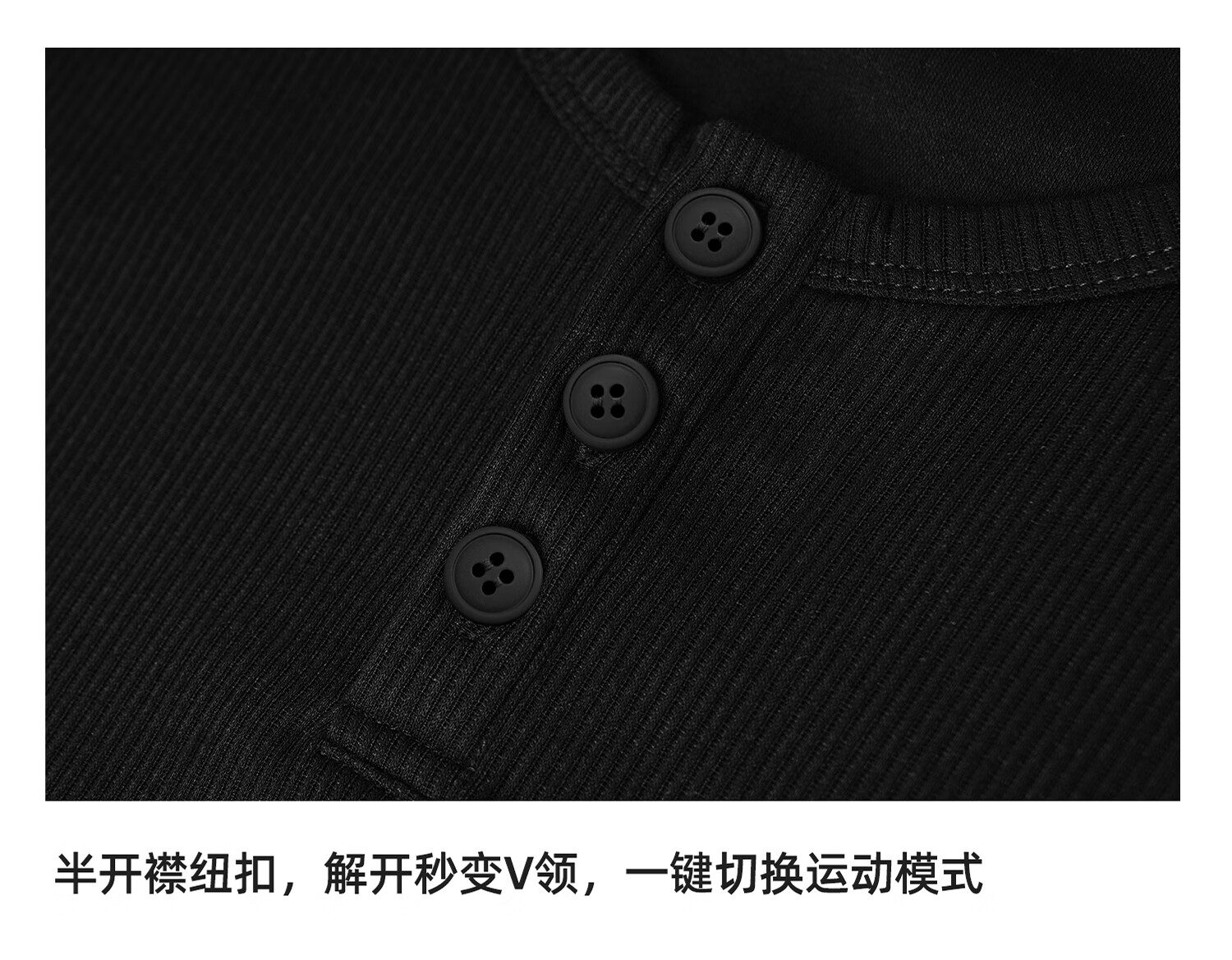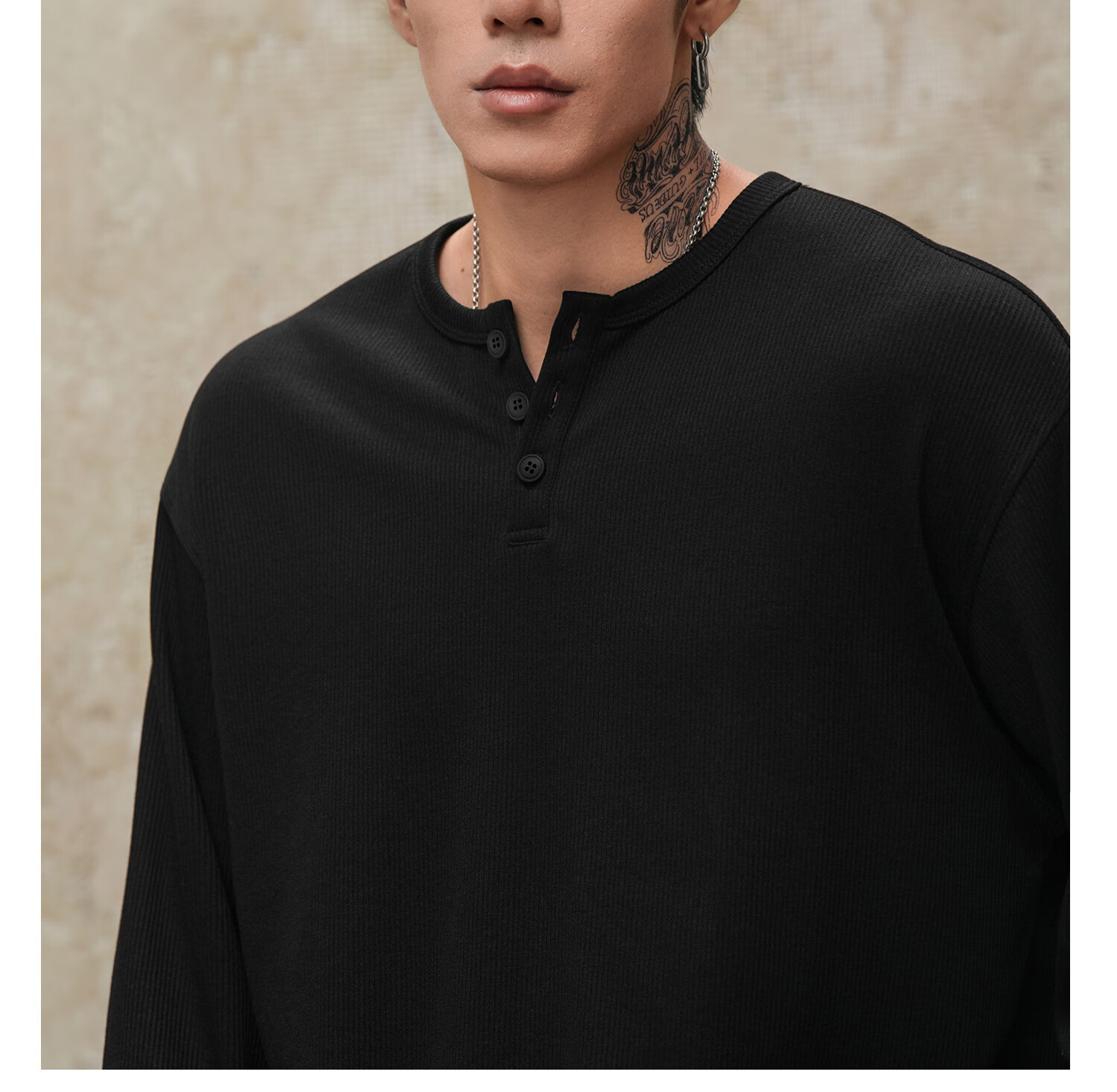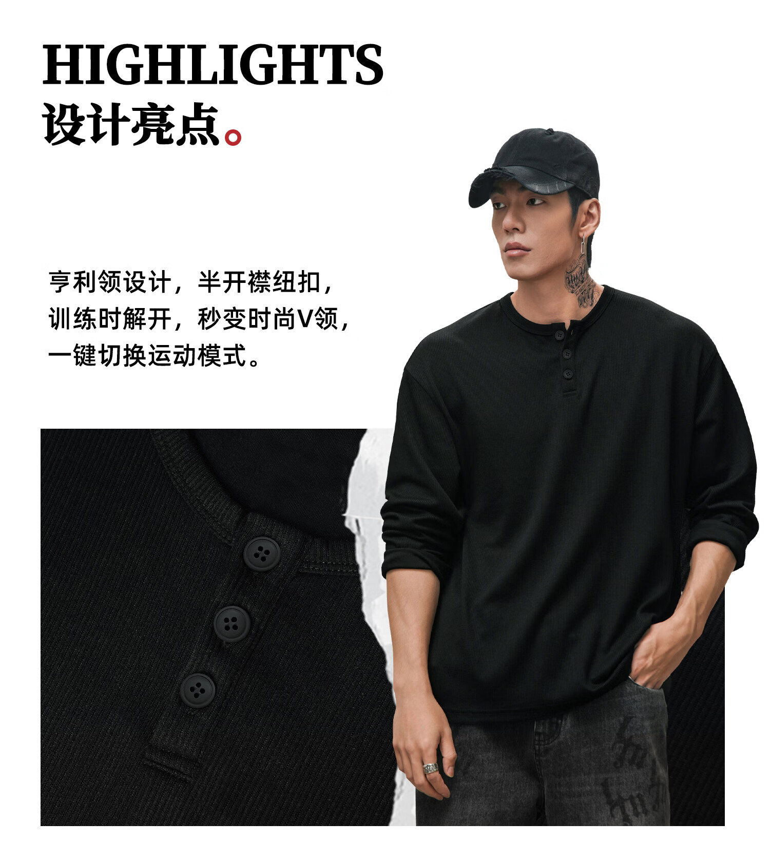 Lujiamen textured henley collar long-sleeved T-shirt men's sports fitness large size elastic bottoming shirt casual top black regular version (fabric weight 240g) 2XL recommended 180-220Jin Jin equals 0.5 kg