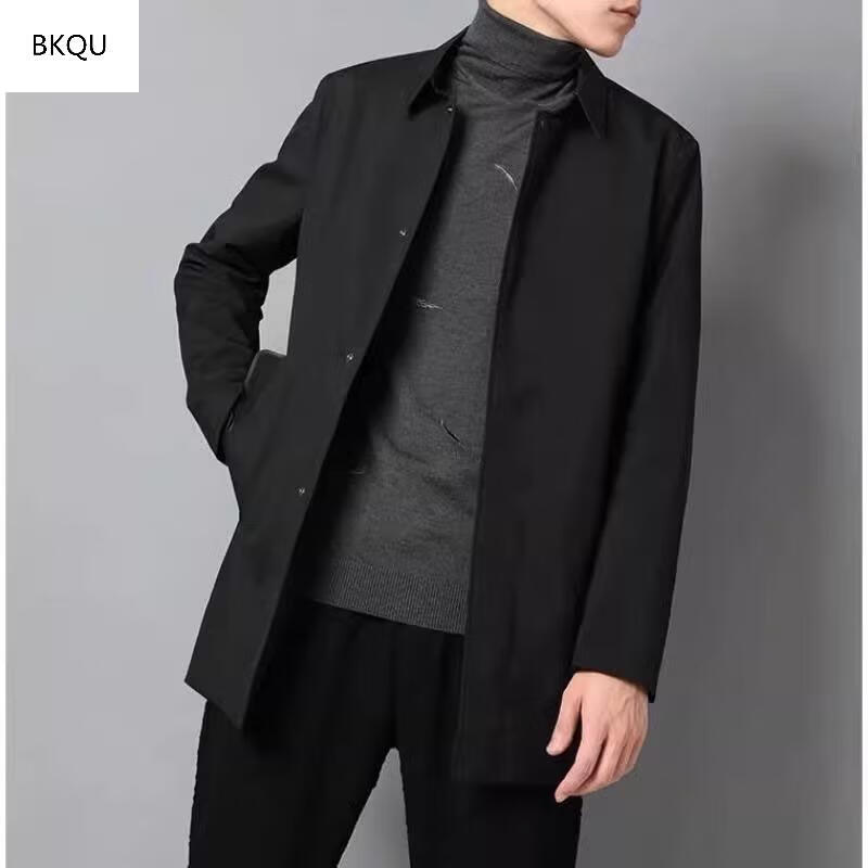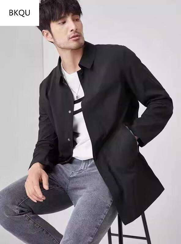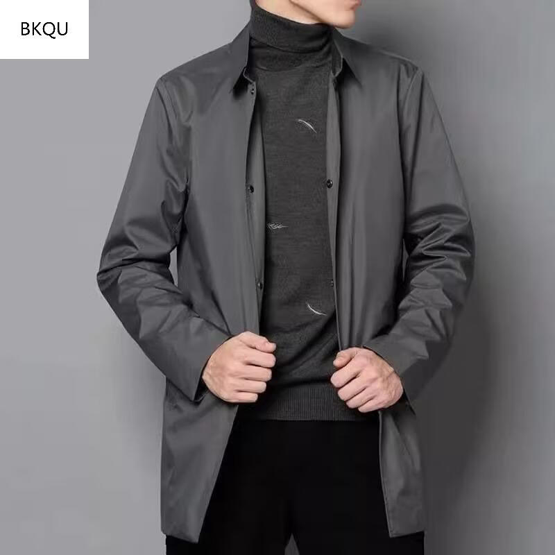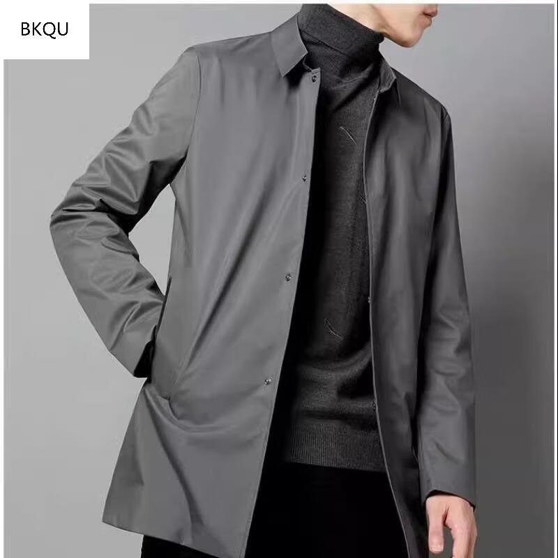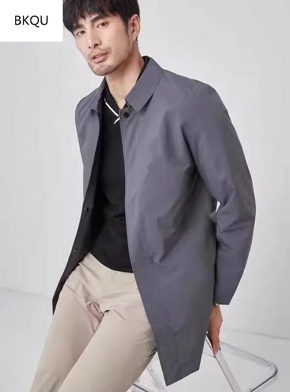 BKQU High-end Laminated Windbreaker Men's Mid-Length Spring and Autumn New Solid Color Simple Men's New Lapel Windbreaker Business Jacket Gray L