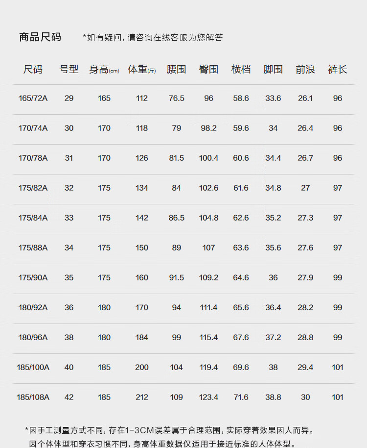 China (cm) 160-165/84-86 165-170 / 88-90 167-172 / 92-96 168-173 / 98-102 170-176 / 106-110