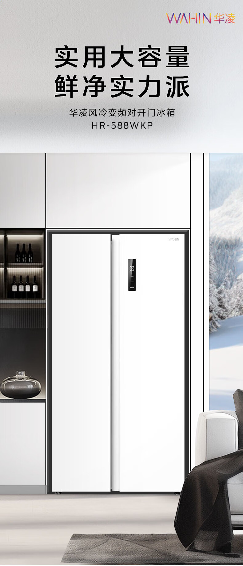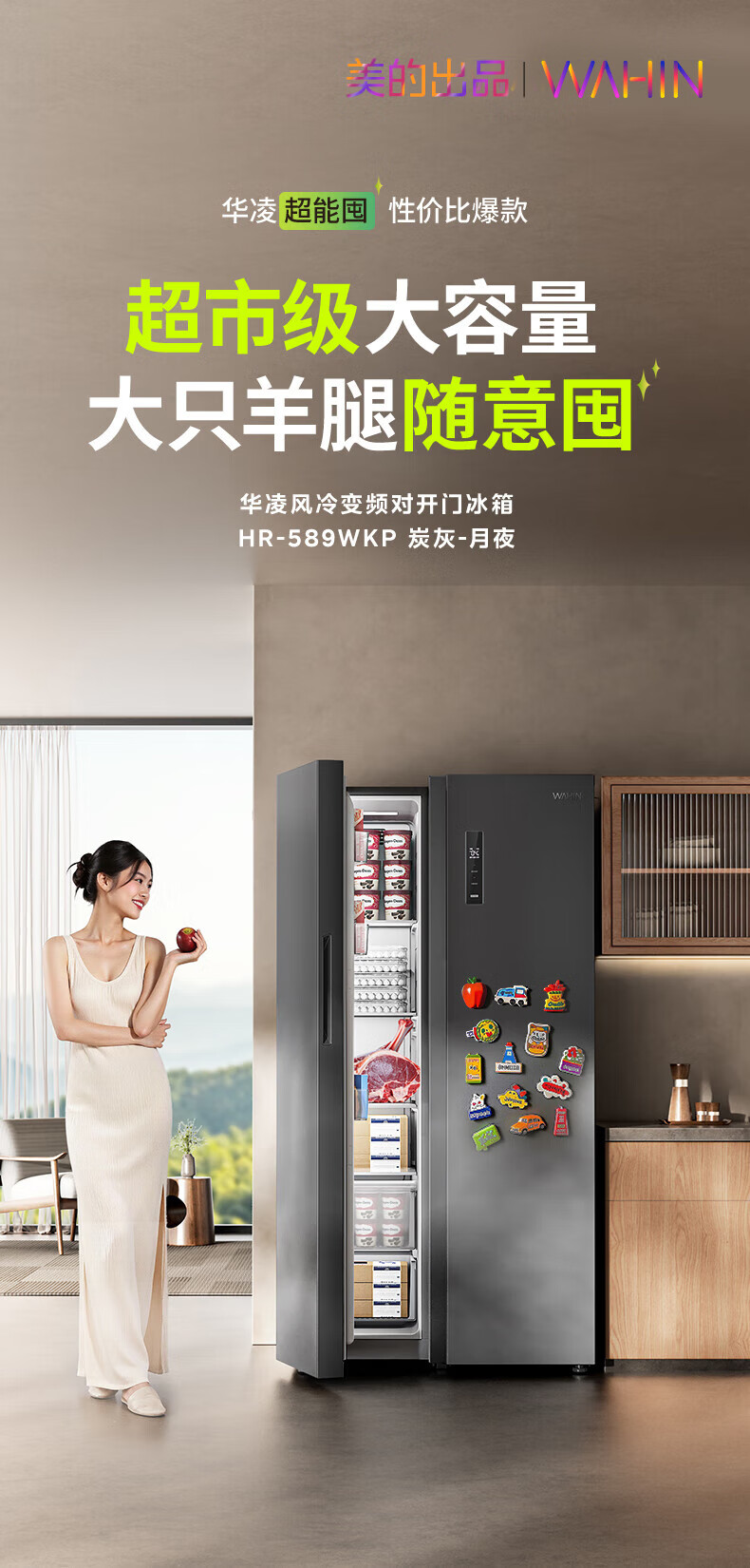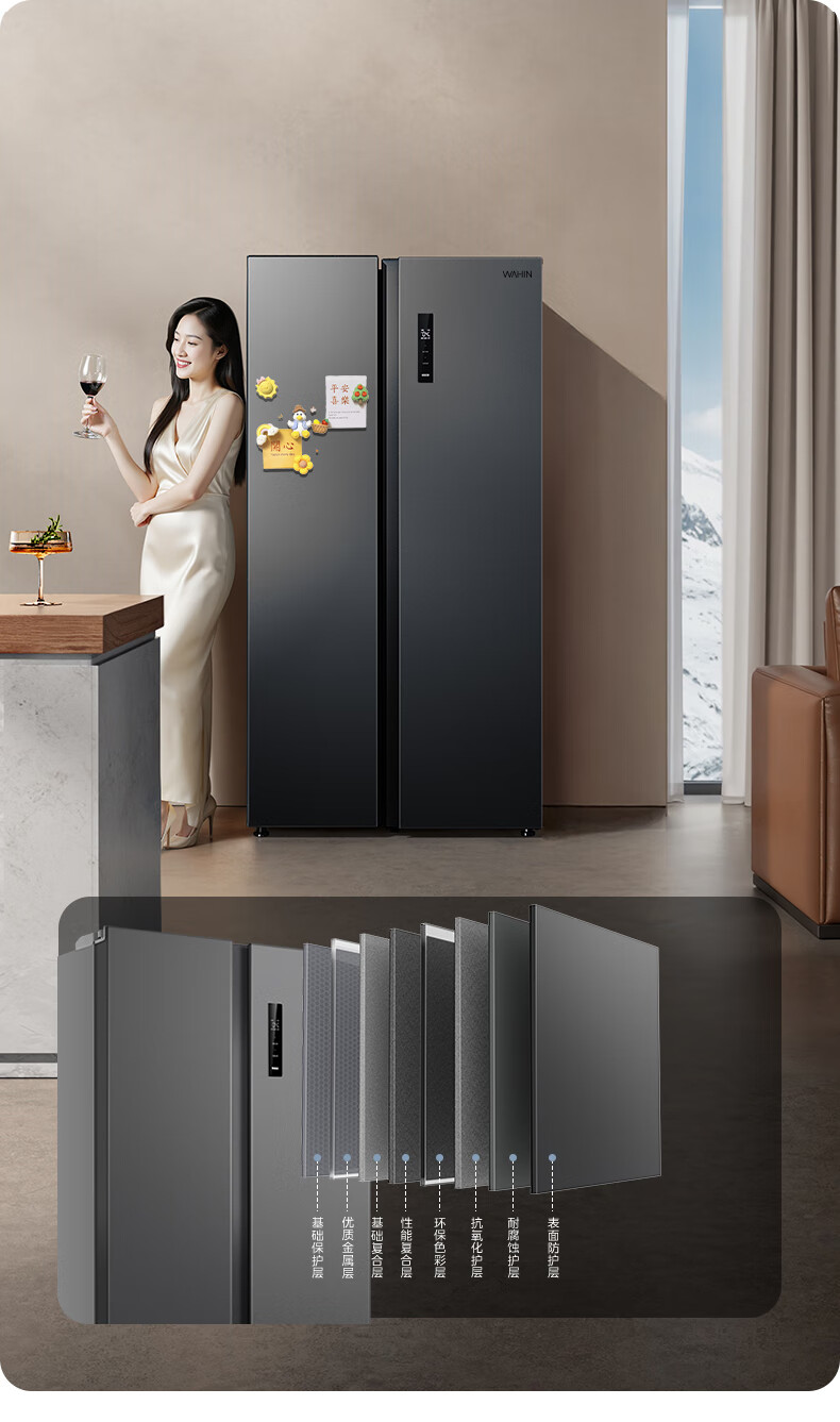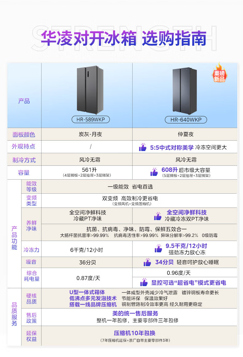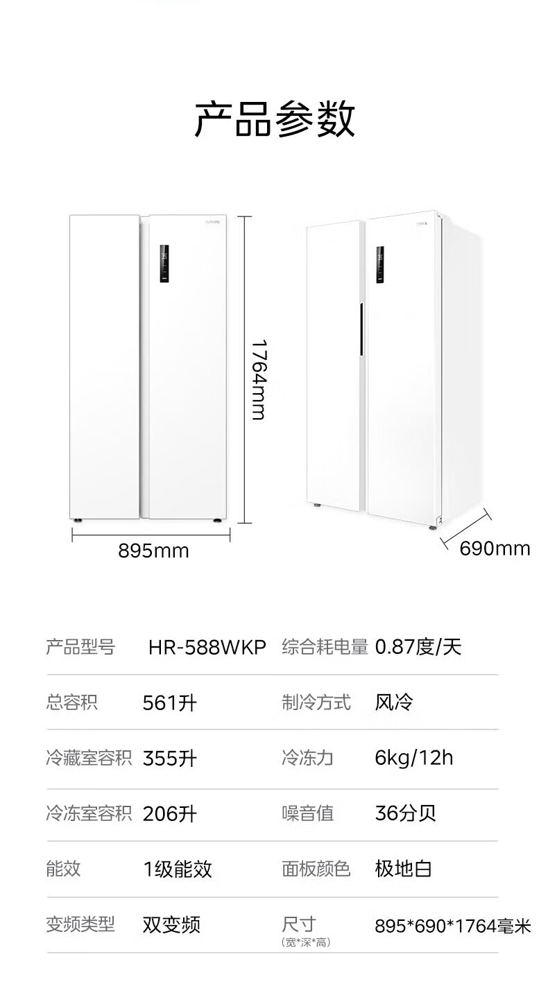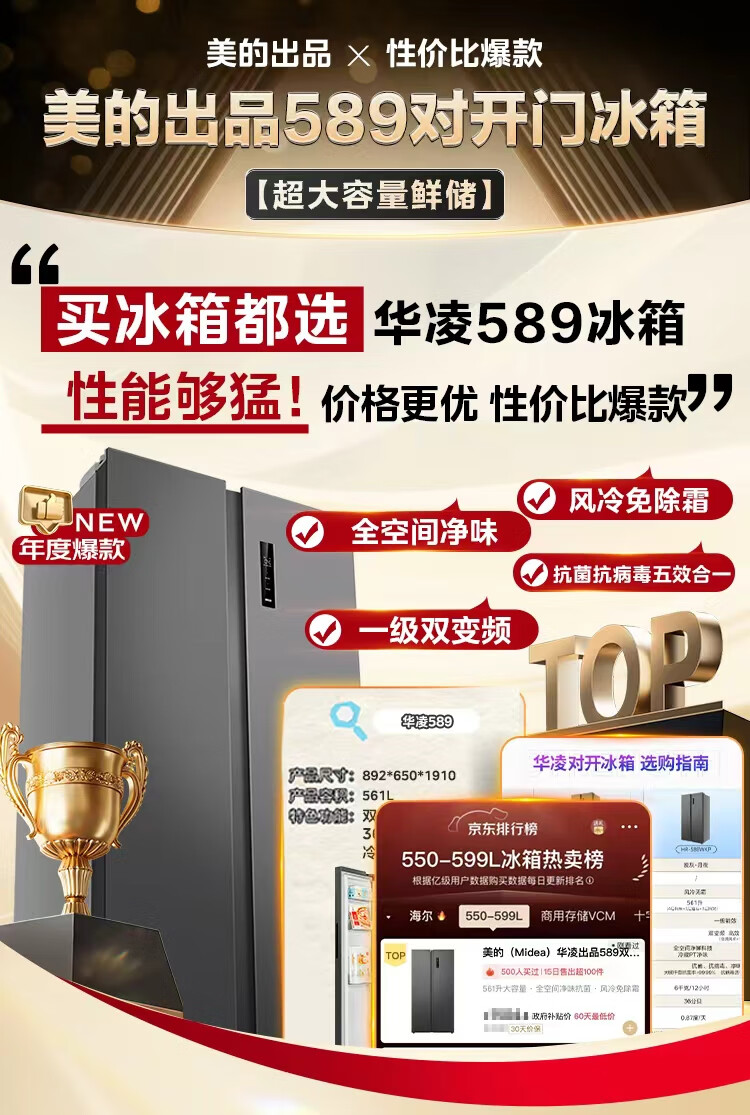 Hualing 589/588 ultra-thin large-capacity double-door refrigerator produced by Midea for home dual-frequency first-class energy-efficiency air-cooled frost-free, odor-free and sterilizing refrigerator has a national subsidy of 20% HR-589WKP