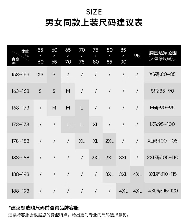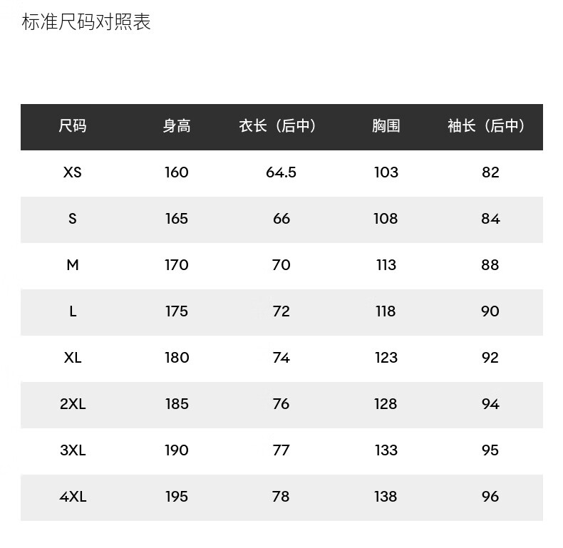 China (cm) 160-165/84-86 165-170 / 88-90 167-172 / 92-96 168-173 / 98-102 170-176 / 106-110