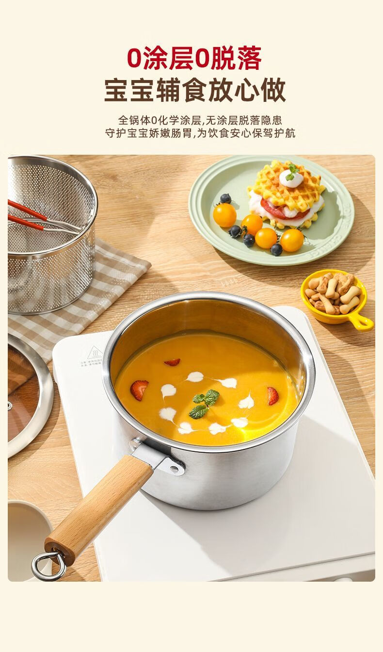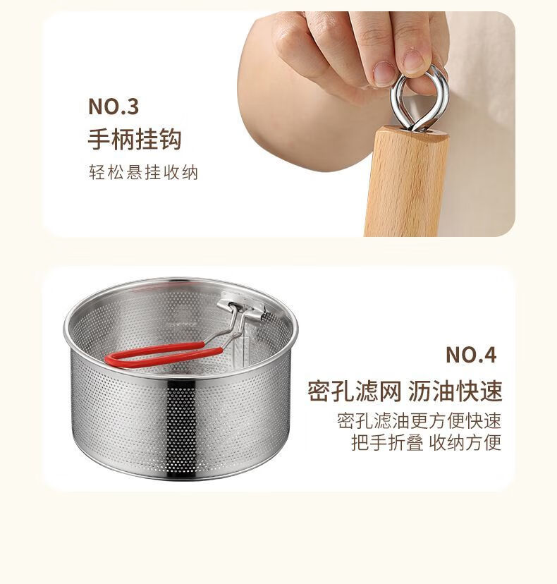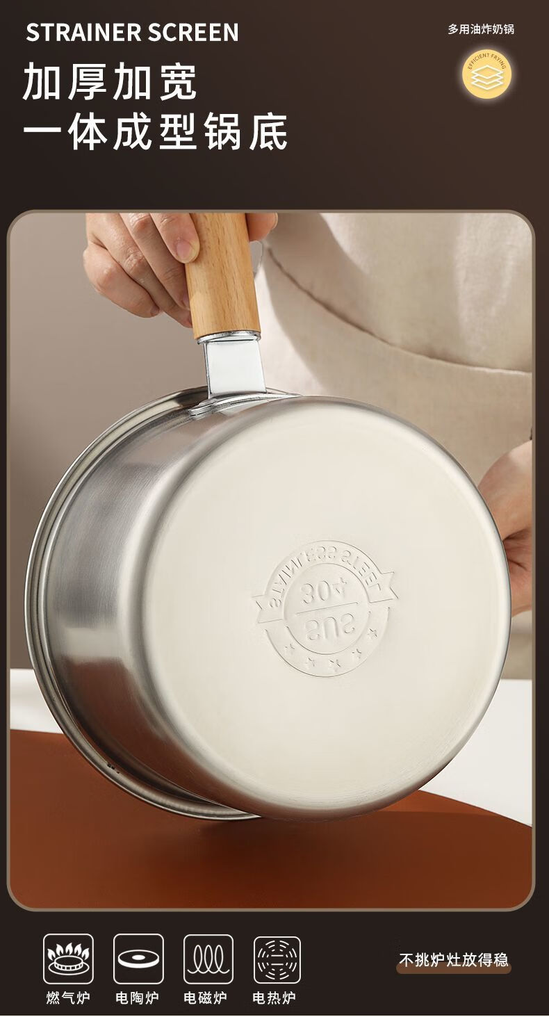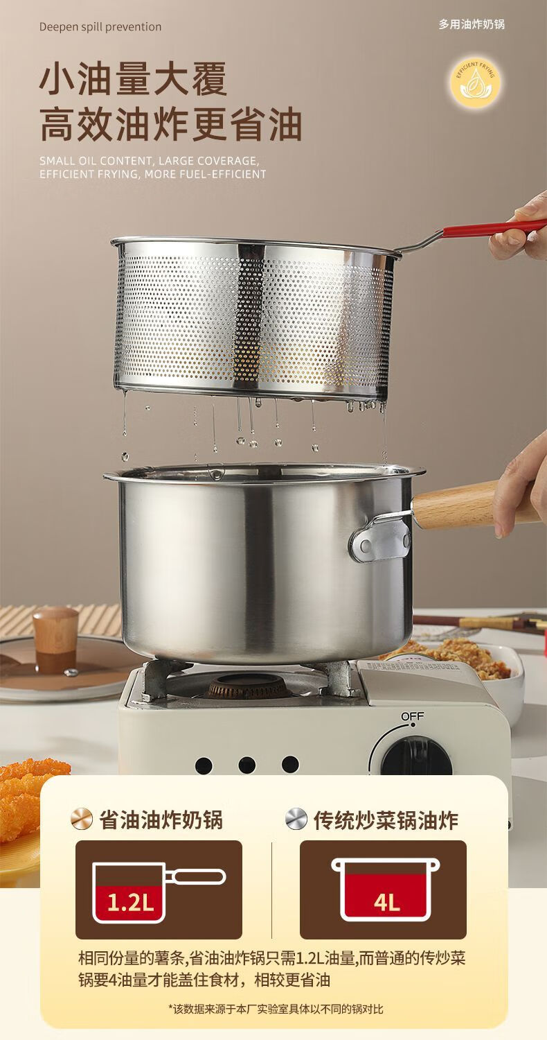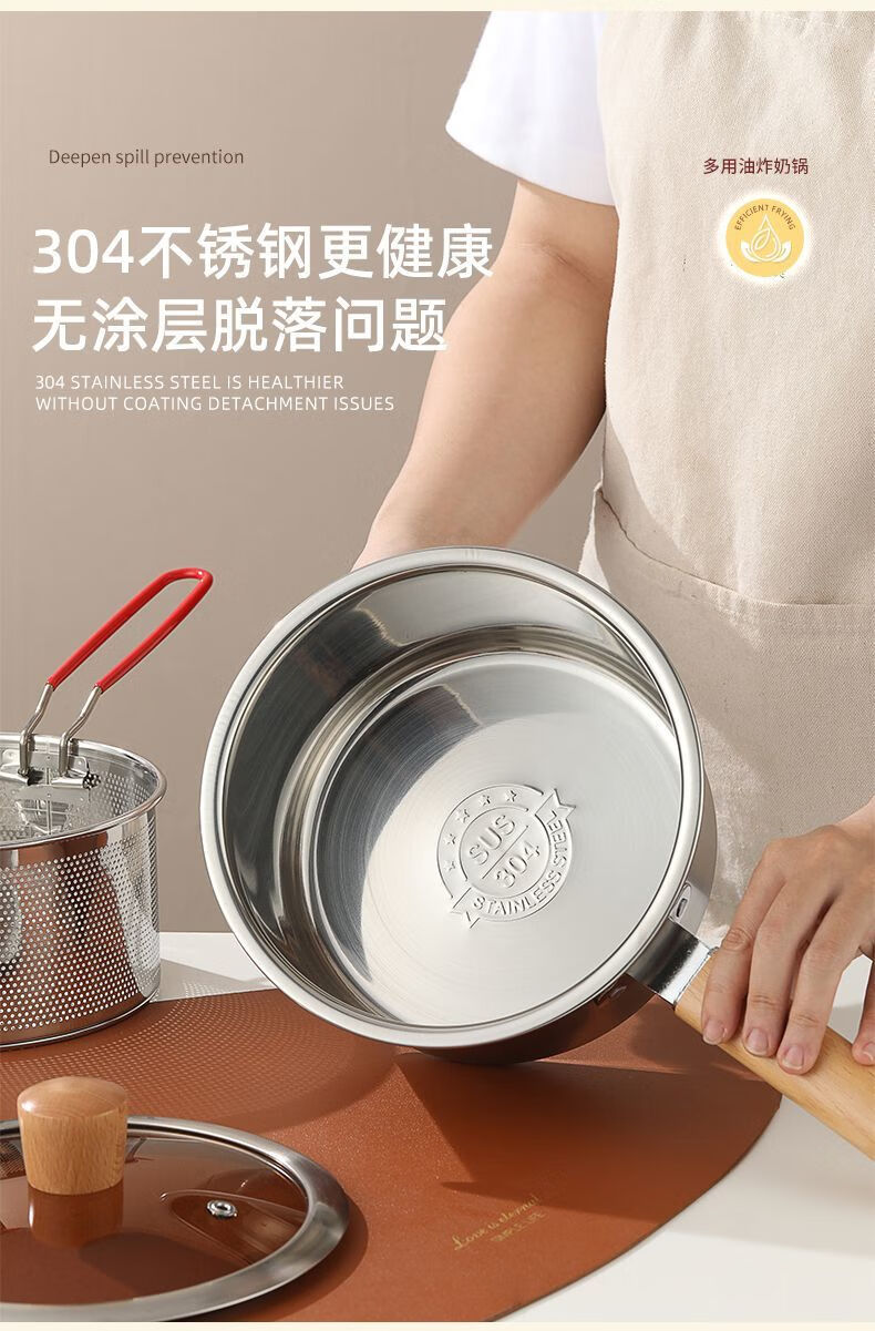 Tuojin Japan imported quality 304 thickened stainless steel multifunctional milk pan fryer baby mini food supplement household oil saves oil and does not splash oil, more convenient for frying 20cm wooden handle milk pan fryer + frying basket + clip
