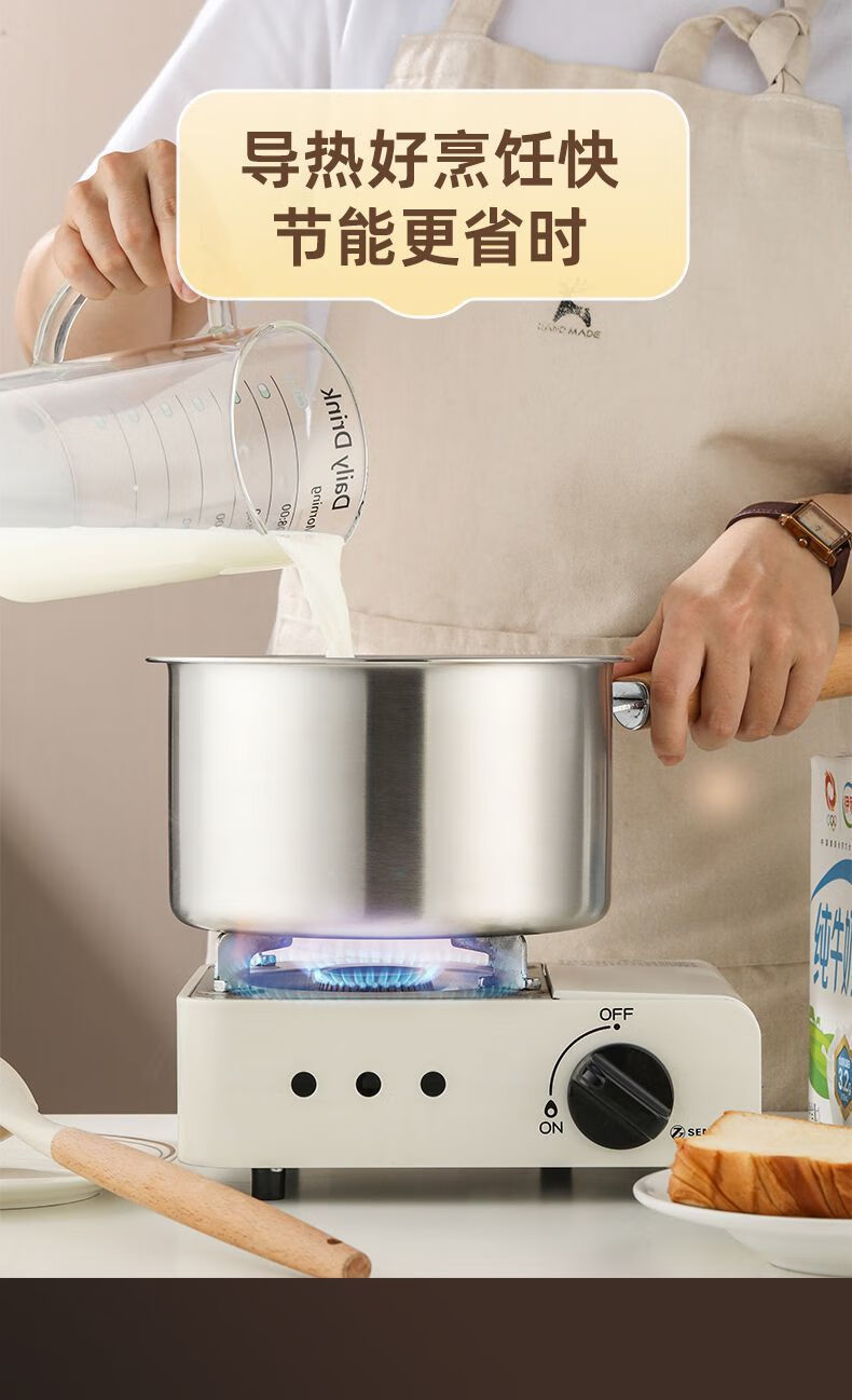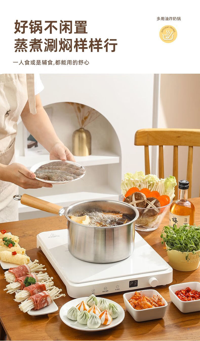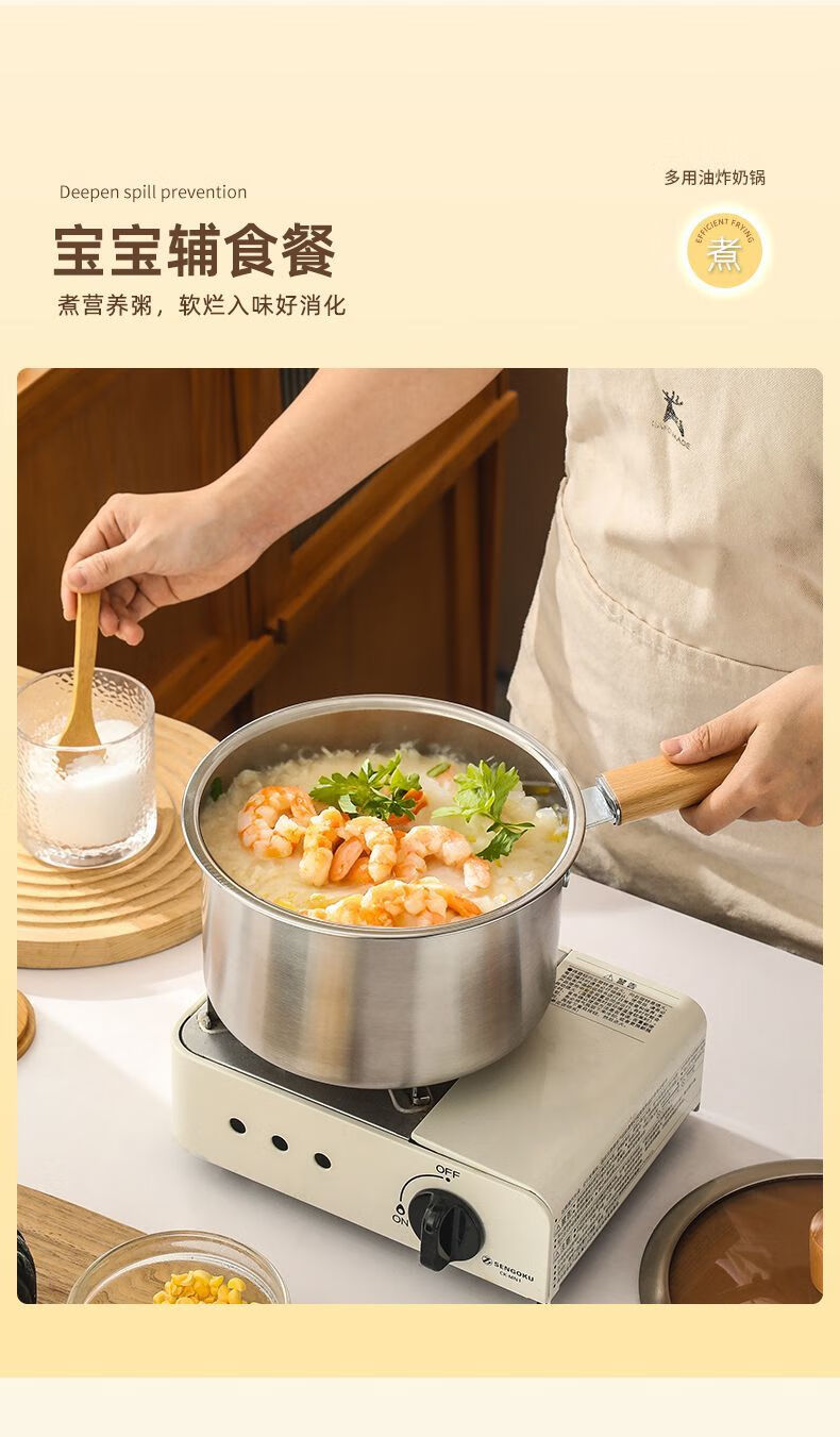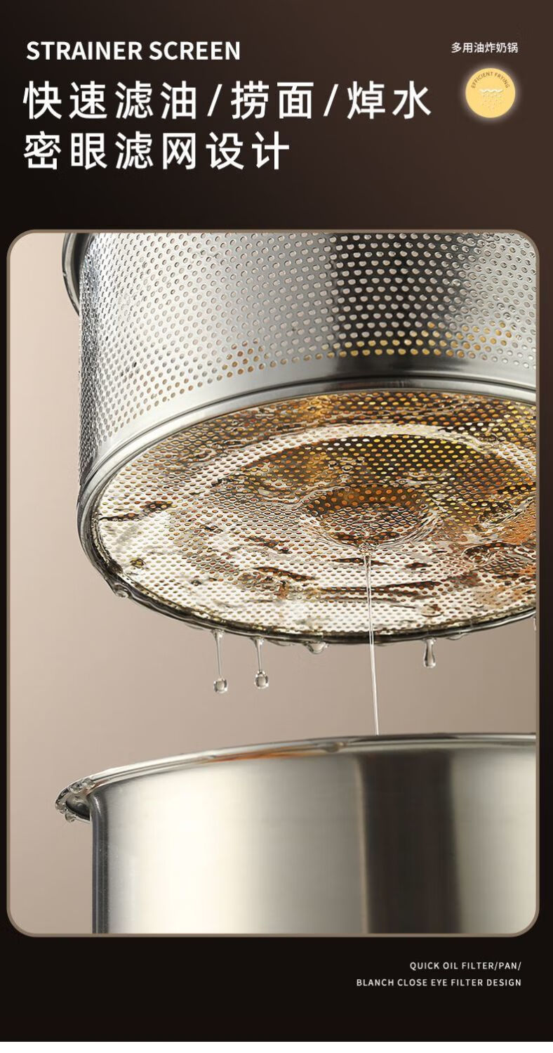 Tuojin Japan imported quality 304 thickened stainless steel multifunctional milk pan fryer baby mini food supplement household oil saves oil and does not splash oil, more convenient for frying 20cm wooden handle milk pan fryer + frying basket + clip