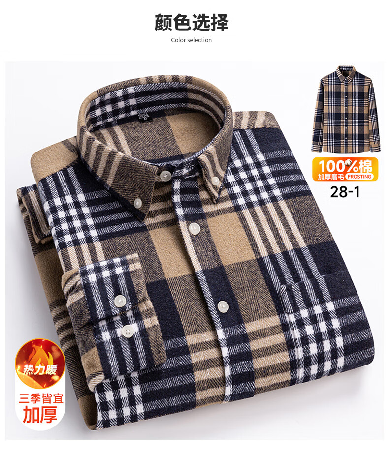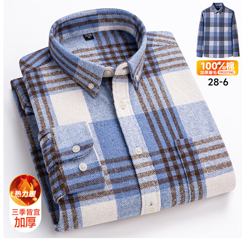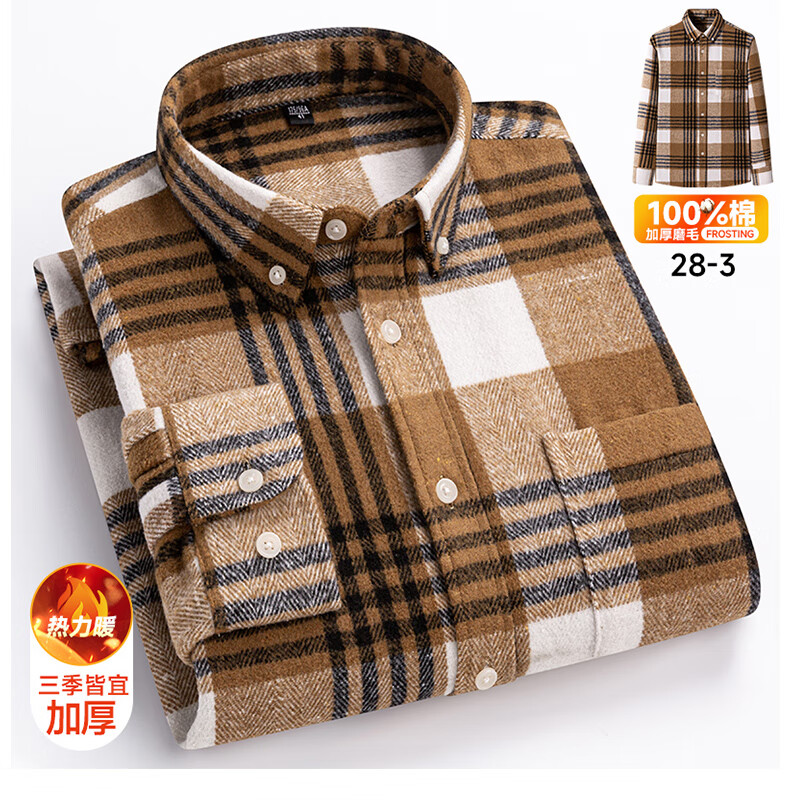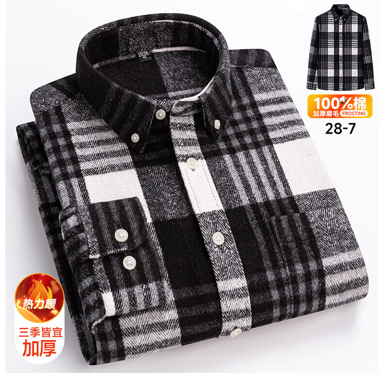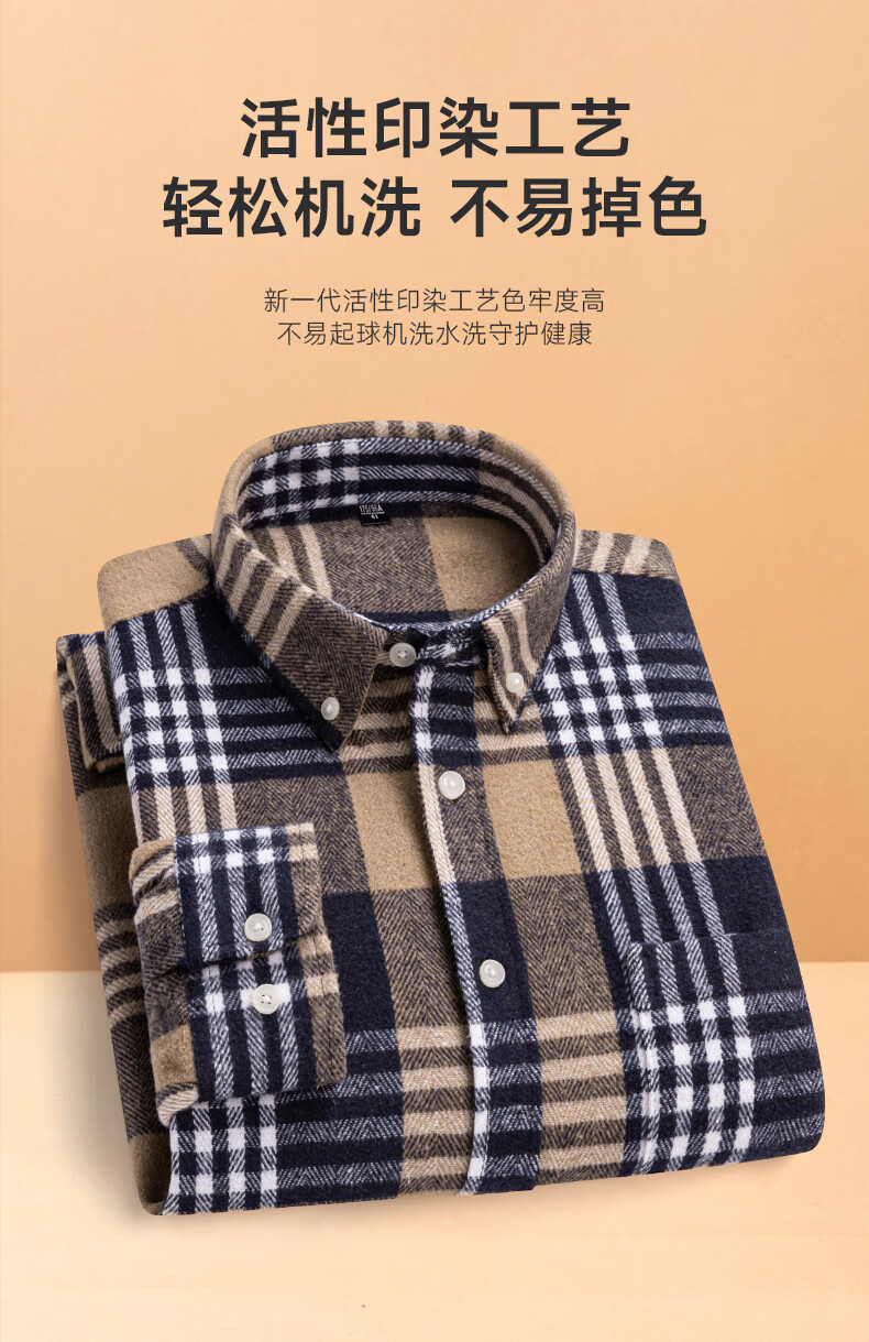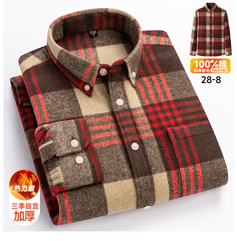 100% pure cotton thickened brushed plaid men's long-sleeved shirt casual loose large size autumn and winter warm and anti-lint 28-8 41 recommended 125-140 Jin Jin equals 0.5 kg