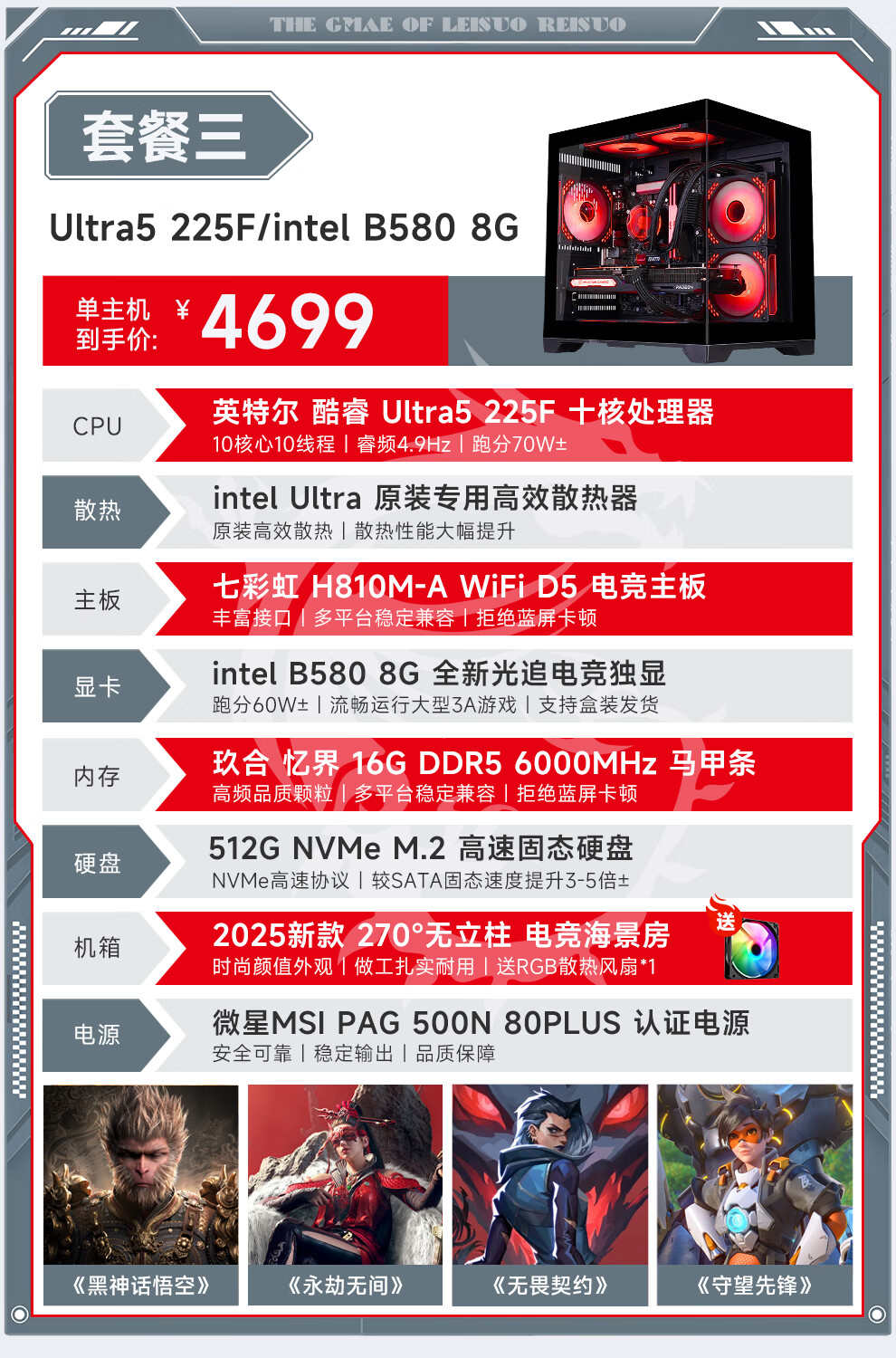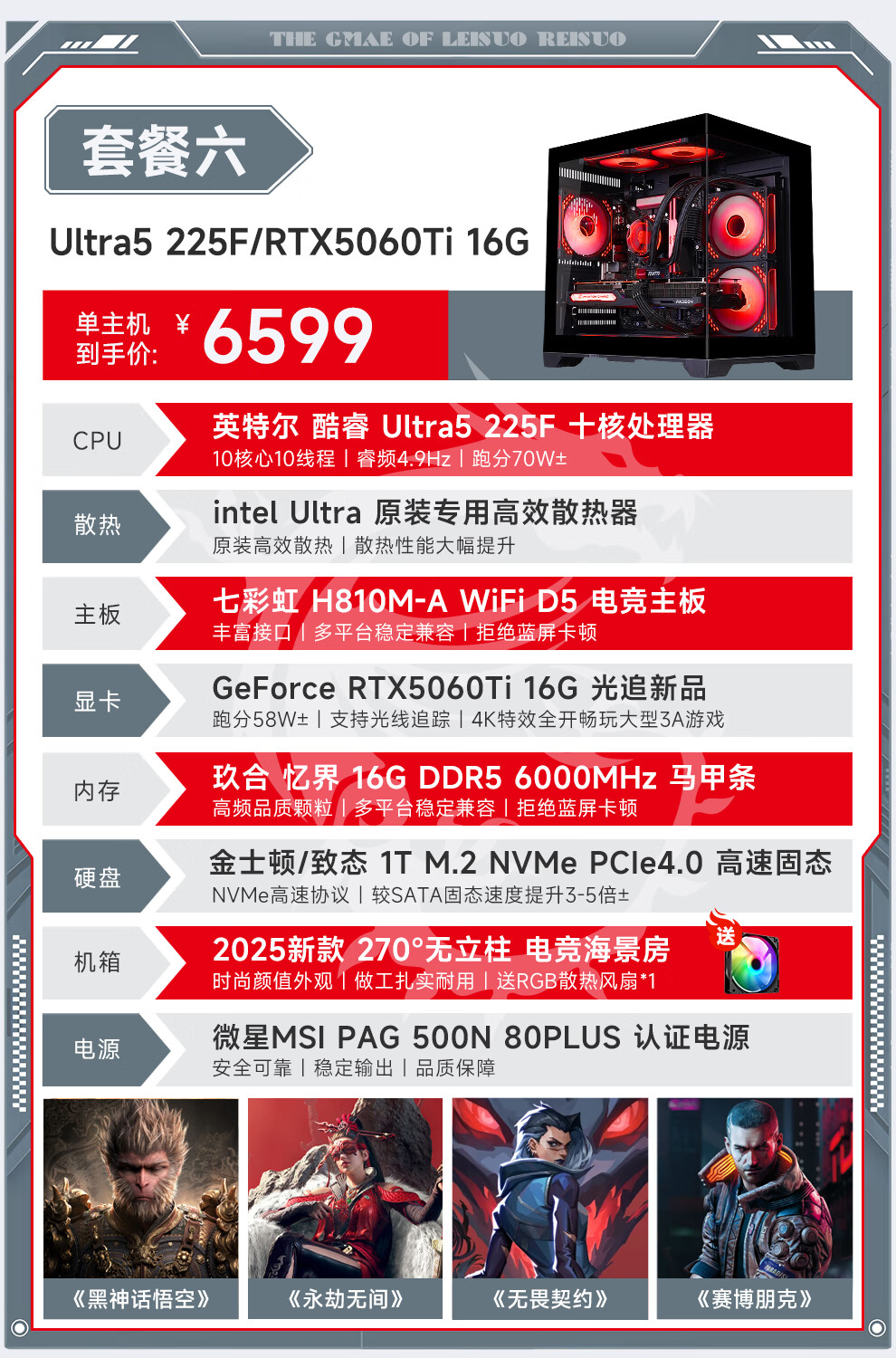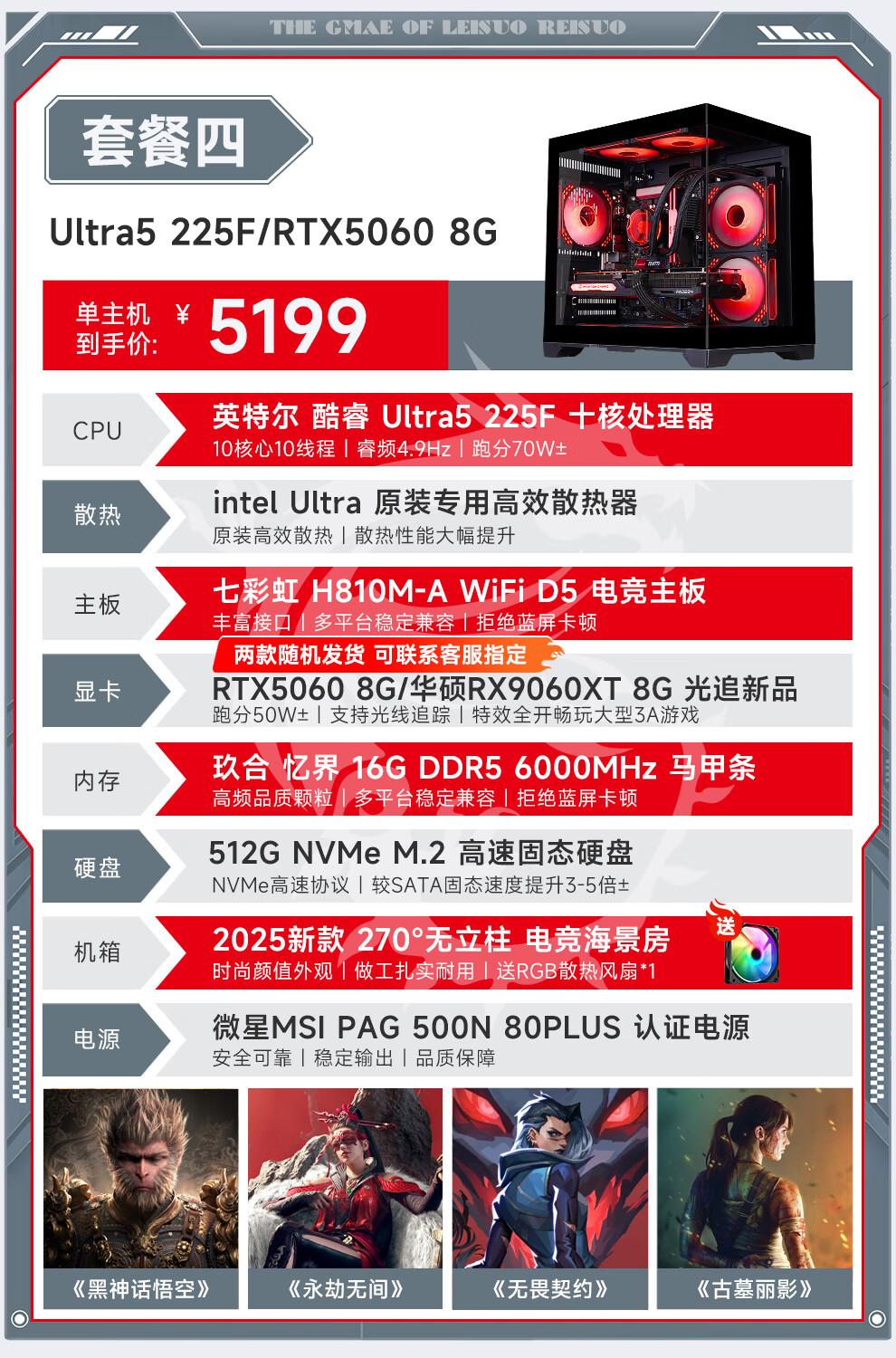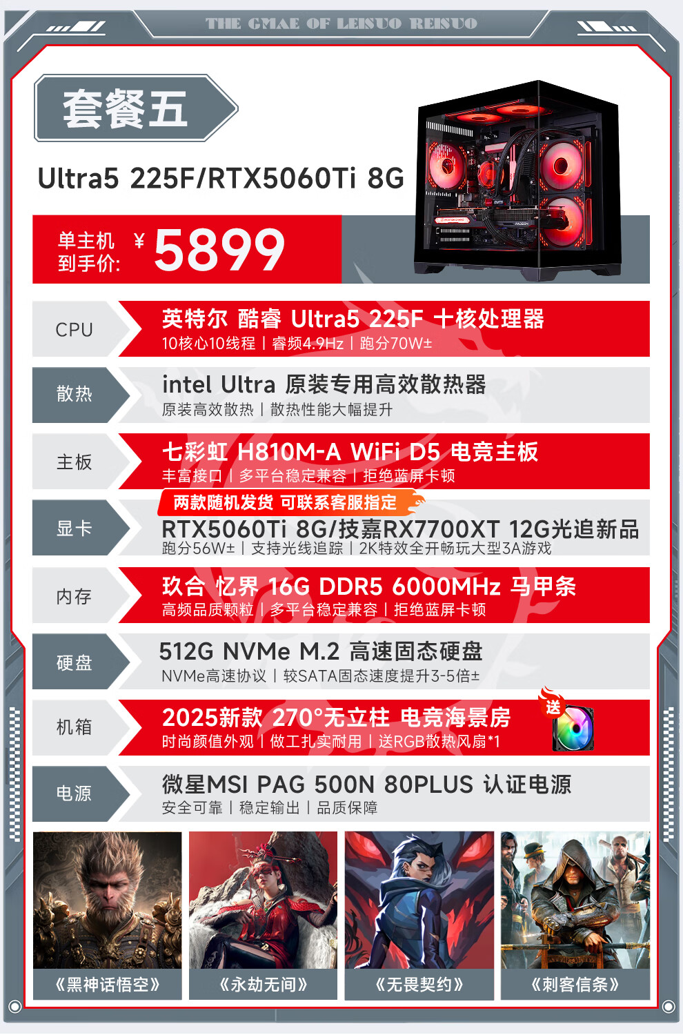 MSI Core Ultra5 225F/RTX5060Ti/5060 e-sports game chicken and tile delta desktop assembly computer host rendering DIY assembly machine configuration four Ultra5 225F丨RTX5060