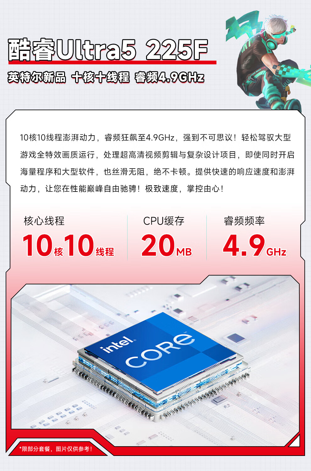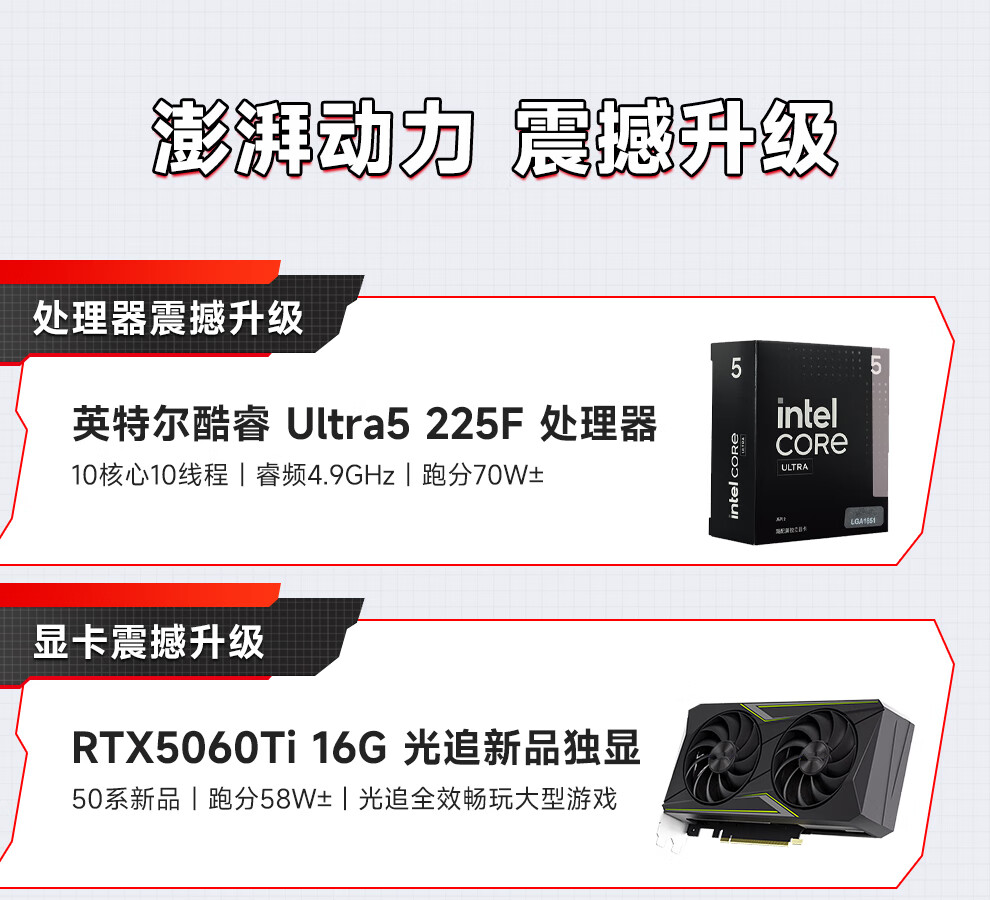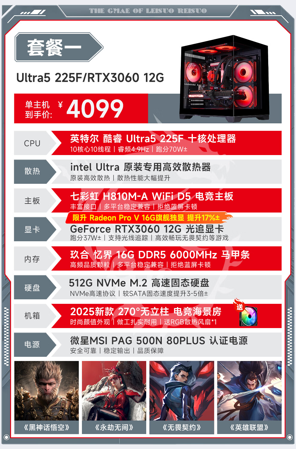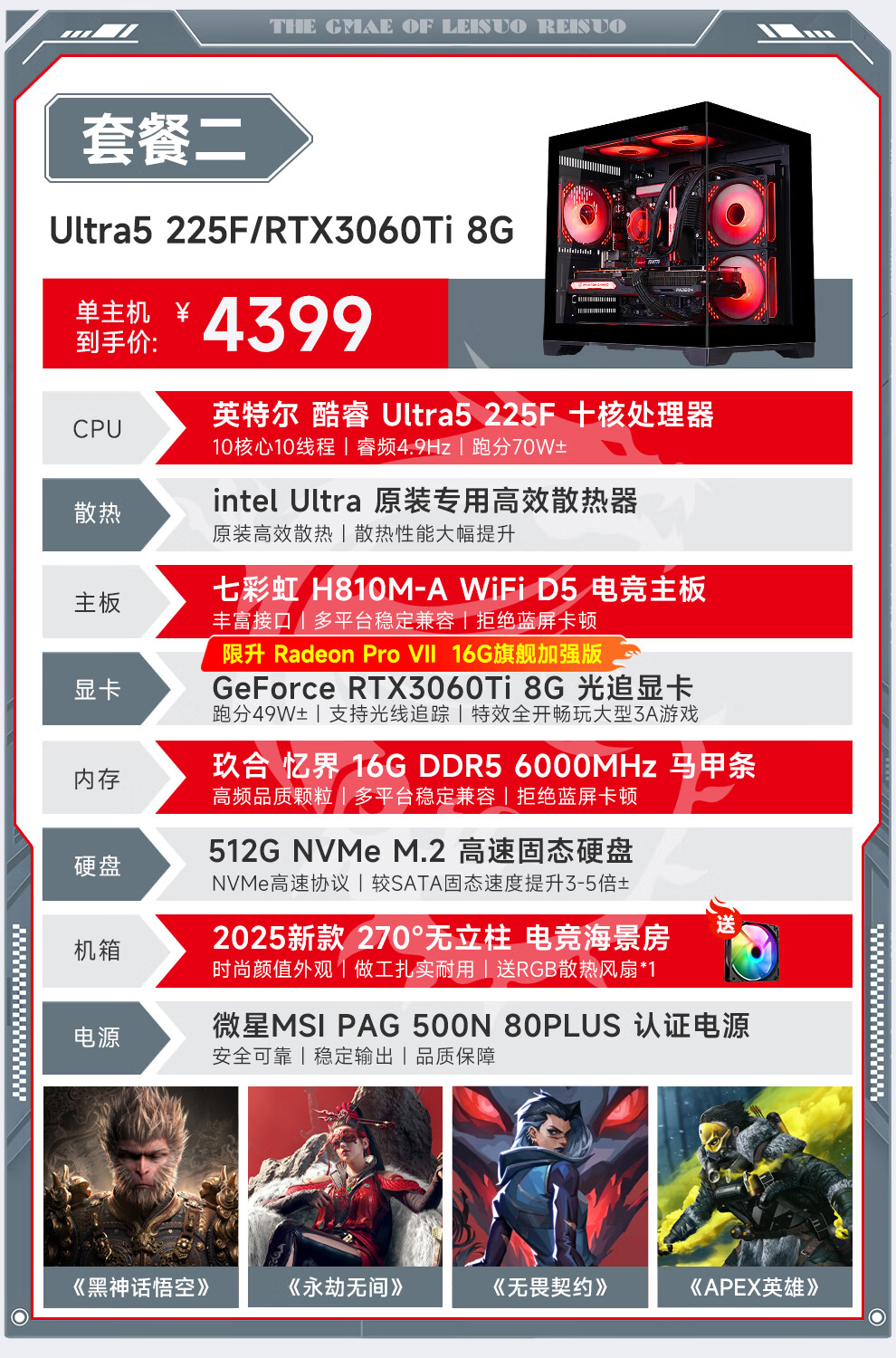 MSI Core Ultra5 225F/RTX5060Ti/5060 e-sports game chicken and tile delta desktop assembly computer host rendering DIY assembly machine configuration four Ultra5 225F丨RTX5060
