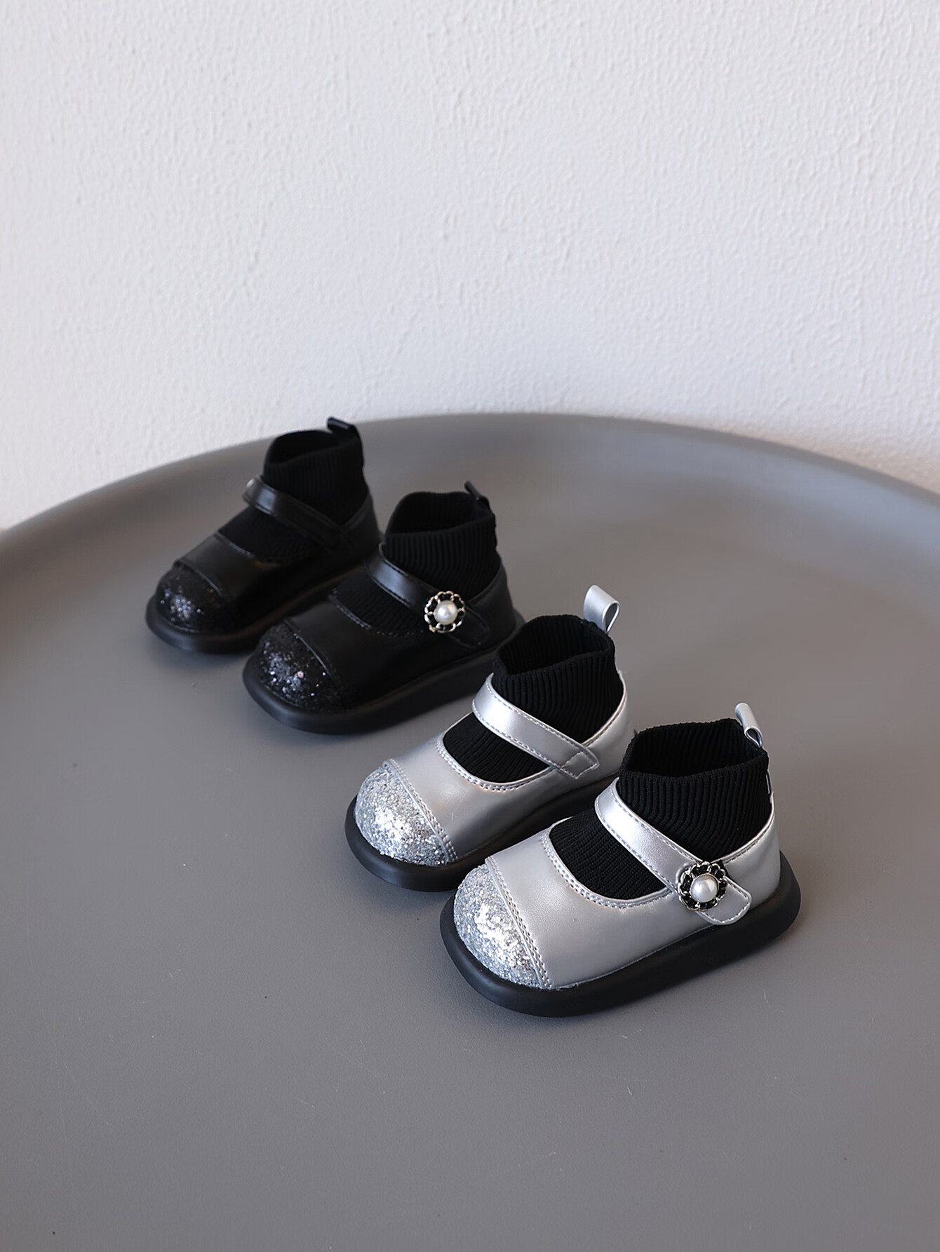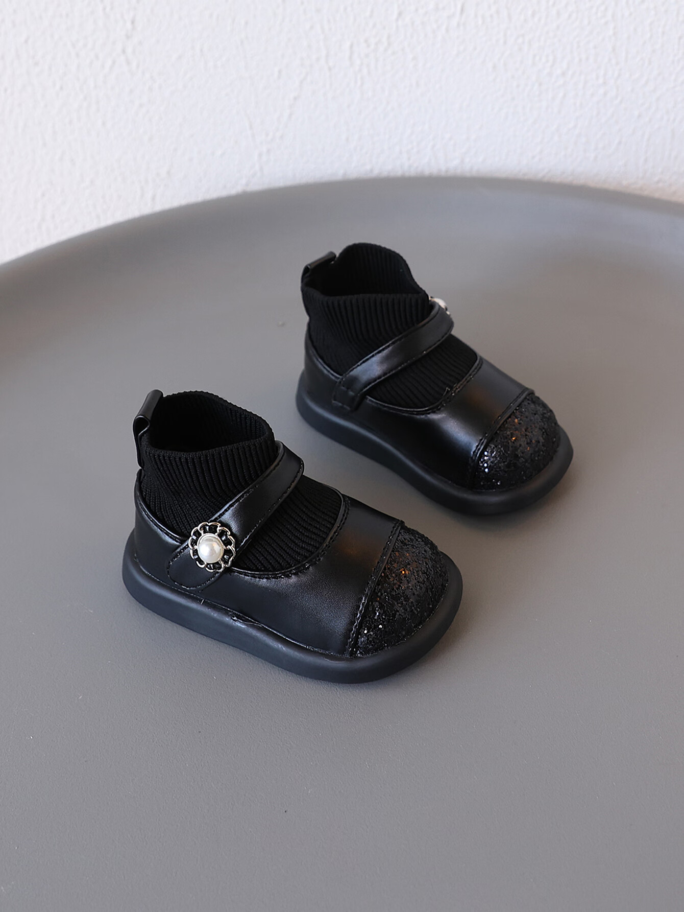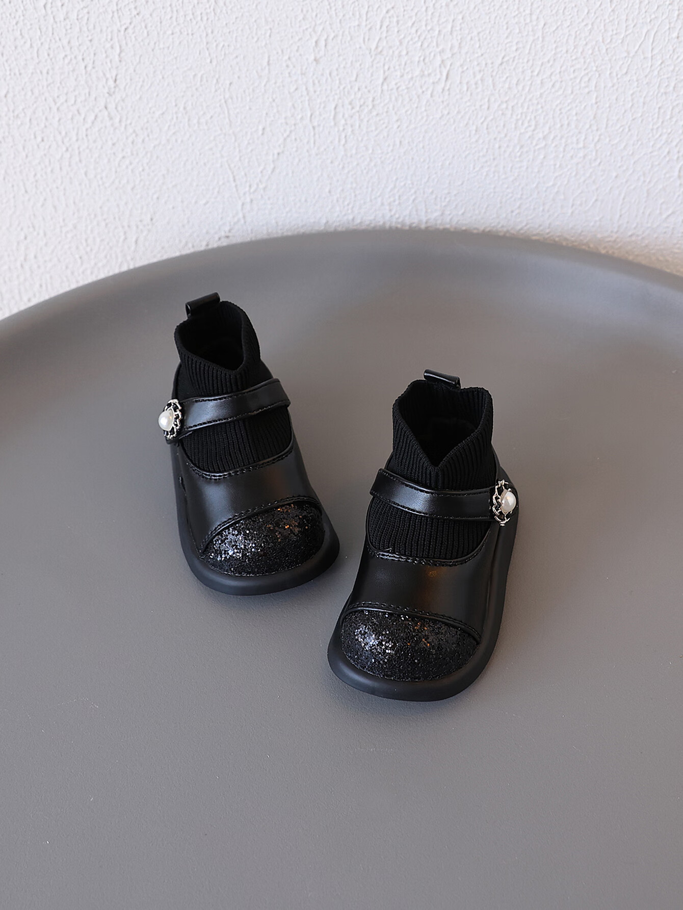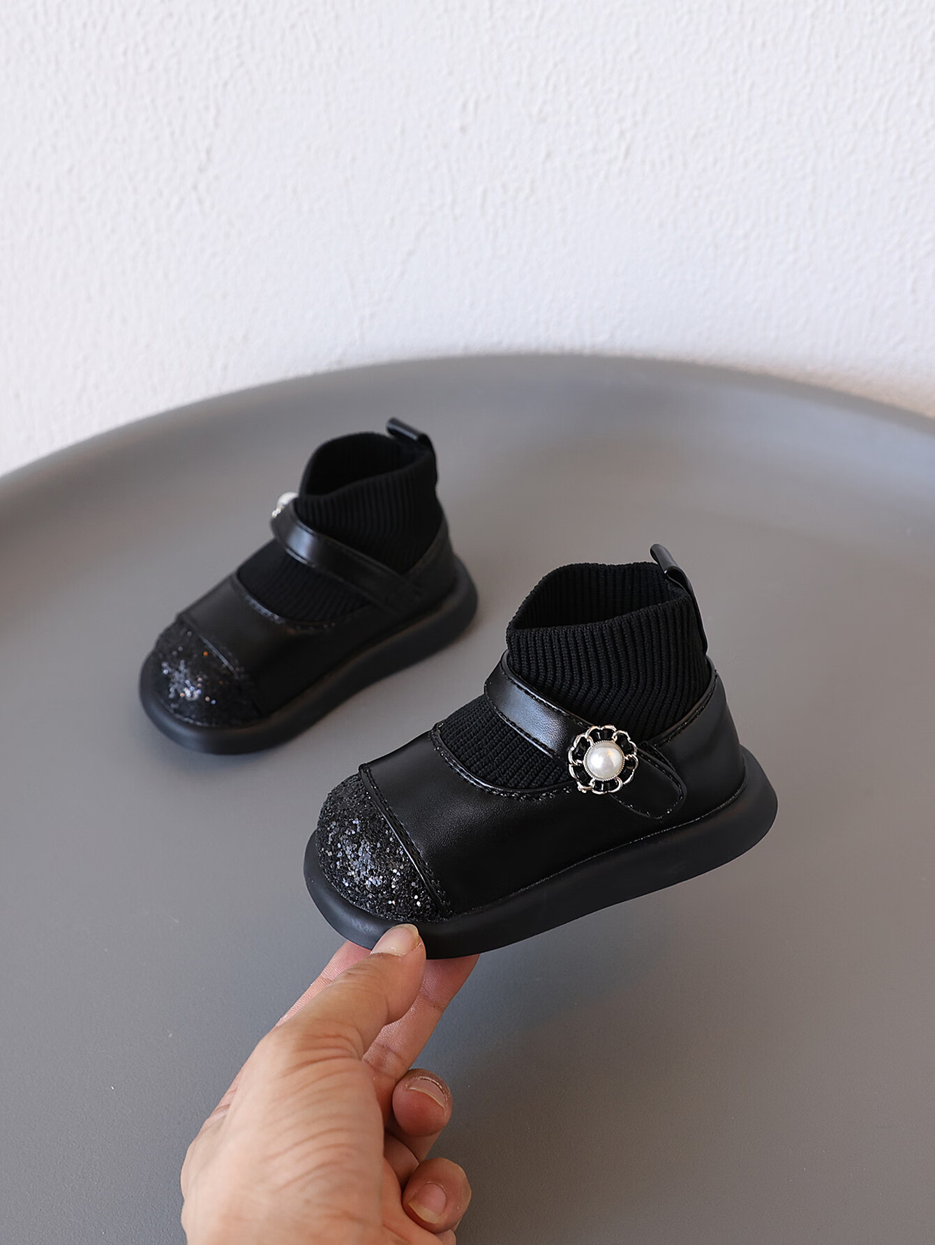 Autumn and winter fashionable children's shoes leather boots girls short boots princess baby non-slip toddler shoes girls sequined Martin boots black plus velvet 15 inner length 12cm
