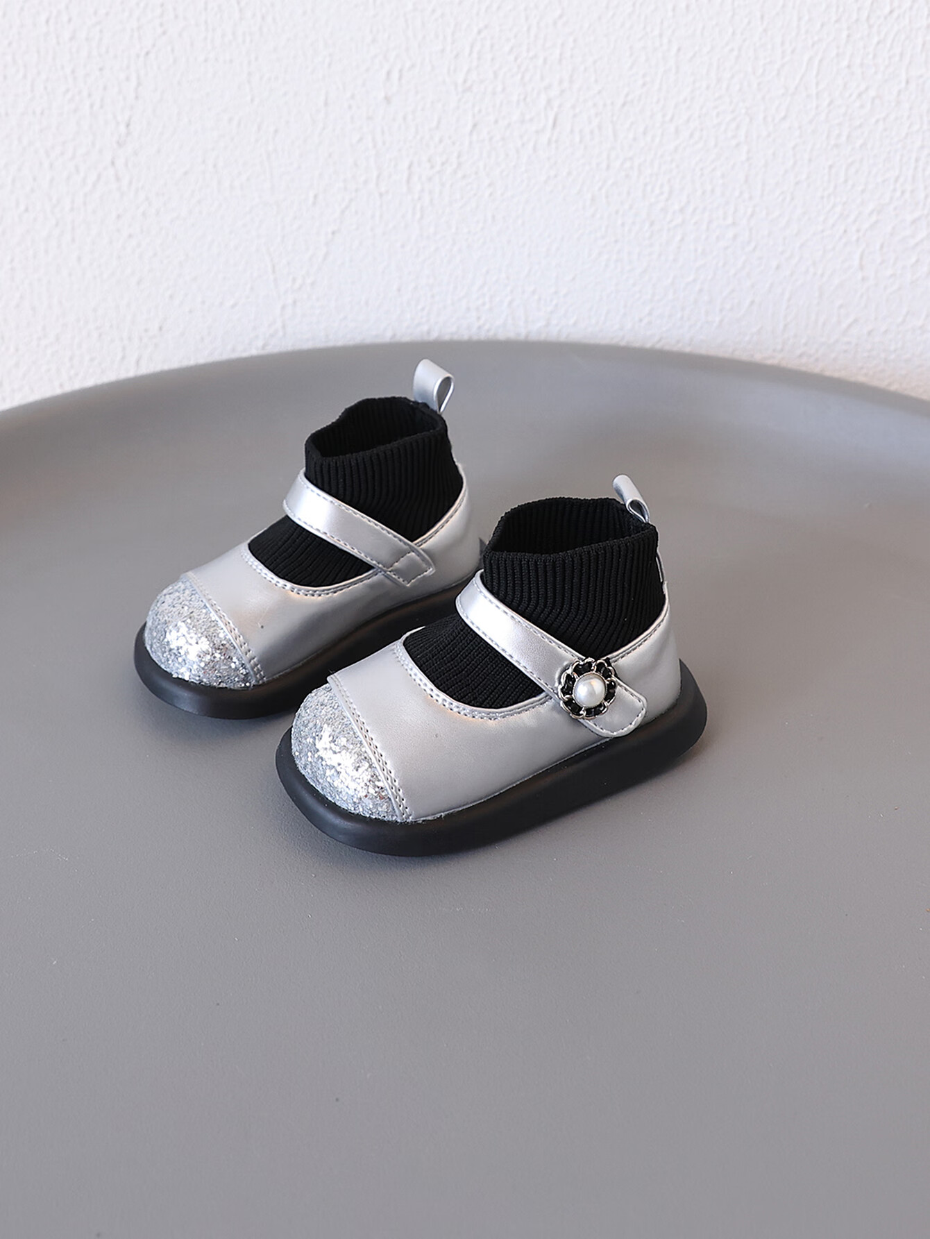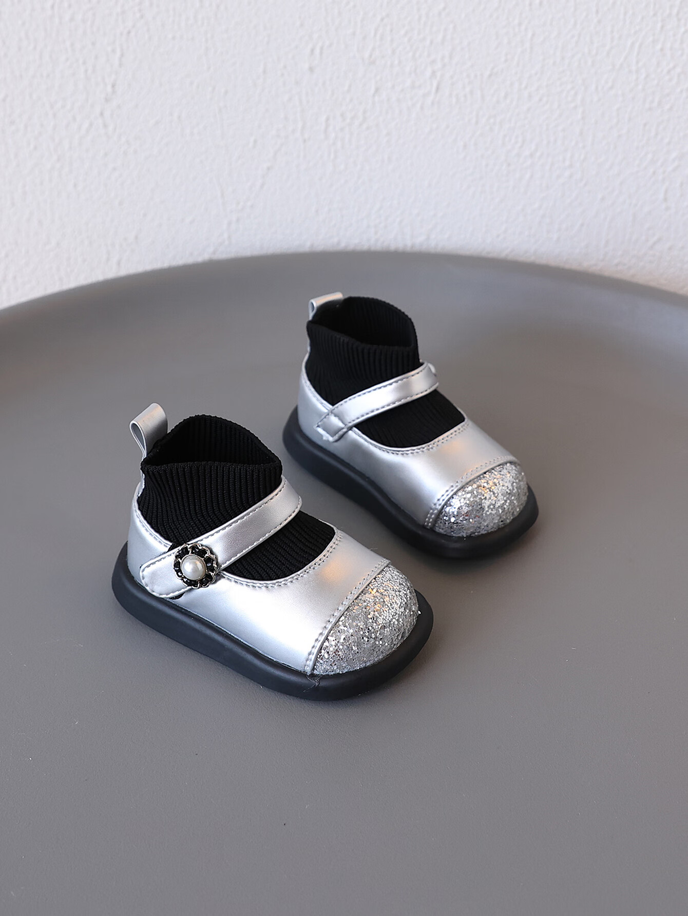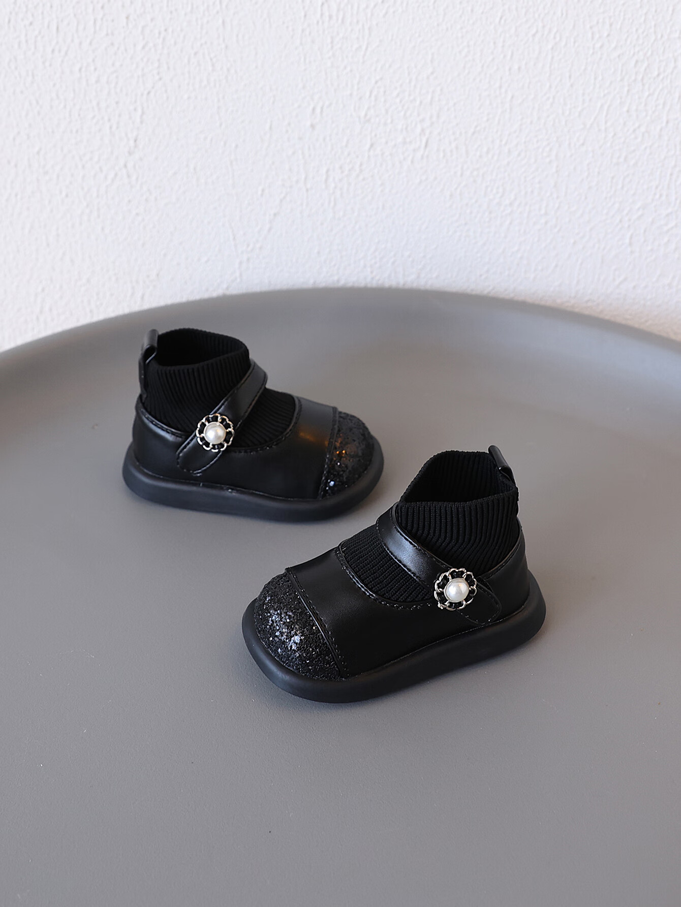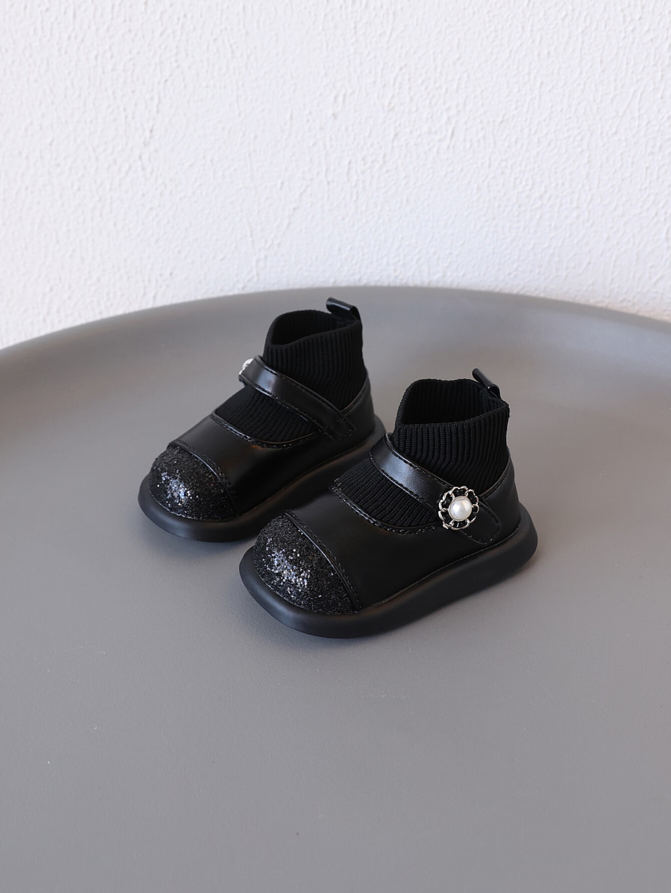 Autumn and winter fashionable children's shoes leather boots girls short boots princess baby non-slip toddler shoes girls sequined Martin boots black plus velvet 15 inner length 12cm