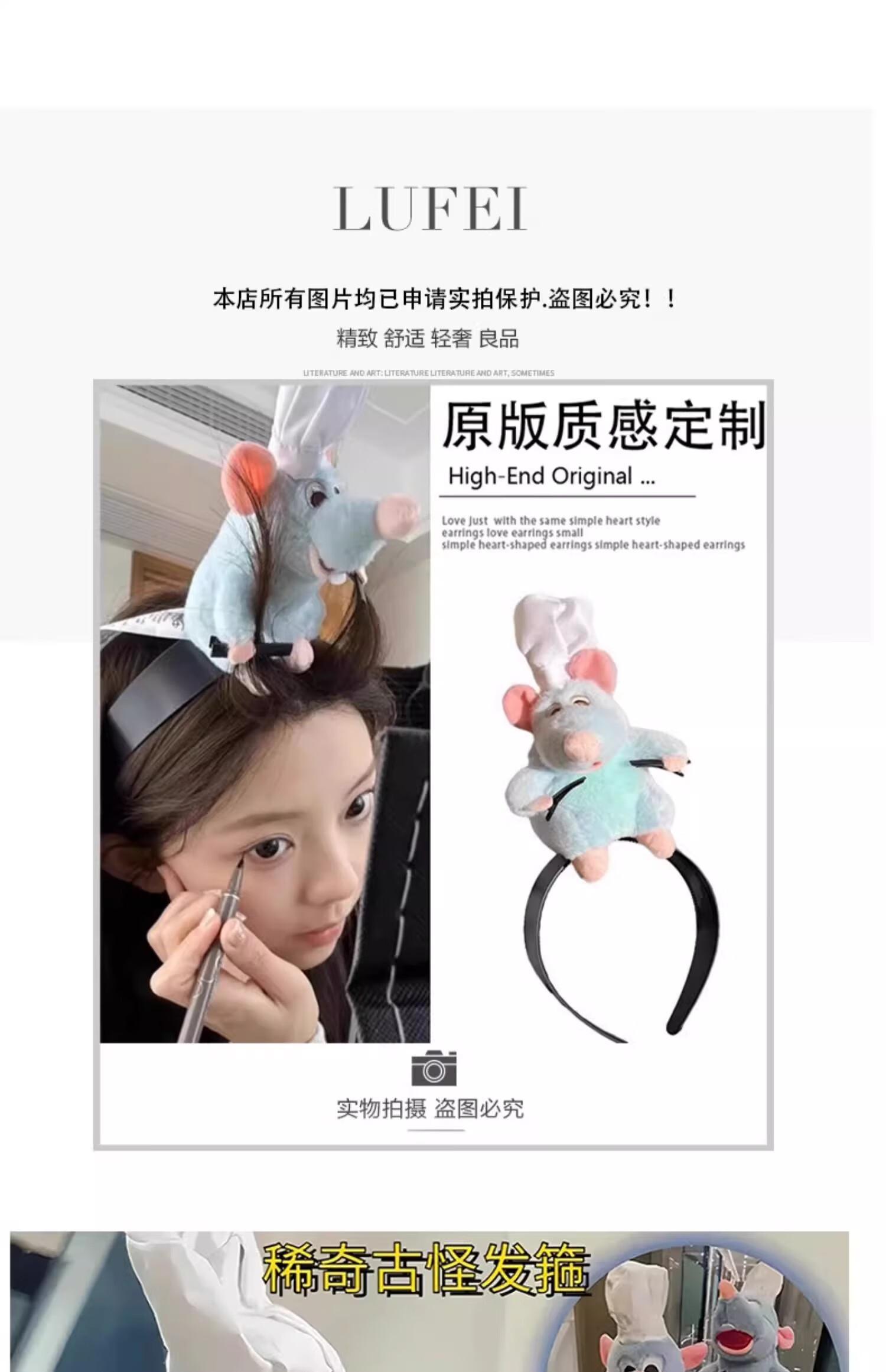 Ratatouille funny headband for women, cute and funny creative cartoon doll headband, funny hair clip headband, funny little mouse headband