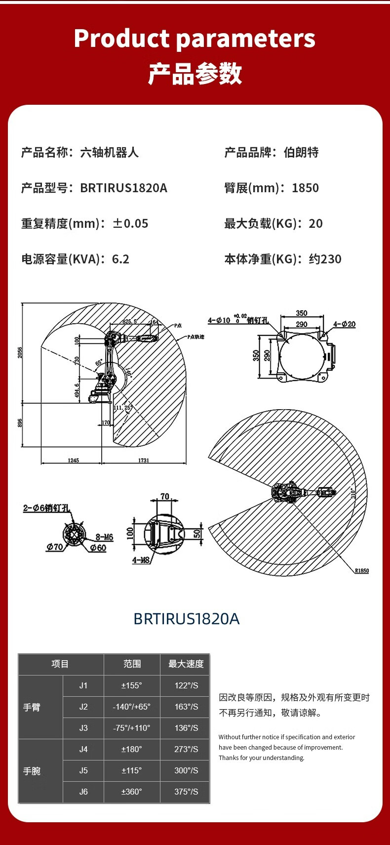 Yue Changsheng Bronte six-axis welding robot industrial robot arm injection molding lathe loading and unloading 1820 BRTIRUS2110A