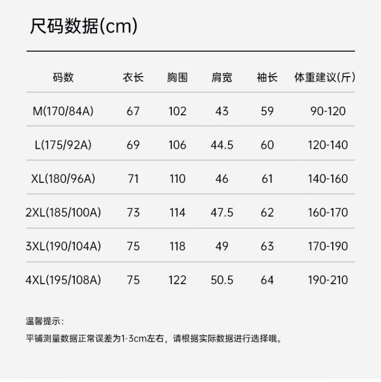 China (cm) 165 / 88-90 170 / 96-98 175 / 108-110 180 / 118-122 185 / 126-130