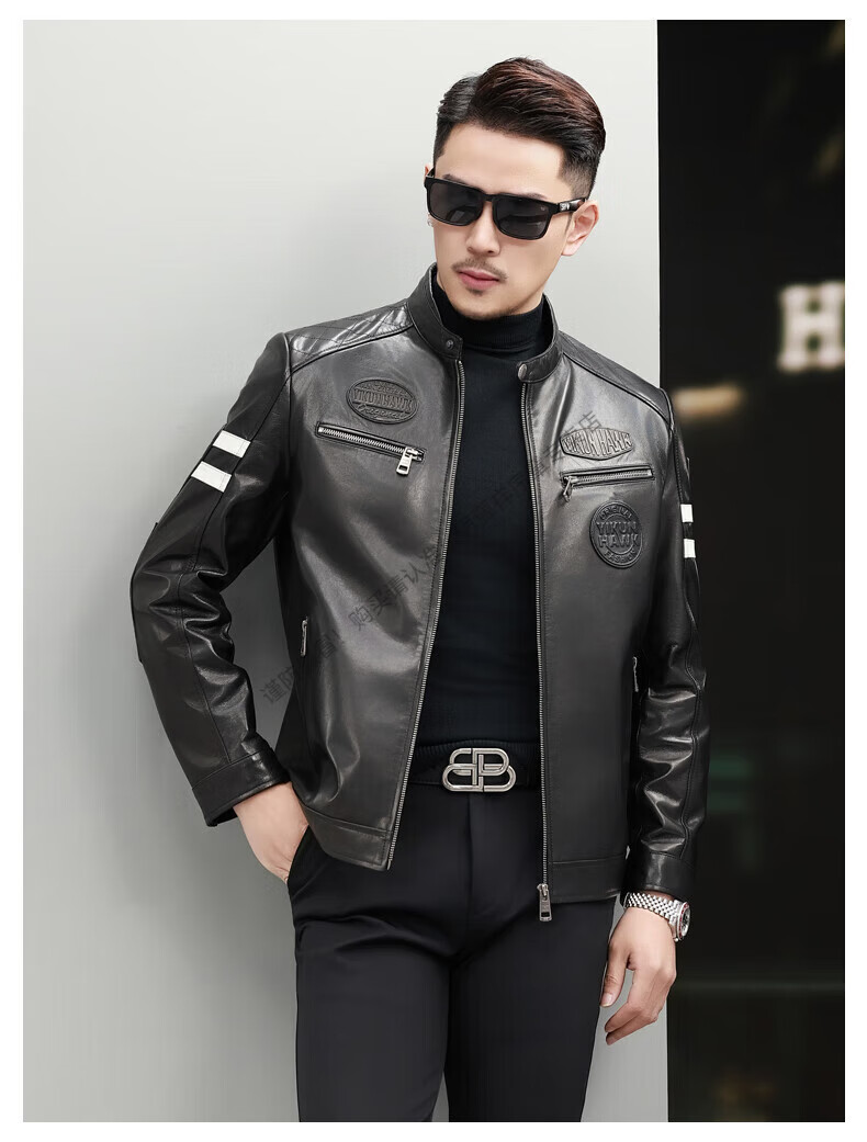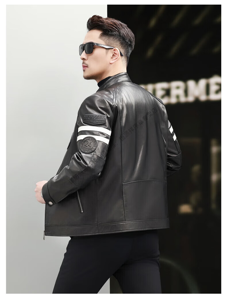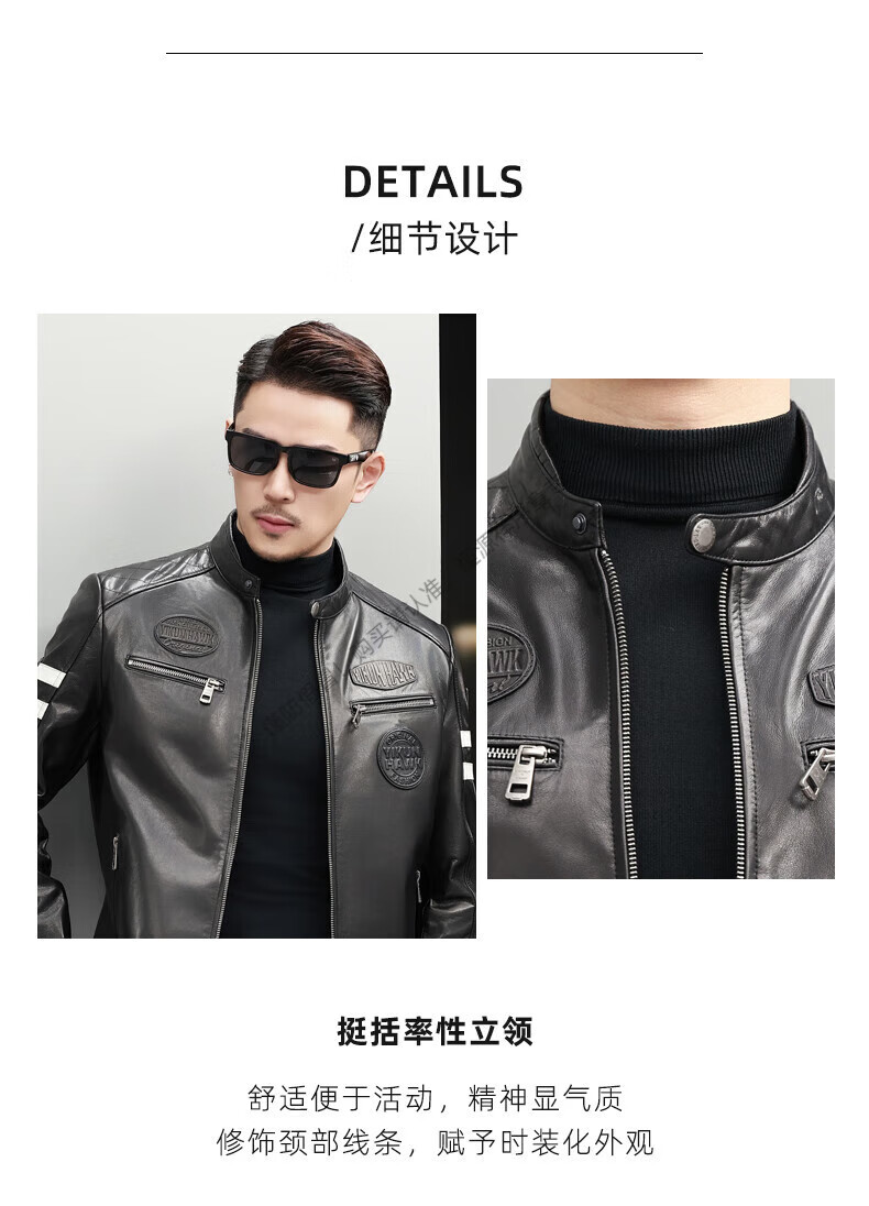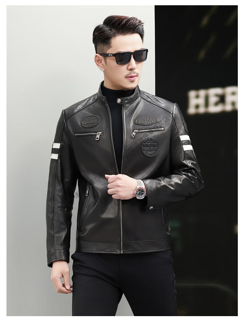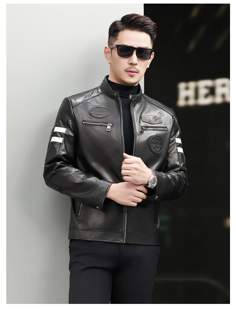 Hengyuanxiang Haining first layer cowhide leather jacket men's leather jacket short stand collar spring and autumn handsome motorcycle riding jacket black regular L 50 125-140Jin Jin equals 0.5 kg