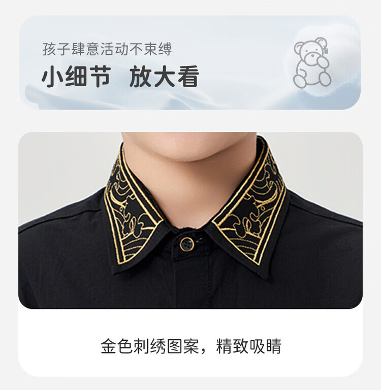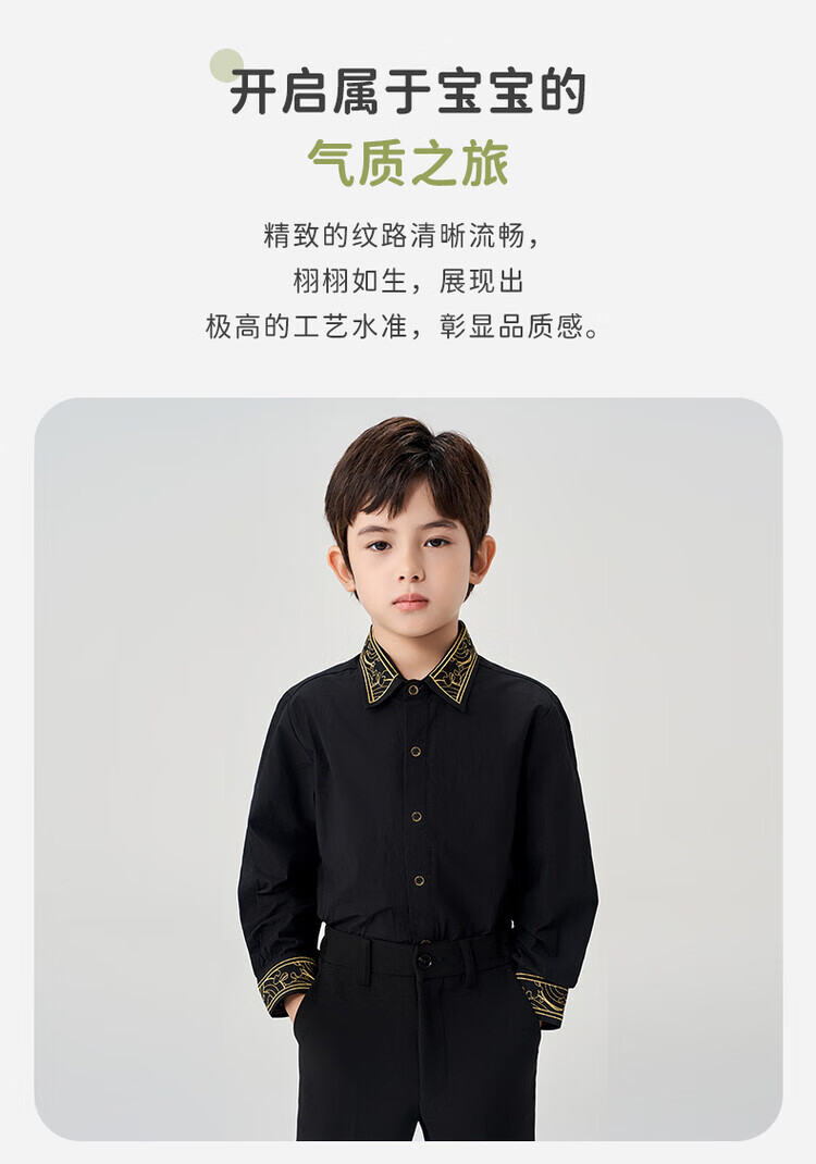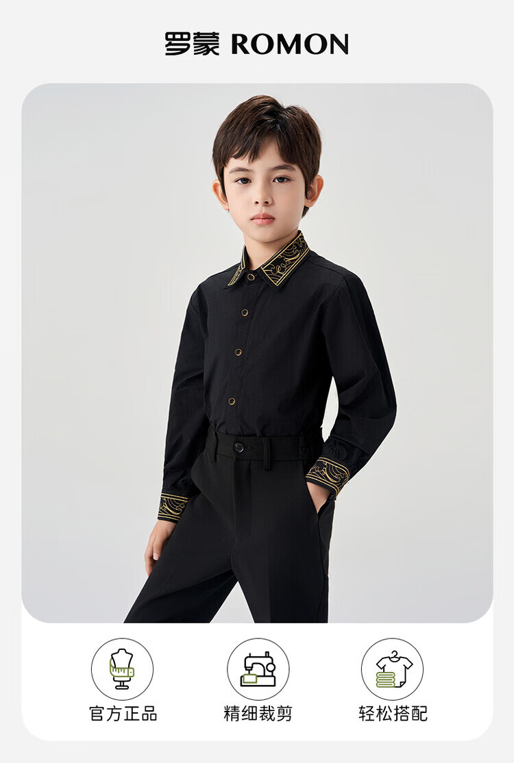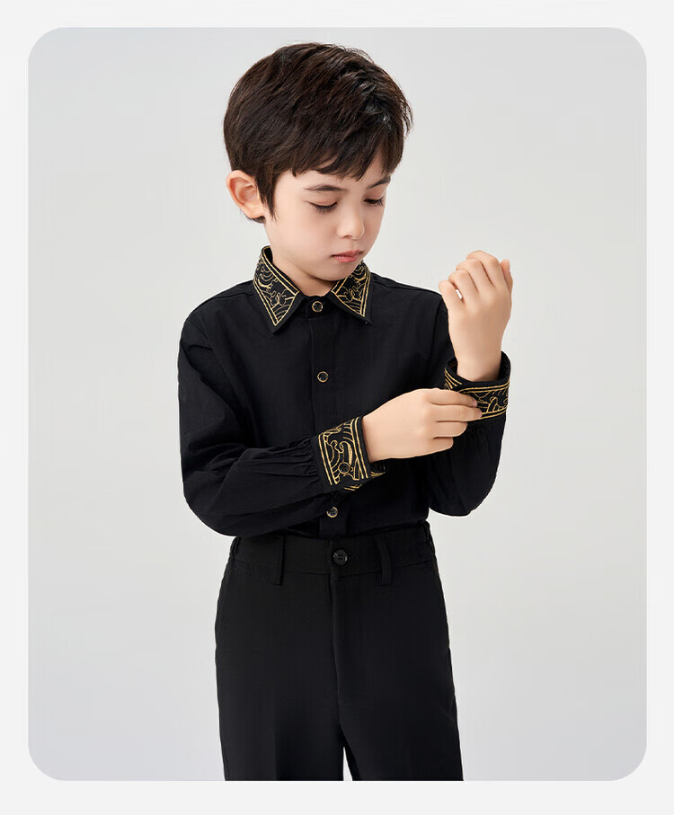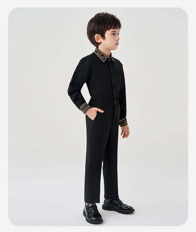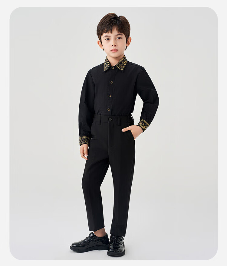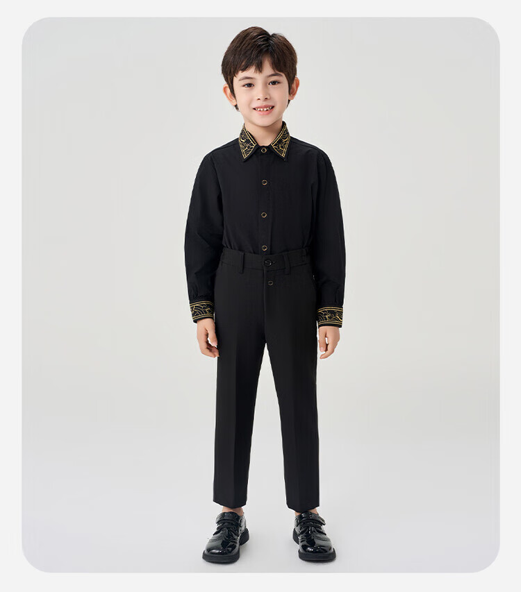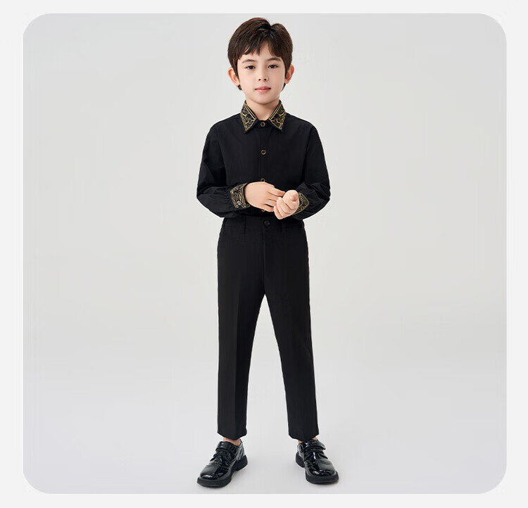 Luo Meng children's black shirt and black trousers boys' performance clothing chorus suit summer embroidered black shirt and trousers two-piece set long-sleeved embroidered black shirt + black trousers 130 cm