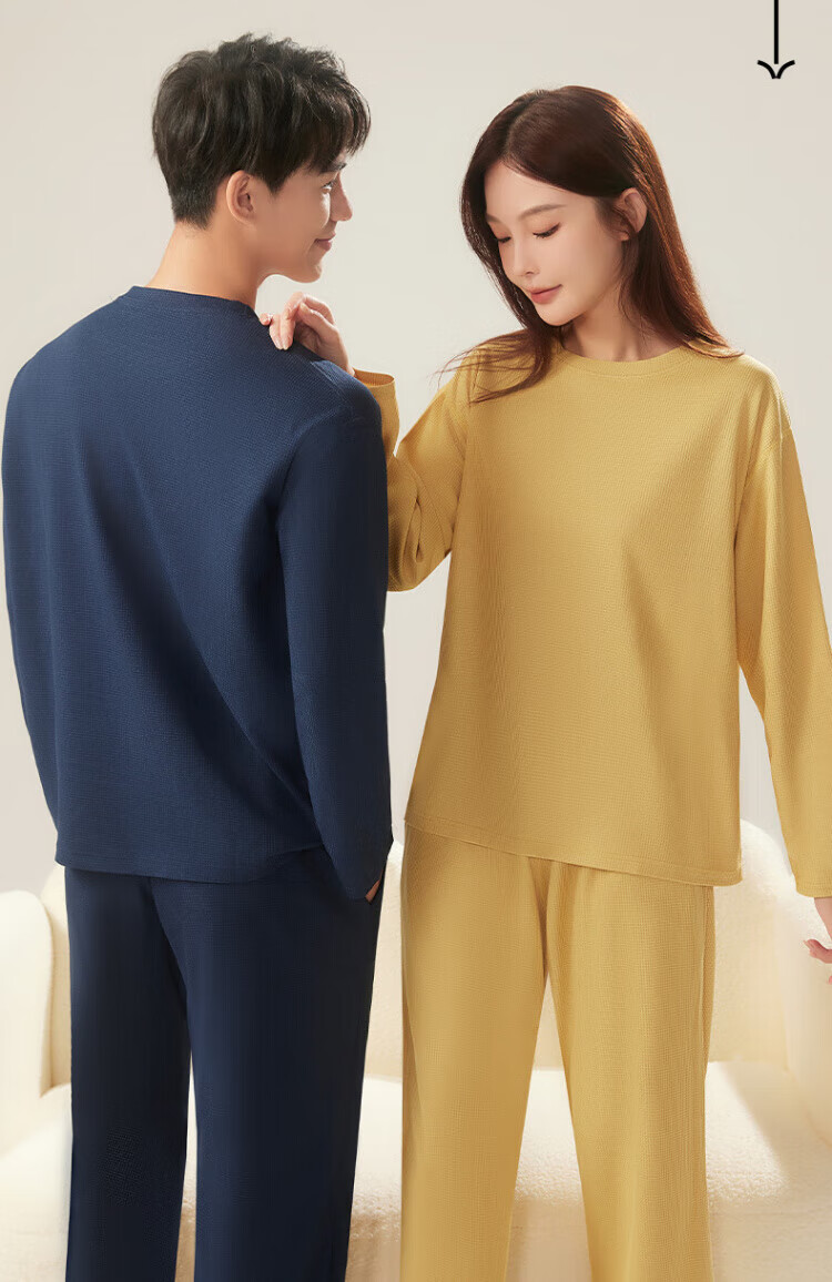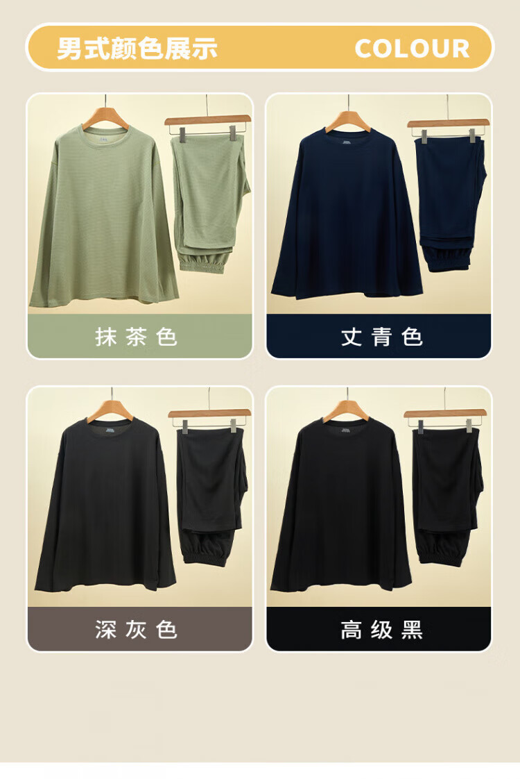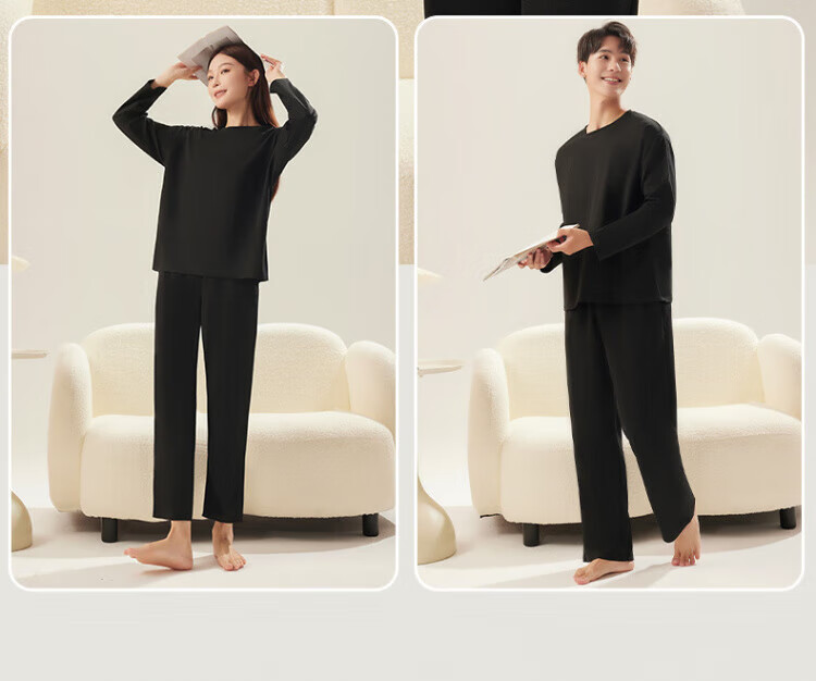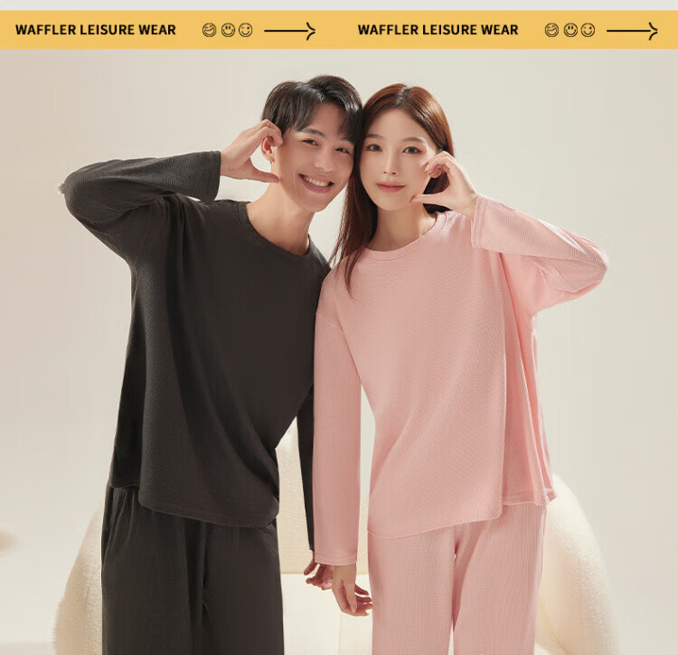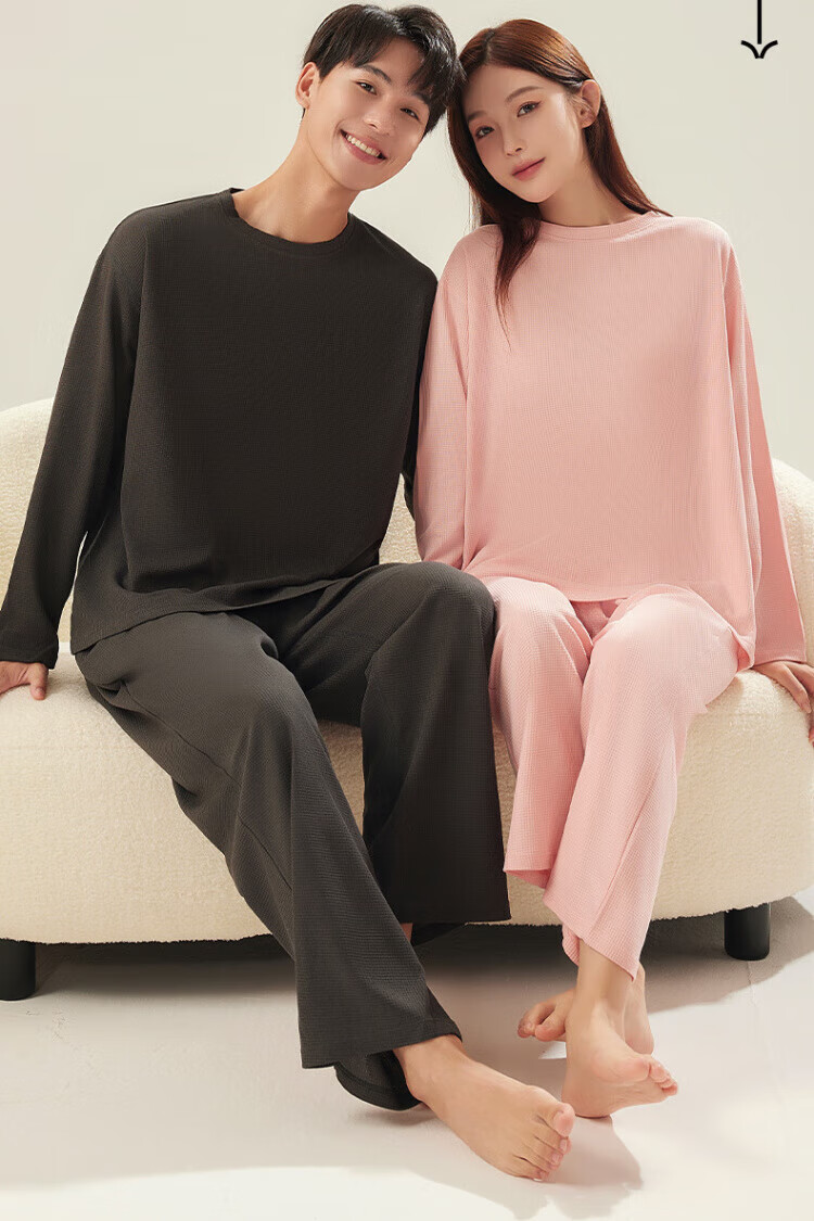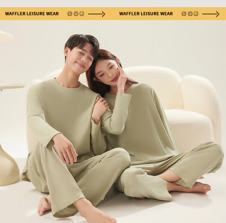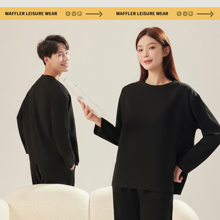 MiiOW New Couple Pajamas for Men and Women Spring and Autumn Waffle Long Sleeve Round Neck Pullover Solid Color Wearable Outerwear Home Clothing Set Black - Male L