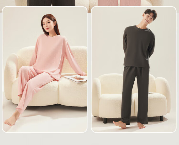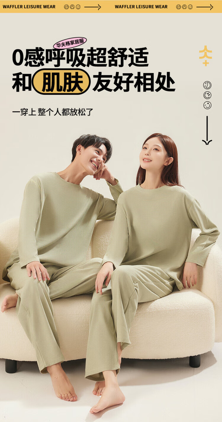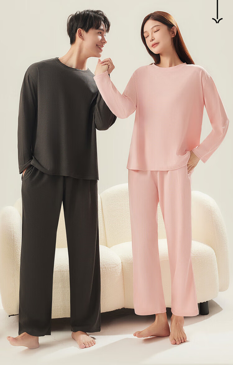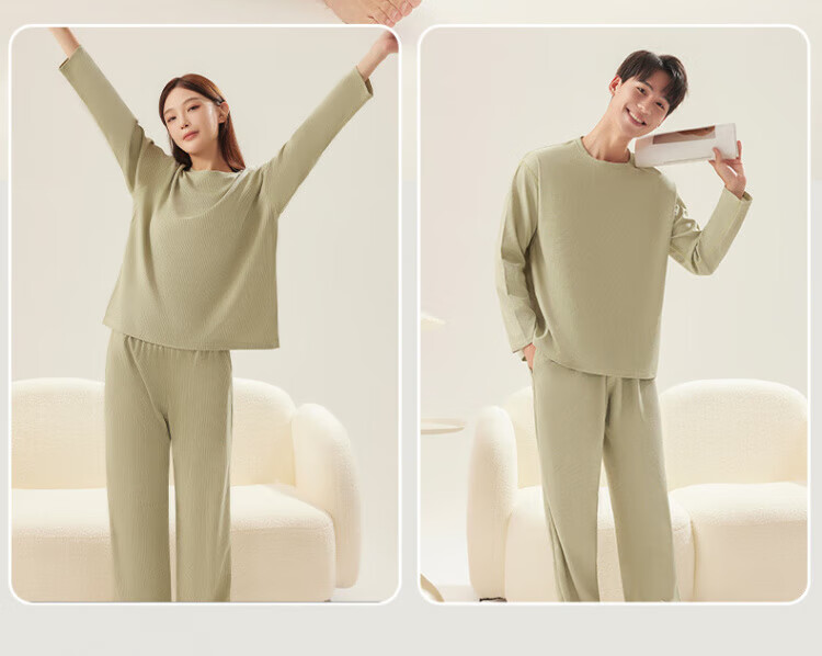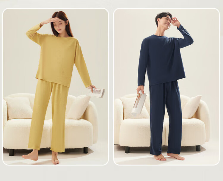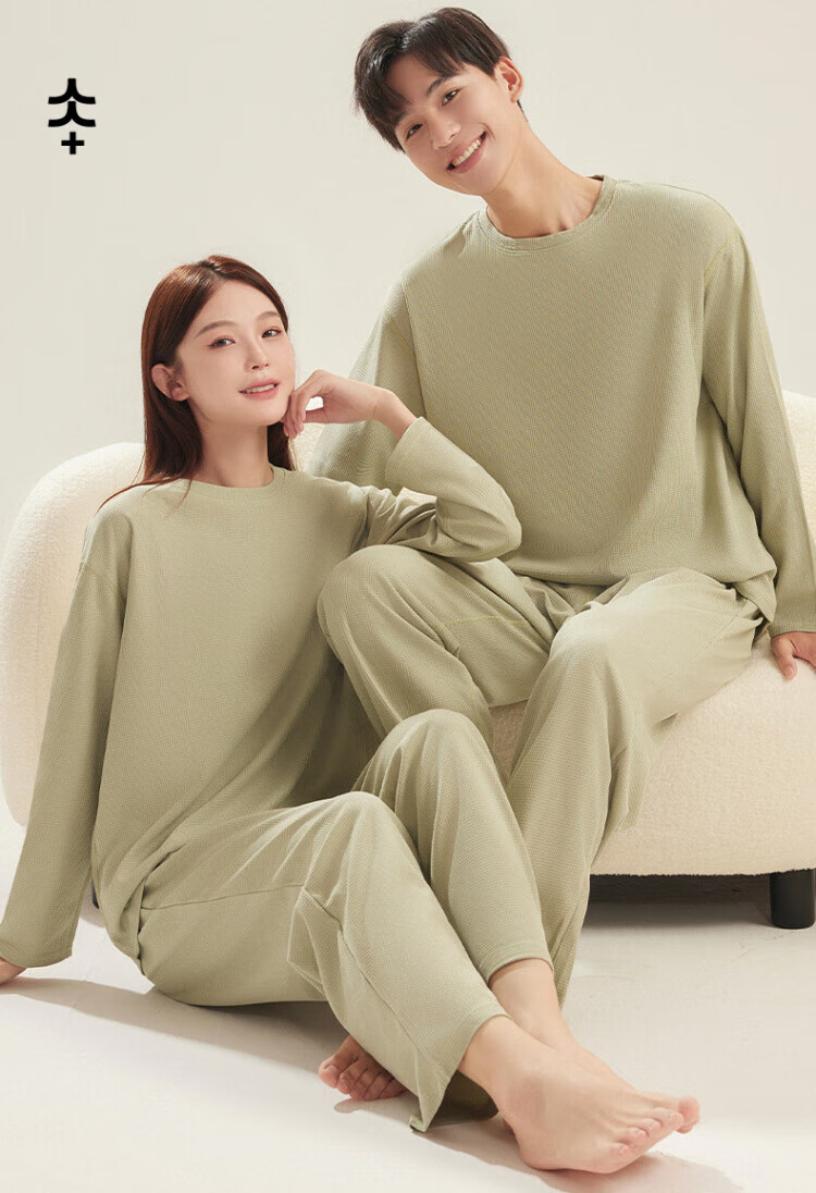 MiiOW New Couple Pajamas for Men and Women Spring and Autumn Waffle Long Sleeve Round Neck Pullover Solid Color Wearable Outerwear Home Clothing Set Black - Male L