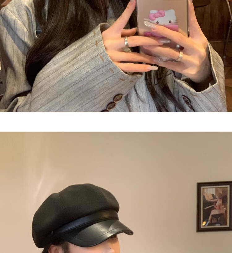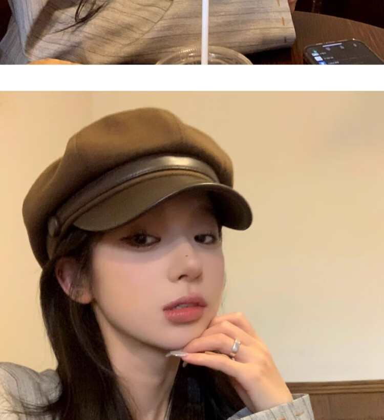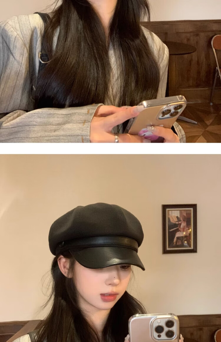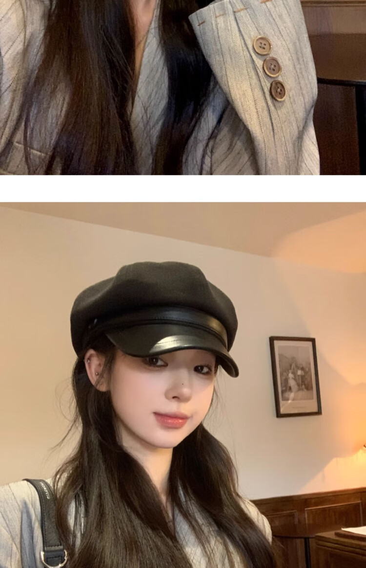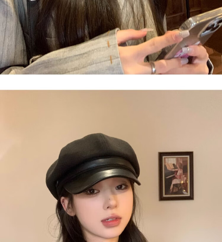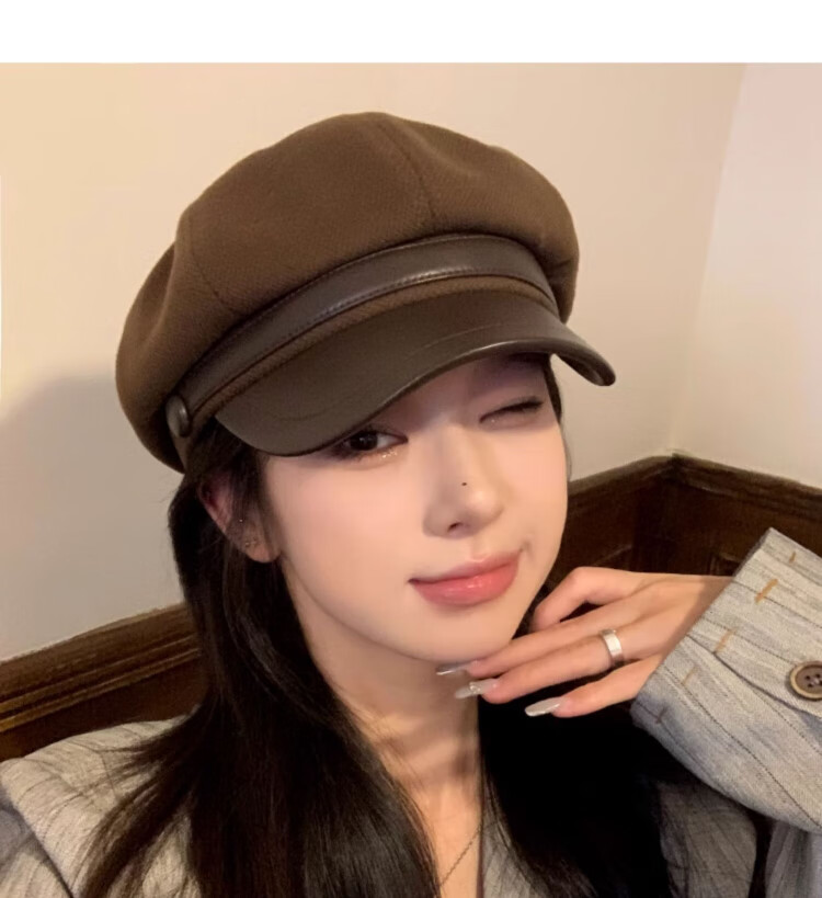 Duokeyu beret hat women's octagonal hat newsboy hat fashionable style big head circumference 2025 new autumn and winter high-looking woolen leather retro beret black