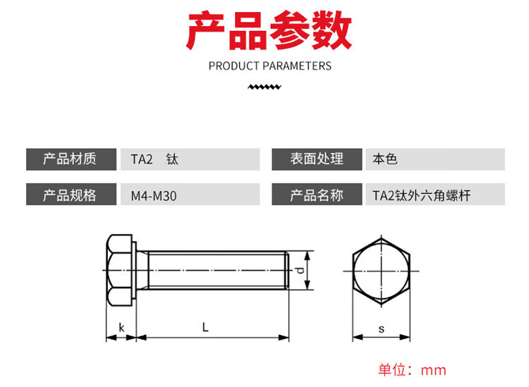 Chengyang TA2 pure titanium external hexagonal screw bolt screw screw M5M6*8/10/15/20/25/30/35/40-120 M66510 pcs