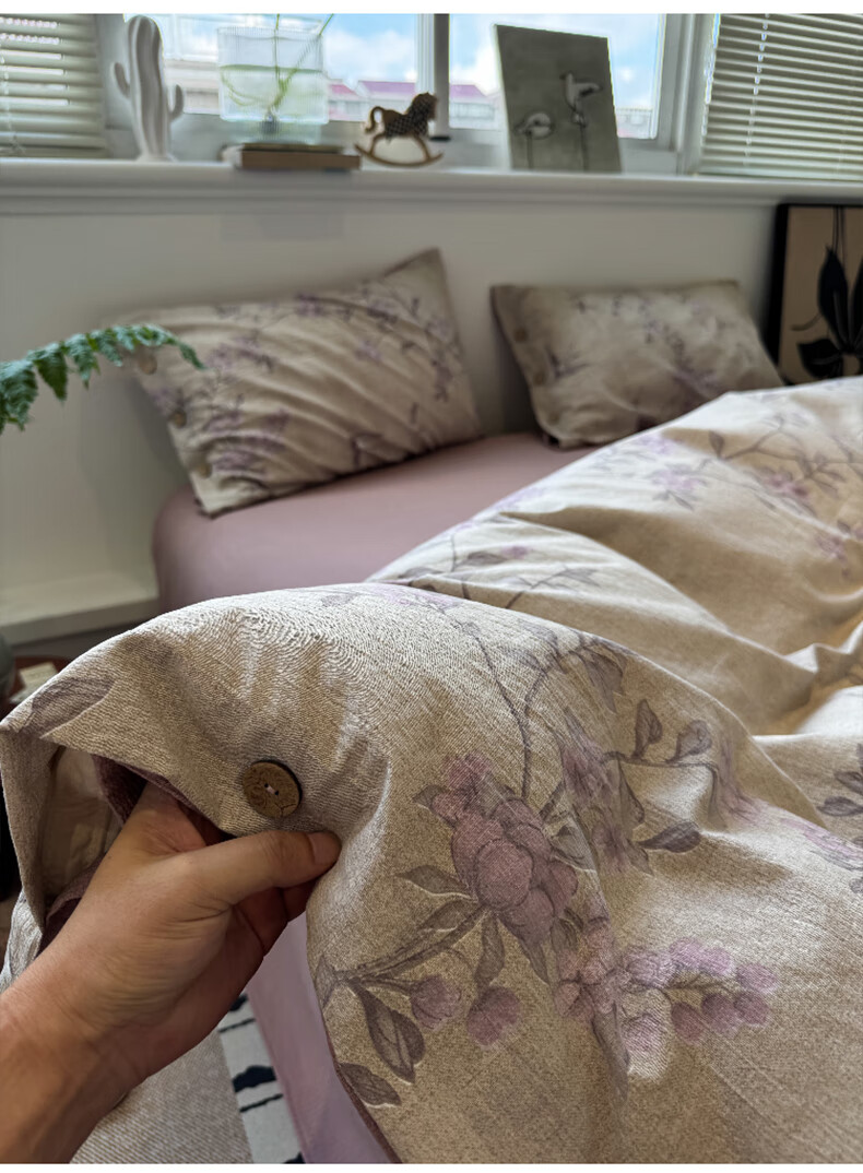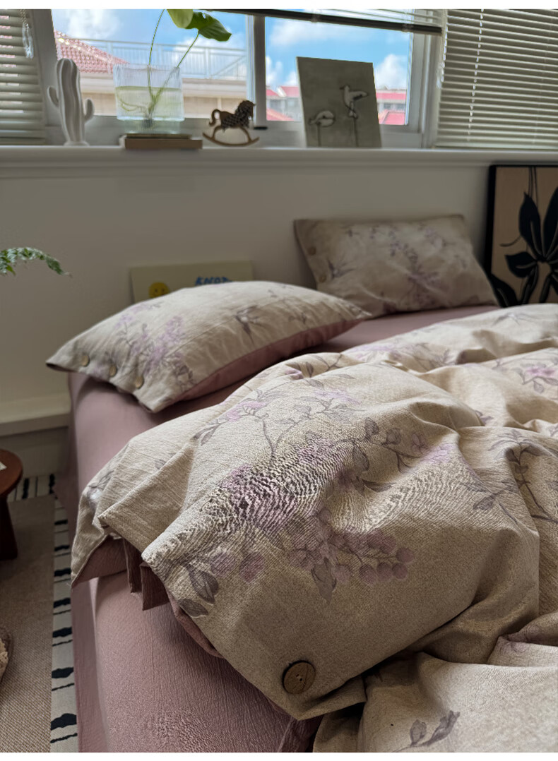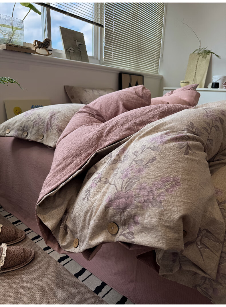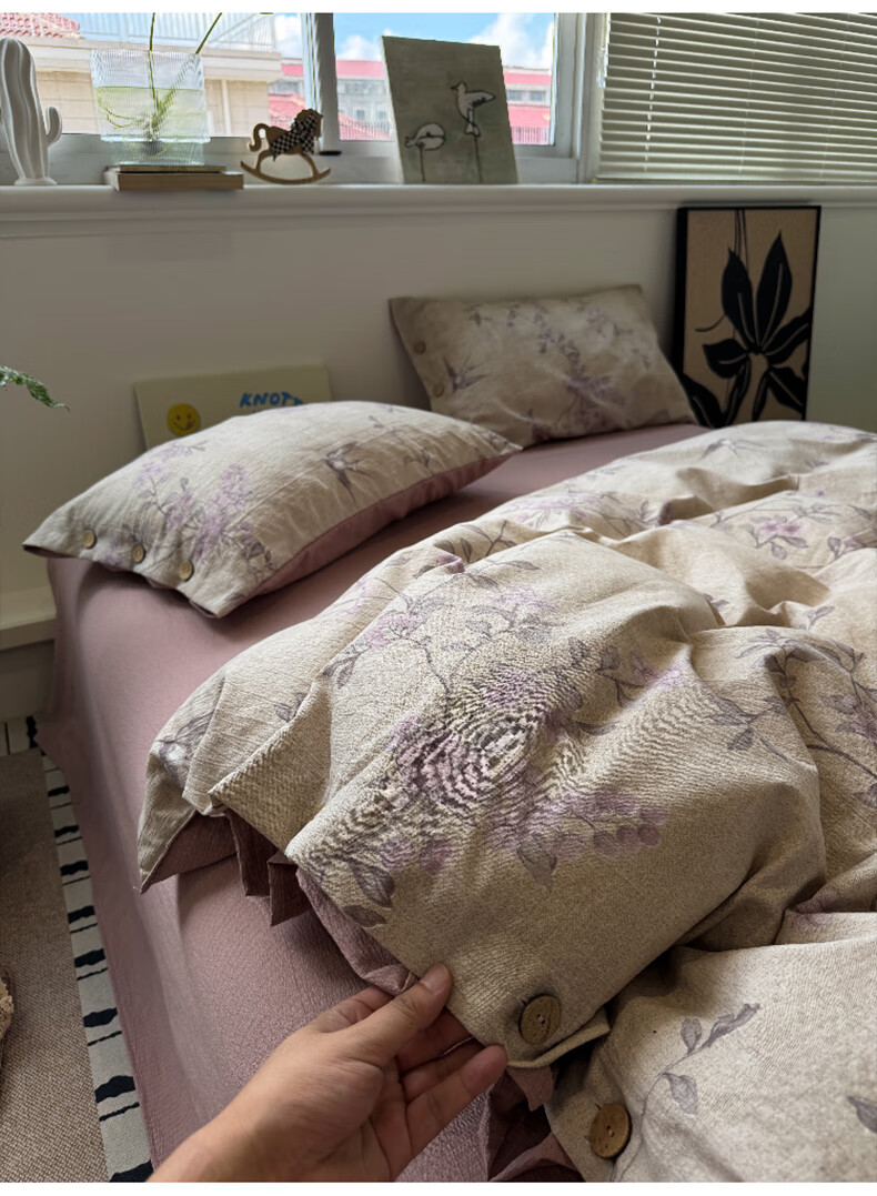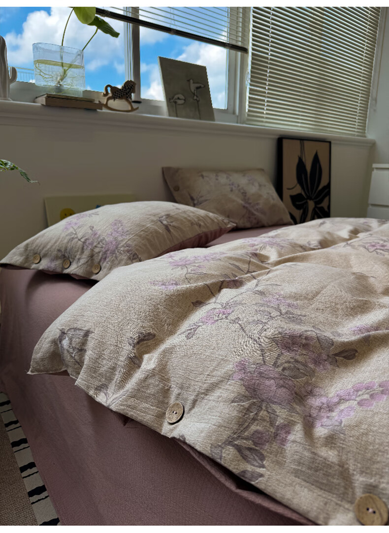 Autumn and winter thickened American retro style original linen retro button style bed four-piece set 2025 new bed sheet and quilt cover Original linen retro-midsummer 1.8m fitted sheet four-piece quilt cover 200x230