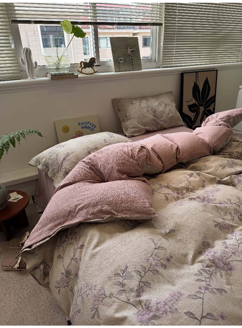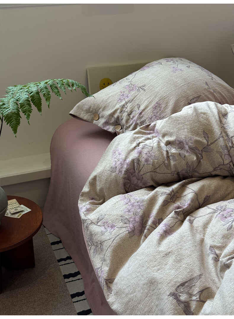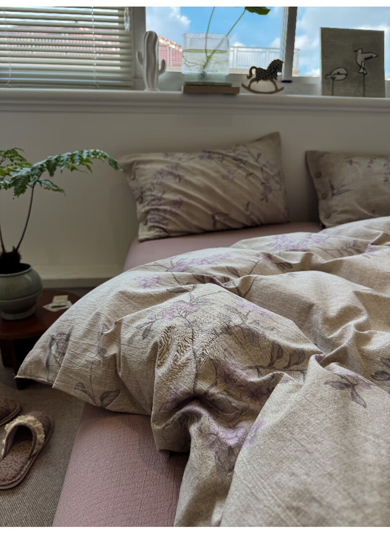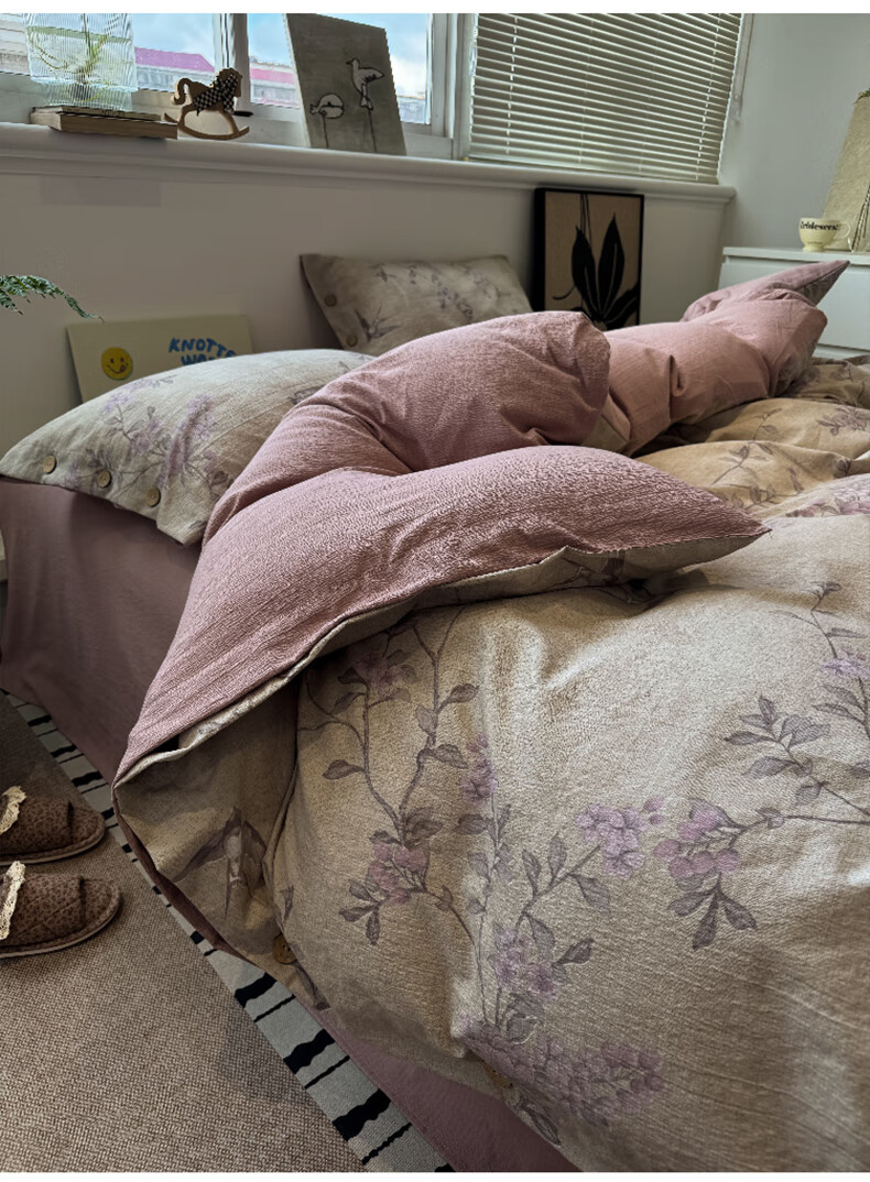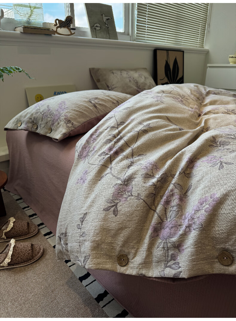 Autumn and winter thickened American retro style original linen retro button style bed four-piece set 2025 new bed sheet and quilt cover Original linen retro-midsummer 1.8m fitted sheet four-piece quilt cover 200x230