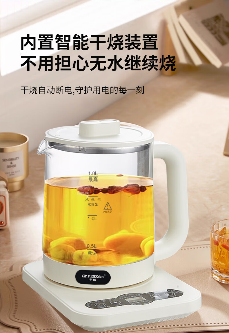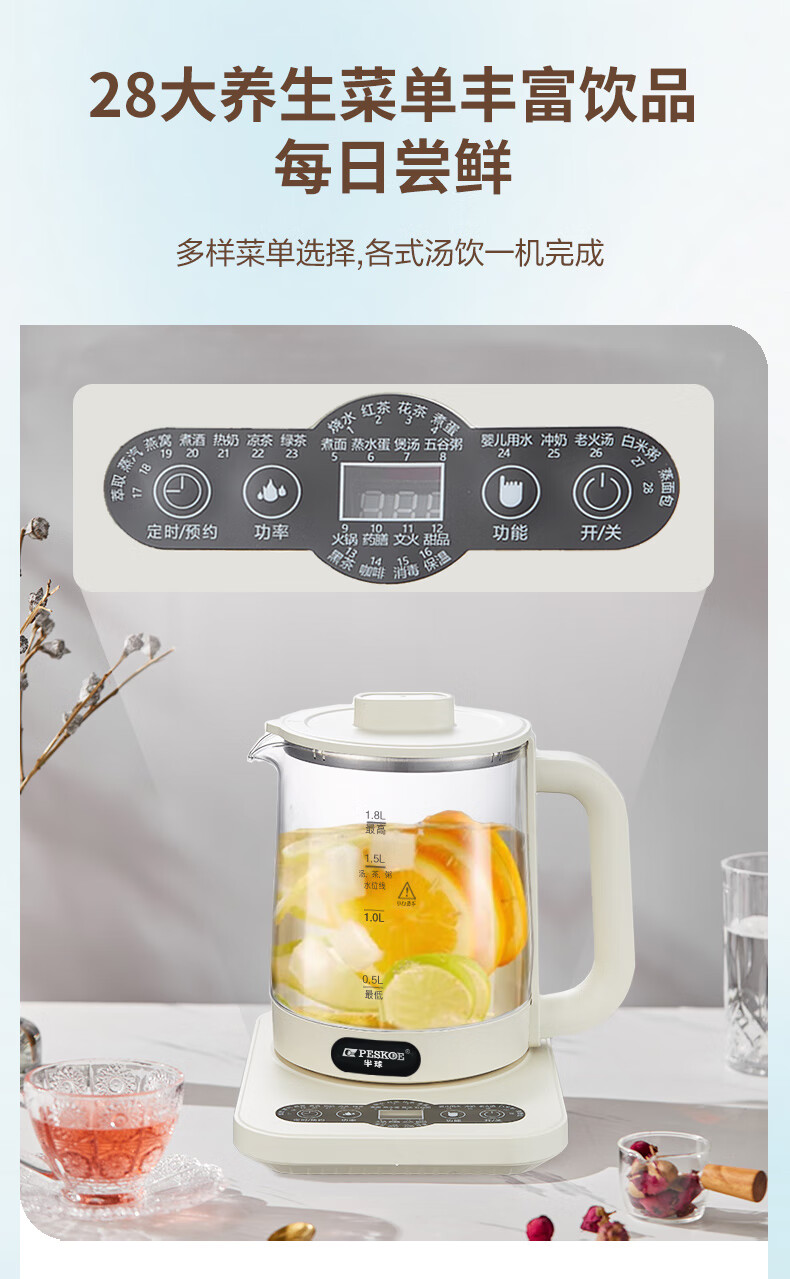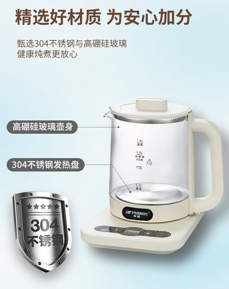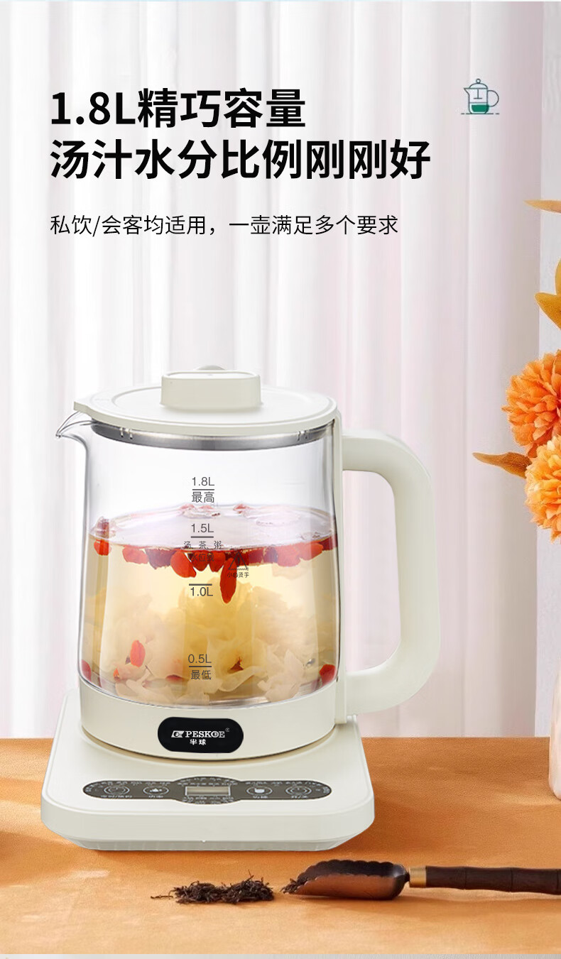 Hemisphere (PESKOE) health pot, tea boiler, multi-function kettle, intelligent constant temperature electric kettle, electric kettle for tea kettle, multi-stage thermal insulation mini glass flower teapot, high cost performance (304 heating plate + high borosilicate kettle body) 1.8L
