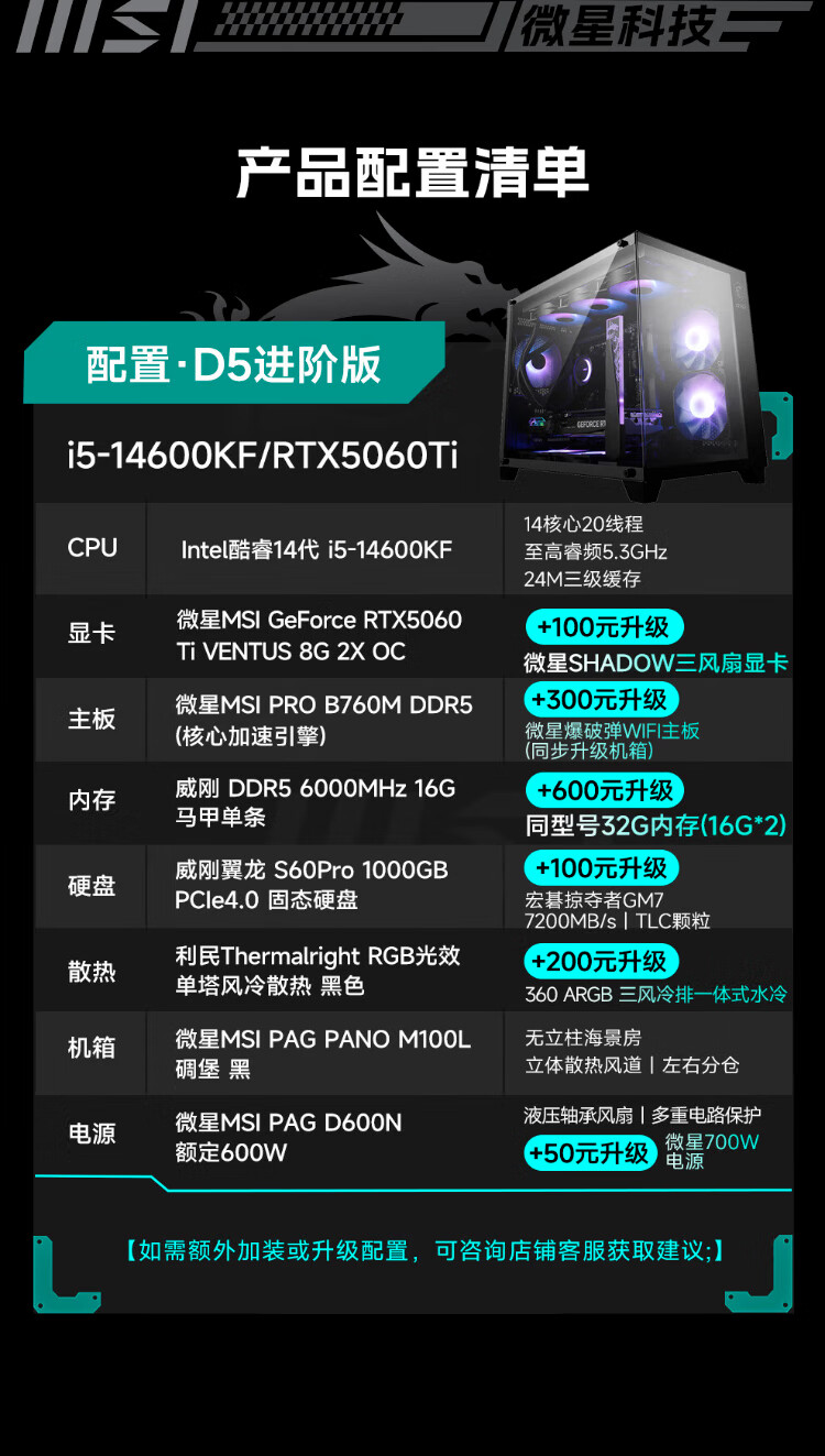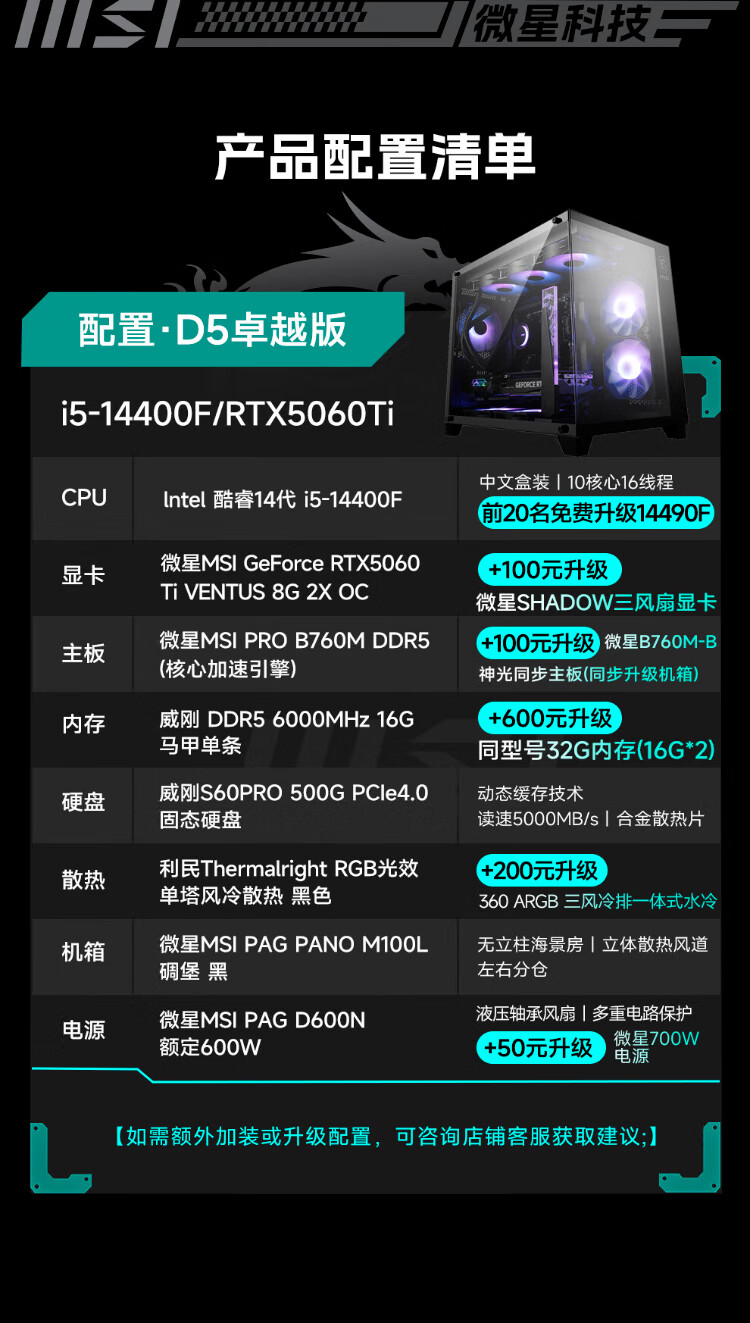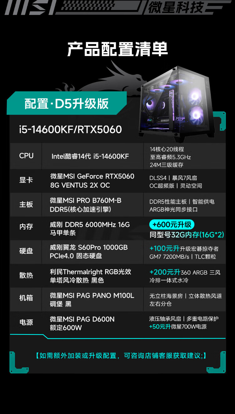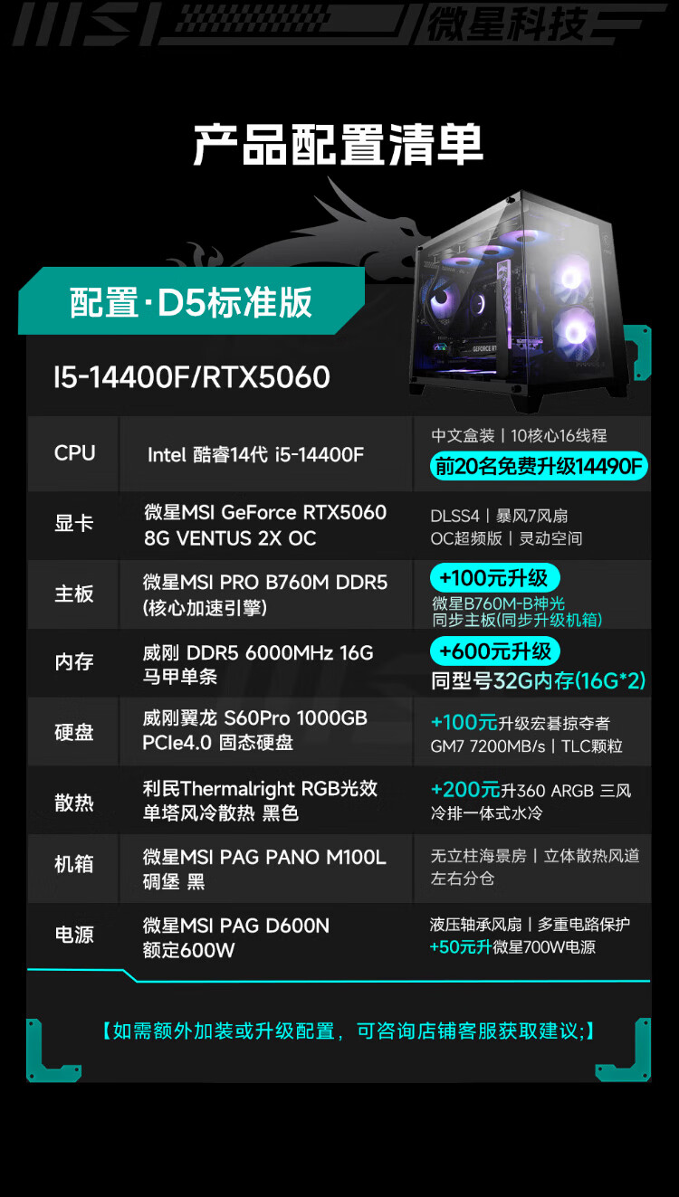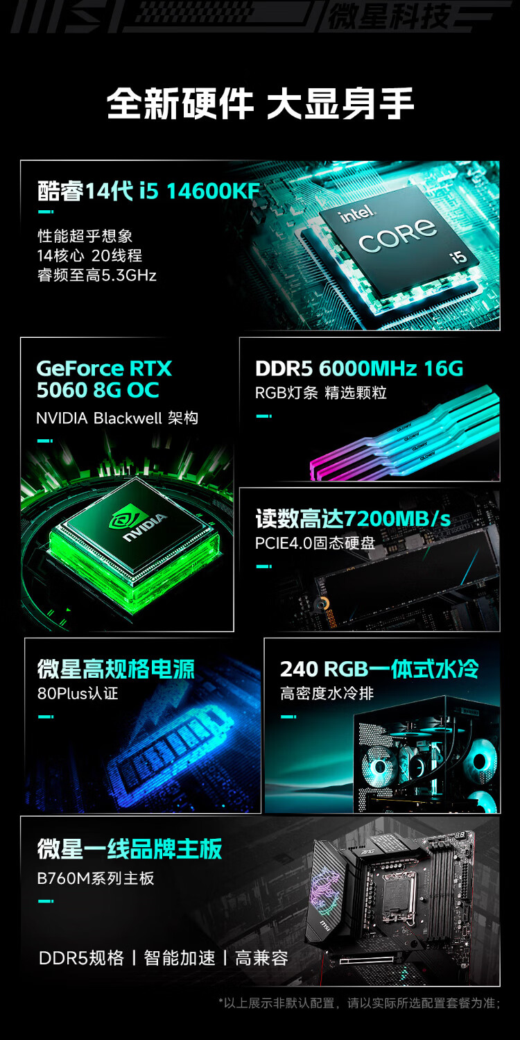 MSI Core Ultra7/i5-14490F/14600KF with 5060/5060Ti e-sports game machine RGB sea view room desktop DIY computer for the whole family D5 upgraded version丨i5-14600KF+RTX5060