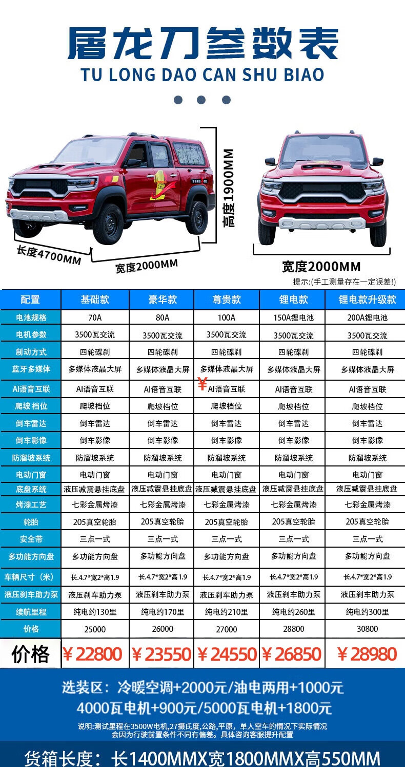 Yiduo's new electric pickup truck Laotou Le gas-electric dual-purpose large load-bearing low-speed new energy vehicle truck lithium battery model-60V150A