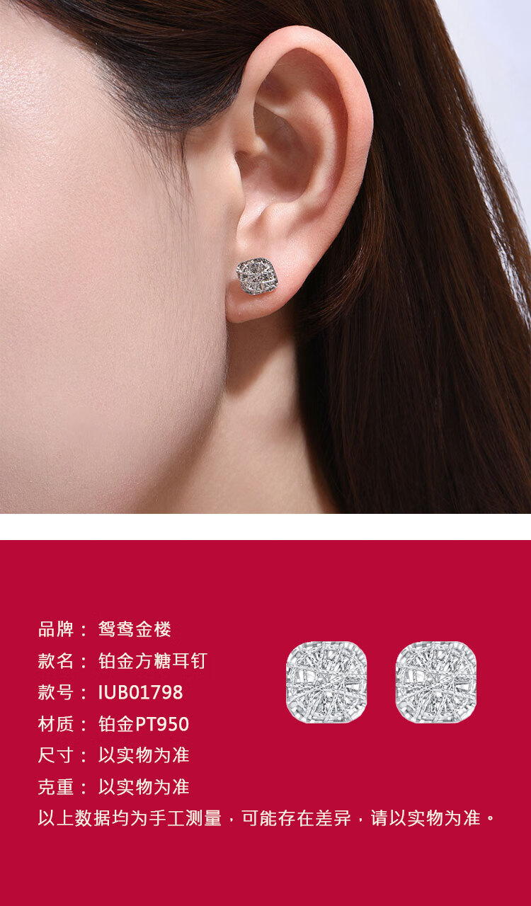 Yuanyang Jinlou PT950 platinum small sugar cube earrings platinum fashion earrings earrings holiday birthday gift for girlfriend and wife about 2.5g